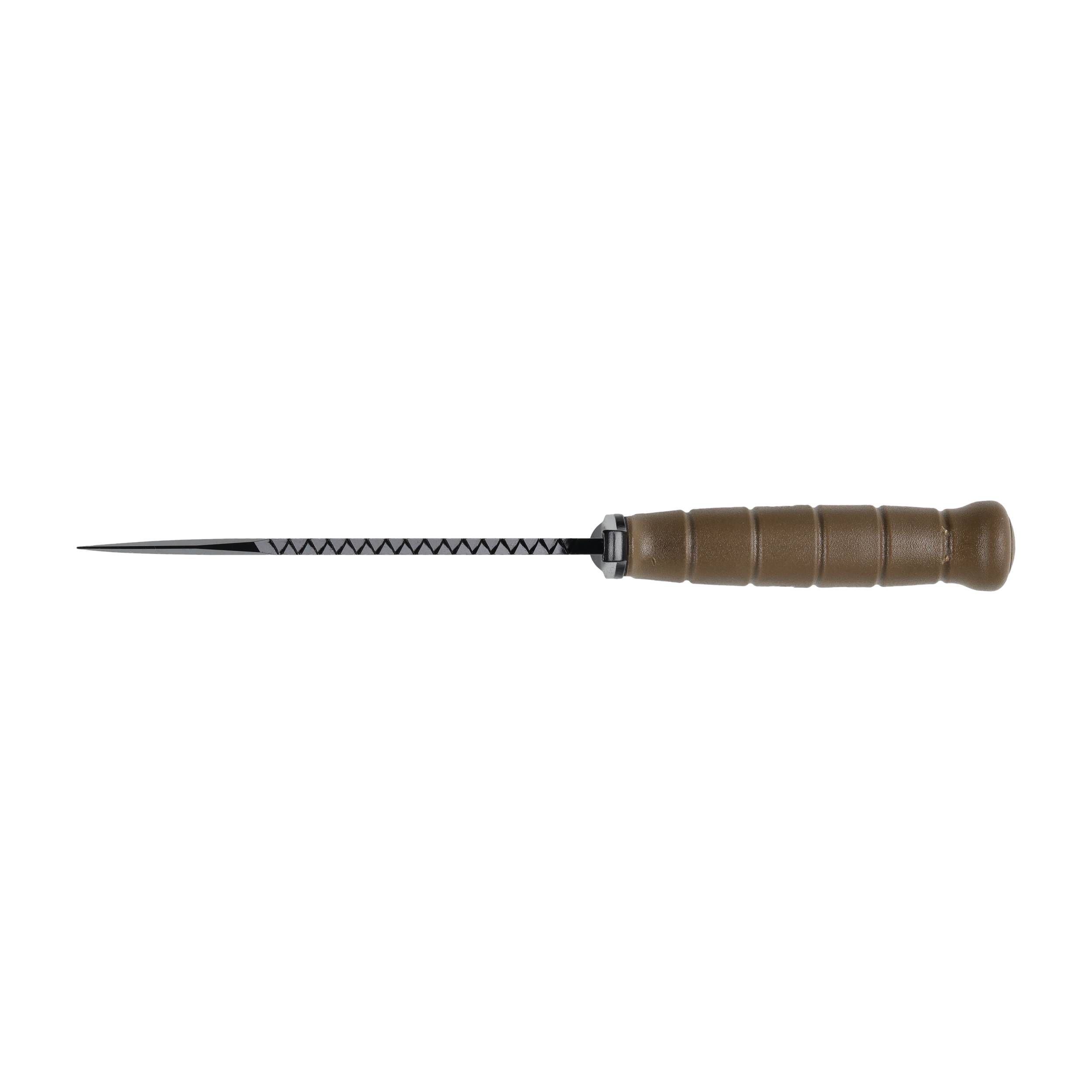Nóż ma konstrukcję hidden-tang, która łączy wytrzymałość, lekkość i komfort użytkowania. Wąska klinga o profilu clip-point powstała ze stali sprężynowej hartowanej do ok. 55 HRC. Słabszą retencję (zdolność do zachowania ostrości) doskonale kompensuje łatwość ostrzenia, dzięki czemu ostrze możemy podostrzyć w terenie za pomocą zwykłej ostrzałki kieszonkowej. Na całą powierzchnię głowni naniesiono powłokę fosforanową, która chroni przed korozję oraz zapobiega odbijaniu światła. Na górnej części głowni znajduje się ostrze fałszywe zwiększające penetrację oraz piła z naprzemiennie rozmieszczonymi zębami, które doskonale radzą sobie z cięciem drewna, kości, lin, oraz tworzyw sztucznych.