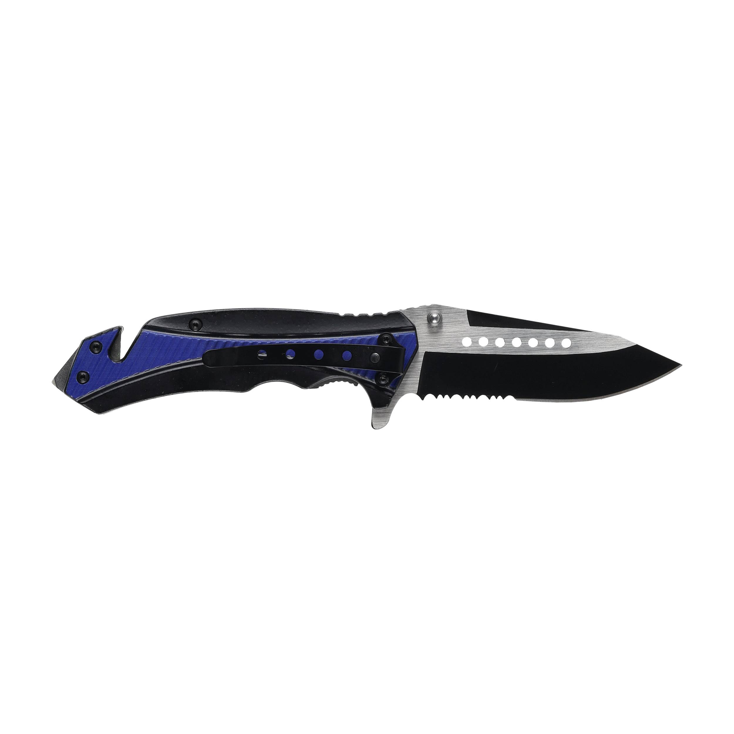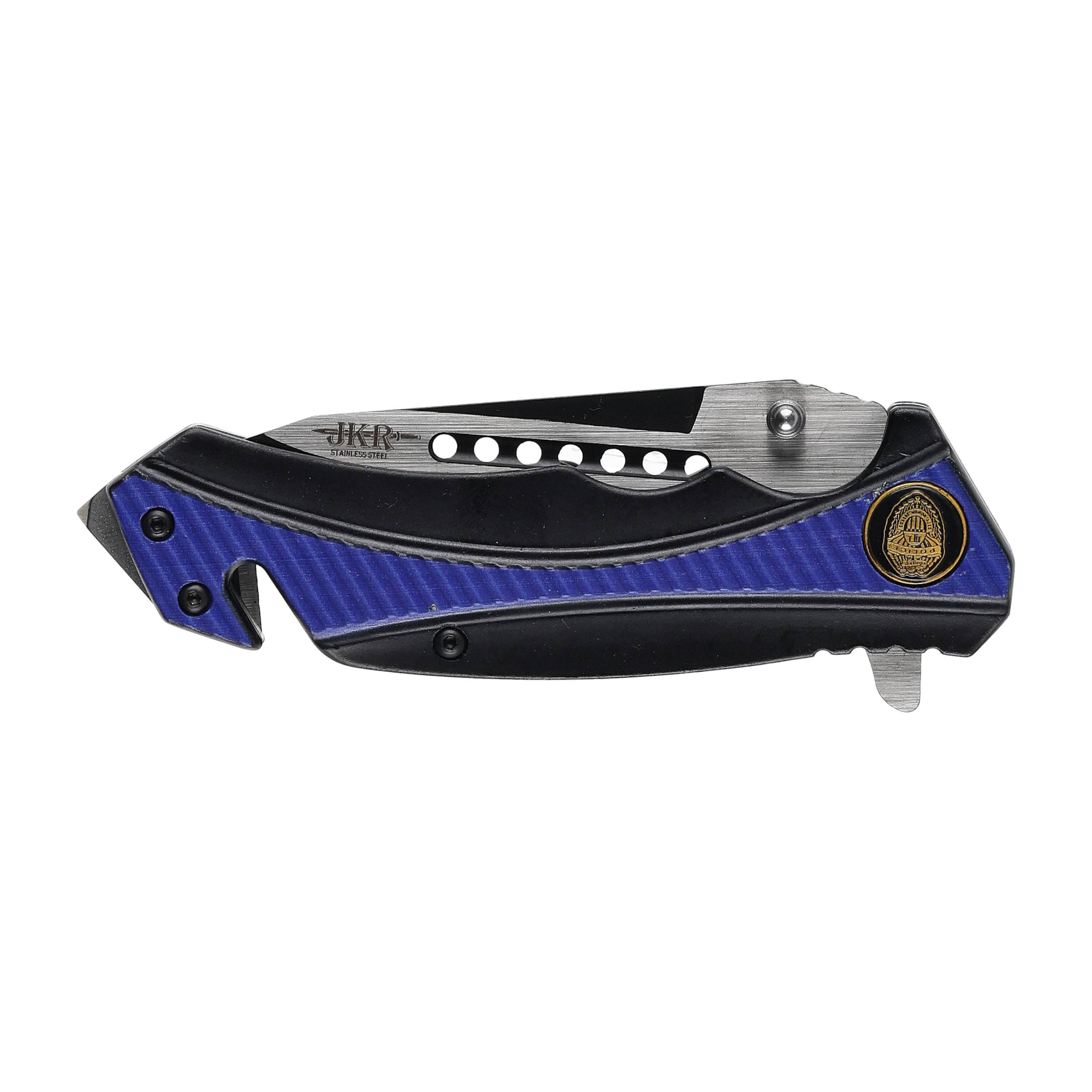 Nóż składany Joker JKR563 to narzędzie solidne i poręczne. Folder ma charakter noża ratowniczego. Wskazuje na to nie tylko niebieska rękojeść oraz umieszczony na symbol funkcjonariuszy policji, ale przede wszystkim dodatkowe ostrze do cięcia pasów oraz zbijak do szyb.