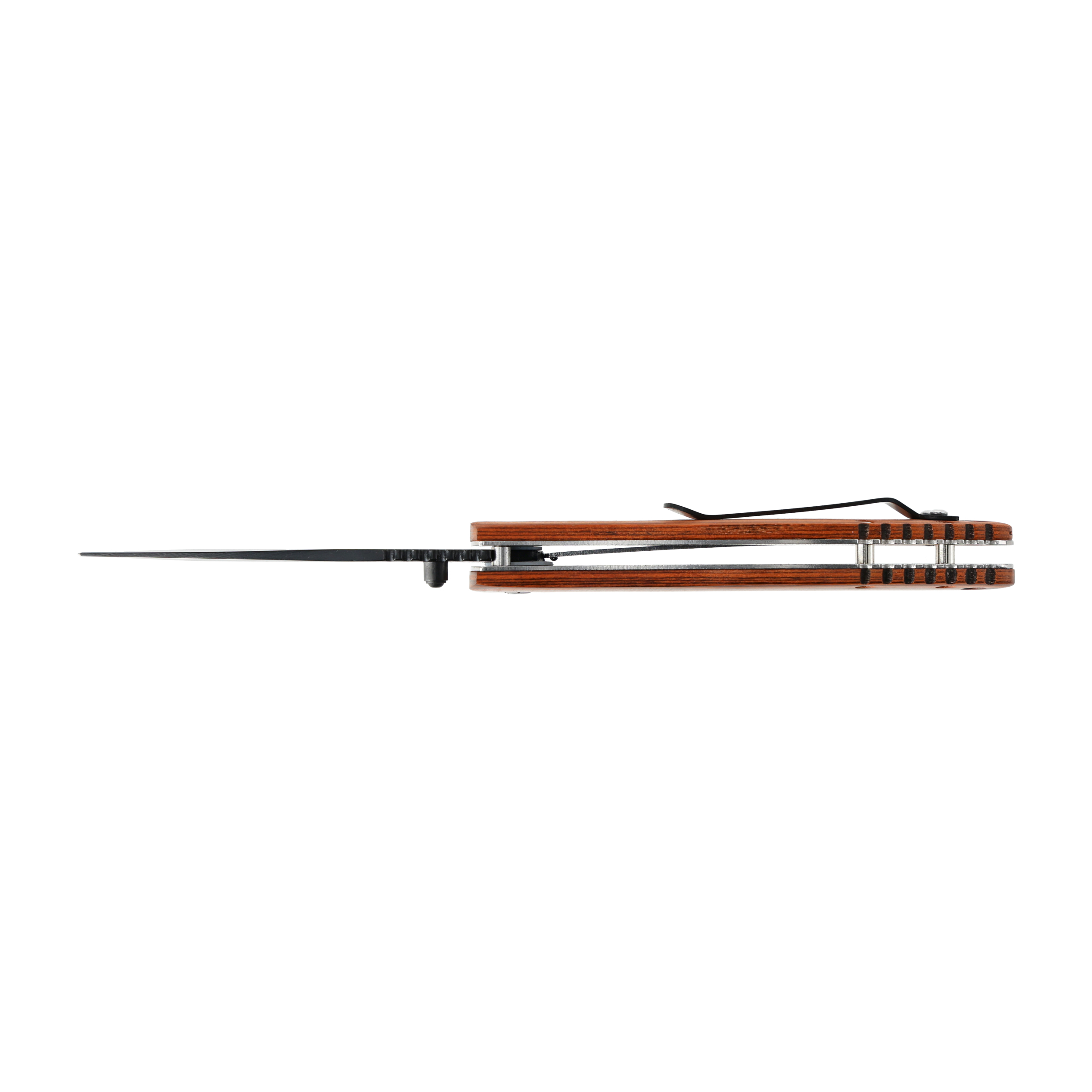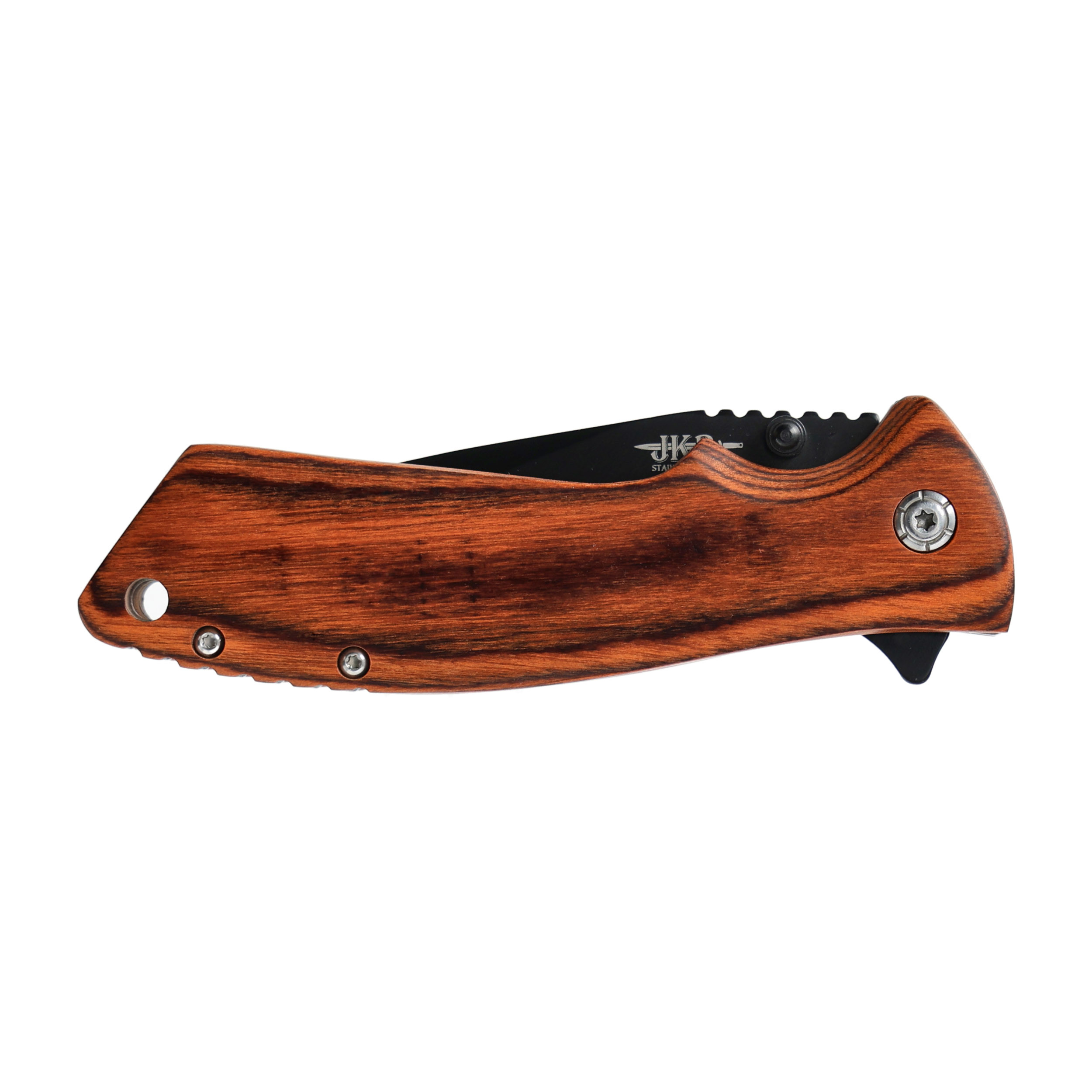 W nożu użyto okładzin z drewna pakkawood. Charakteryzują się one wysoką wytrzymałością oraz wyraźnymi, wyeksponowanymi słojami, nadając tym samym nożowi ekskluzywnego wyglądu. Odpowiednie wykonanie i konserwacja zapewnia długotrwałe piękno i funkcjonalność okładzin rękojeści.