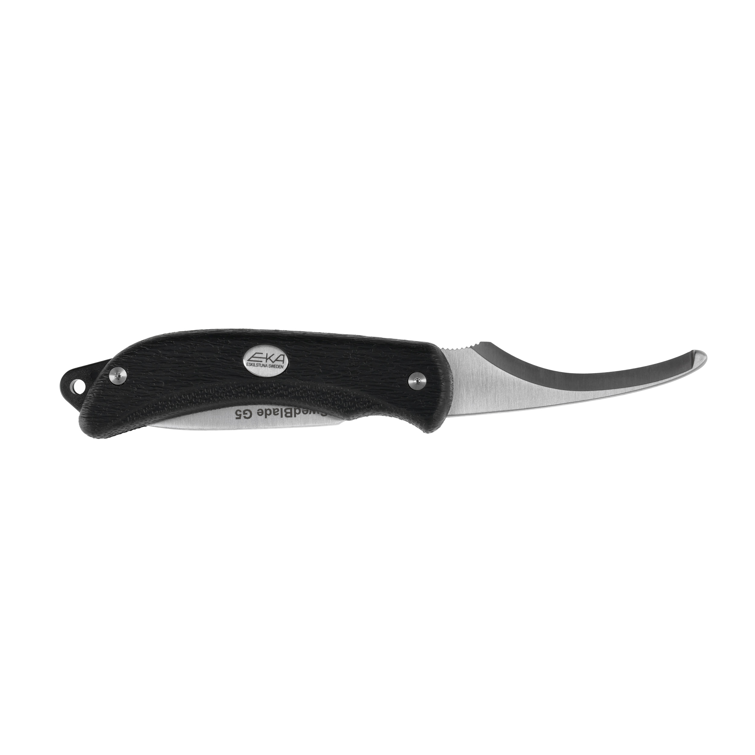 Głównym elementem konstrukcji jest funkcjonalne podwójne ostrze. Pierwsze to klasyczny nóż do cięcia z ulepszoną głownią Drop-point. Drugi z kolei służy do patroszenia ryb oraz pozbywania się łusek. Oba ostrza wykonane są ze stali Sandvik 12C27 o wysokiej twardości 57-59 HRC. Noże EKA cechują się solidnym i ciasnym spasowaniem ze sobą wszystkich elementów.