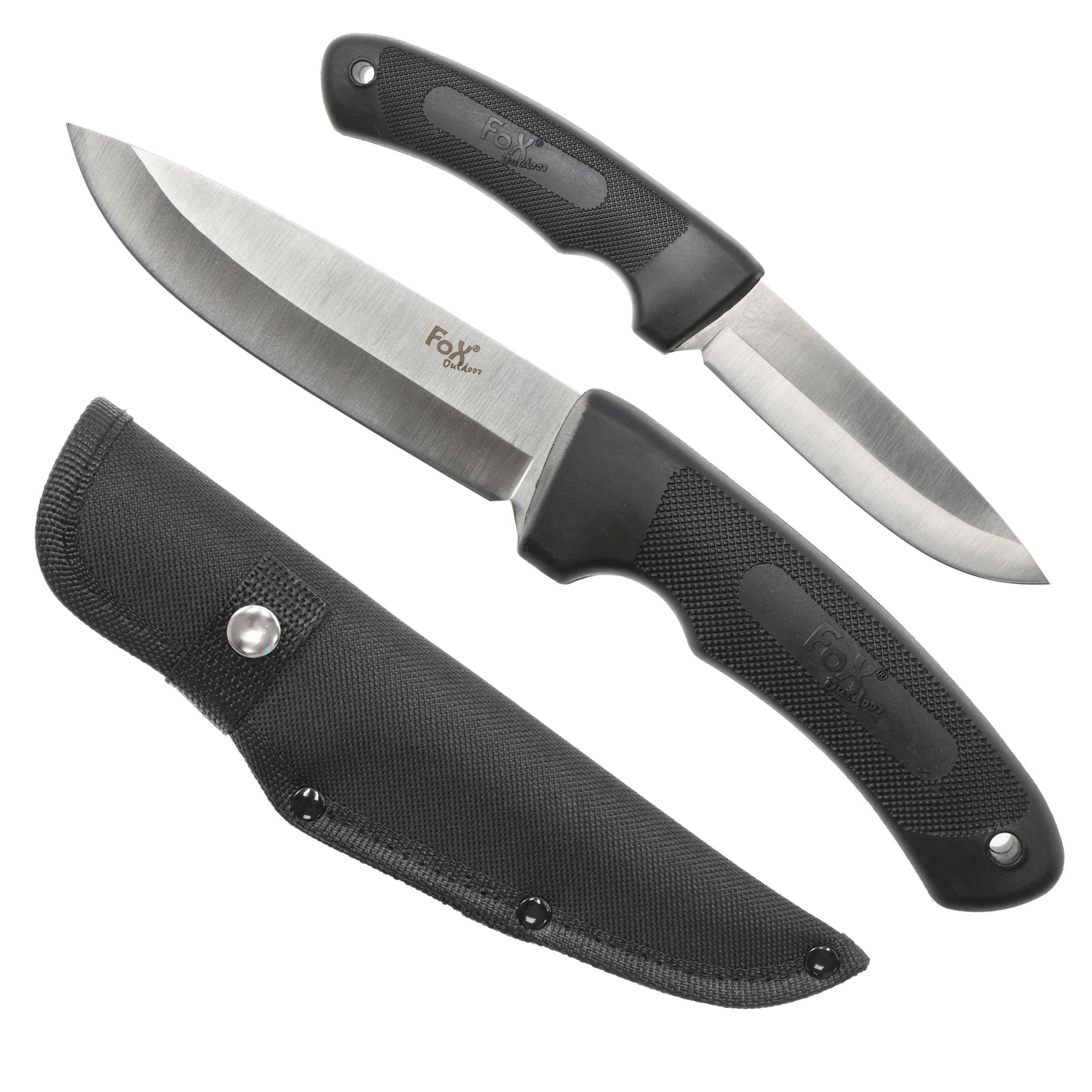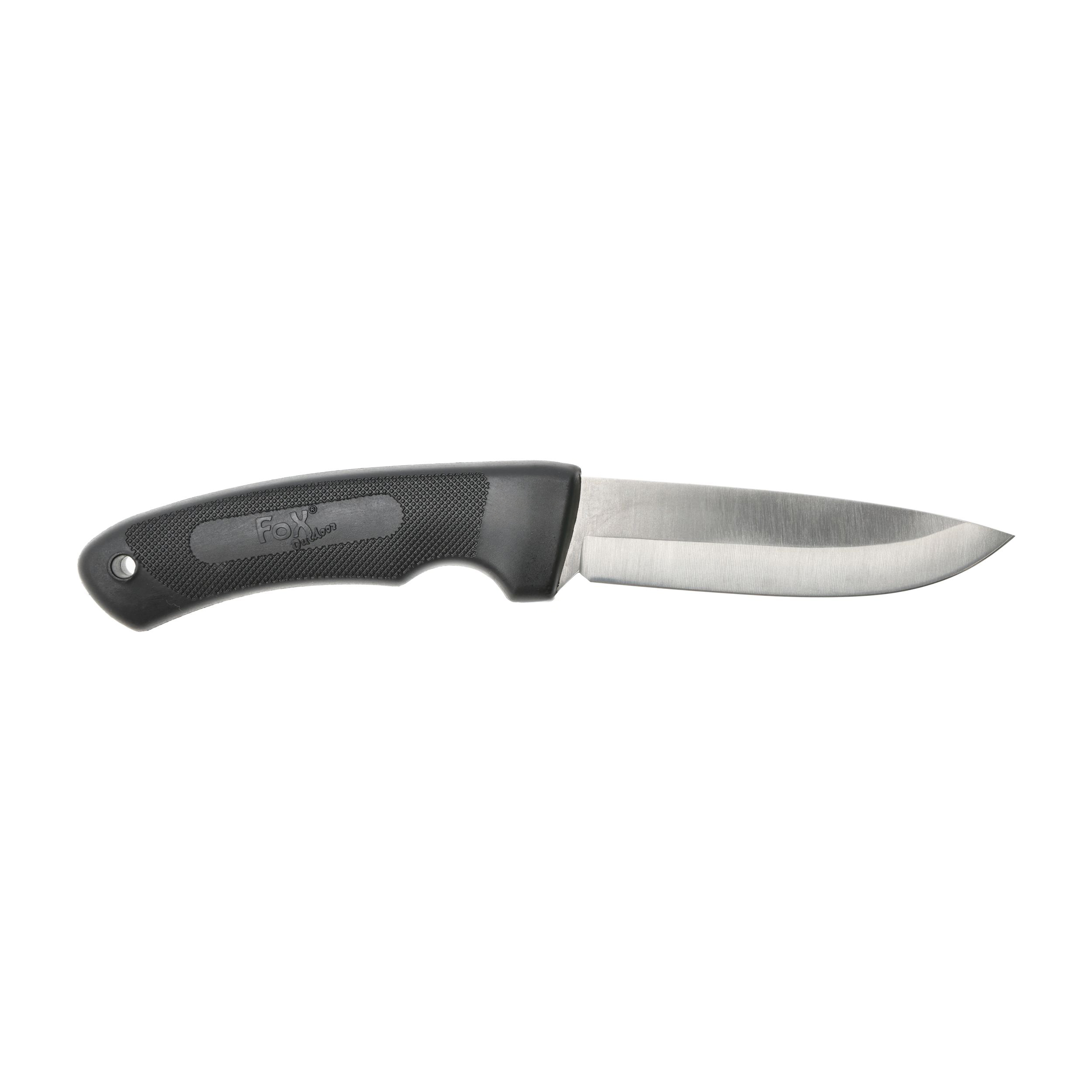 Fox Outdoor Hunter knife to nowoczesny i solidny nóż, stworzony specjalnie do zastosowań myśliwskich. Wyróżnia go głownia Drop Point ze stali nierdzewnej oraz rękojeść z połączenia polimeru i gumy. Rolę jelca pełni specjalne wycięciem pod palec wskazujący. Za pewny chwyt odpowiada agresywne teksturowanie o przeciwpoślizgowych właściwościach.