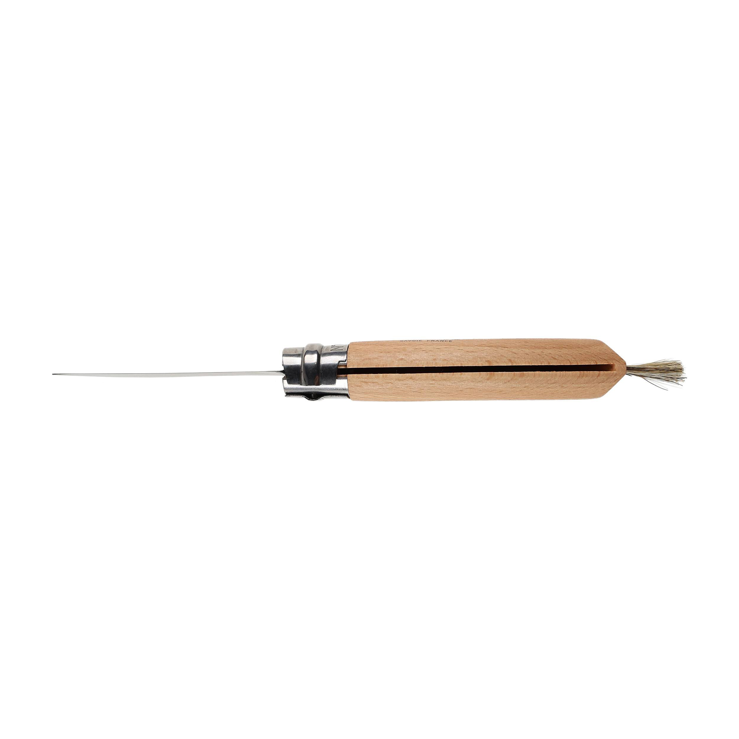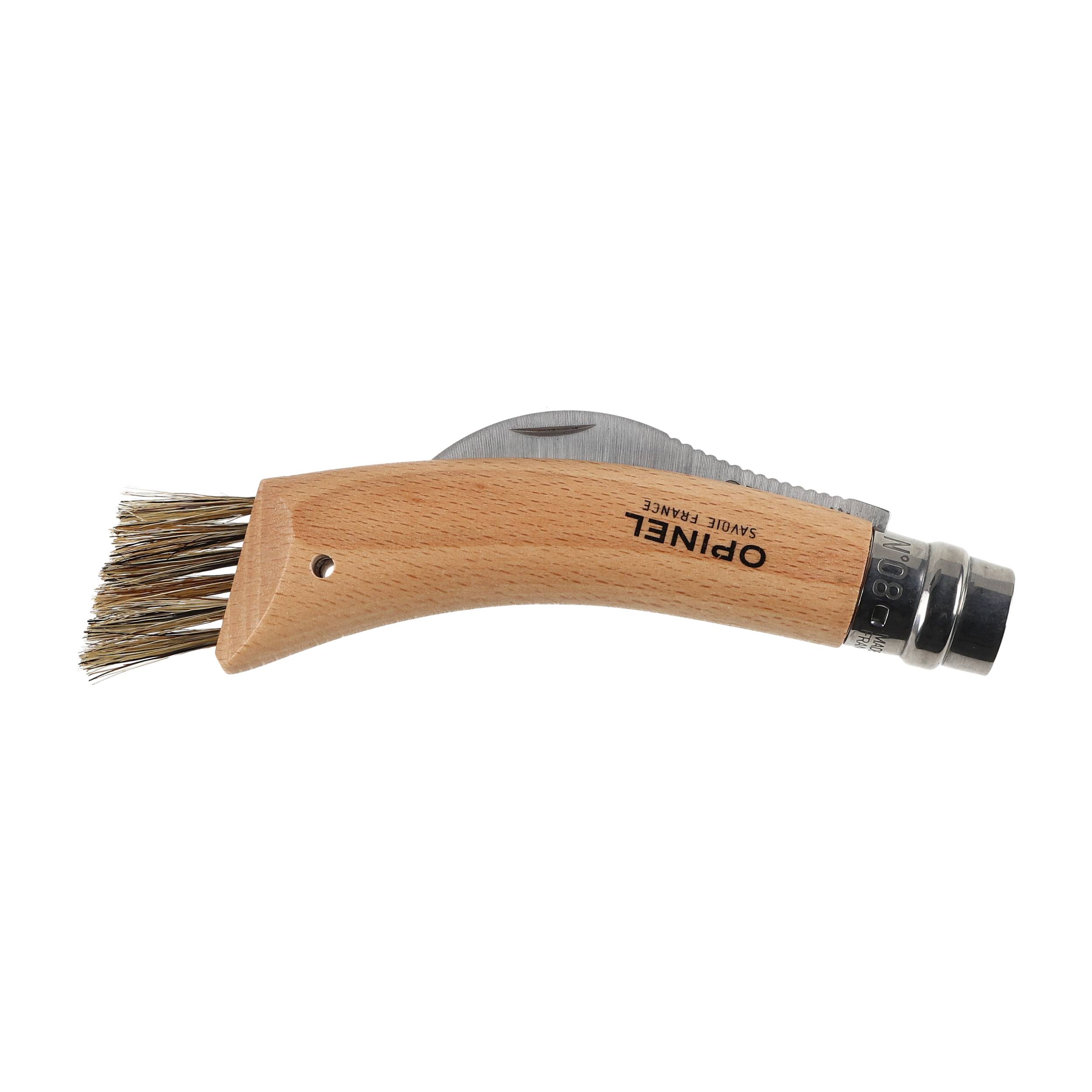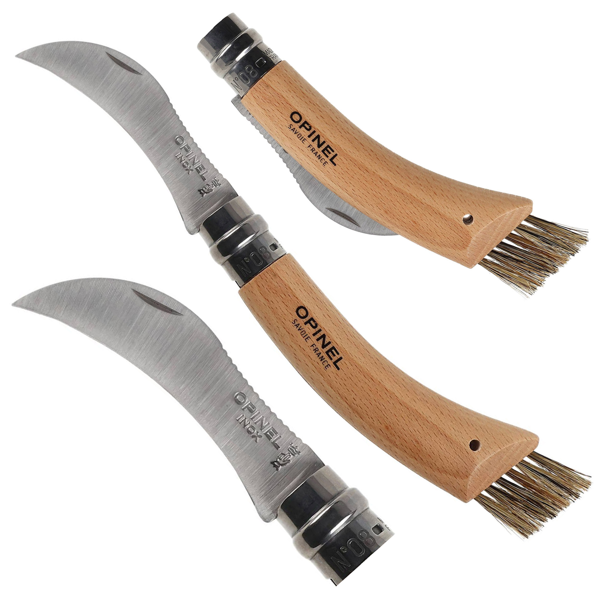 Profesjonalny nóż dla miłośników zbierania grzybów, wyposażony w sierpowate ostrze i pędzelek do oczyszczania grzybów.