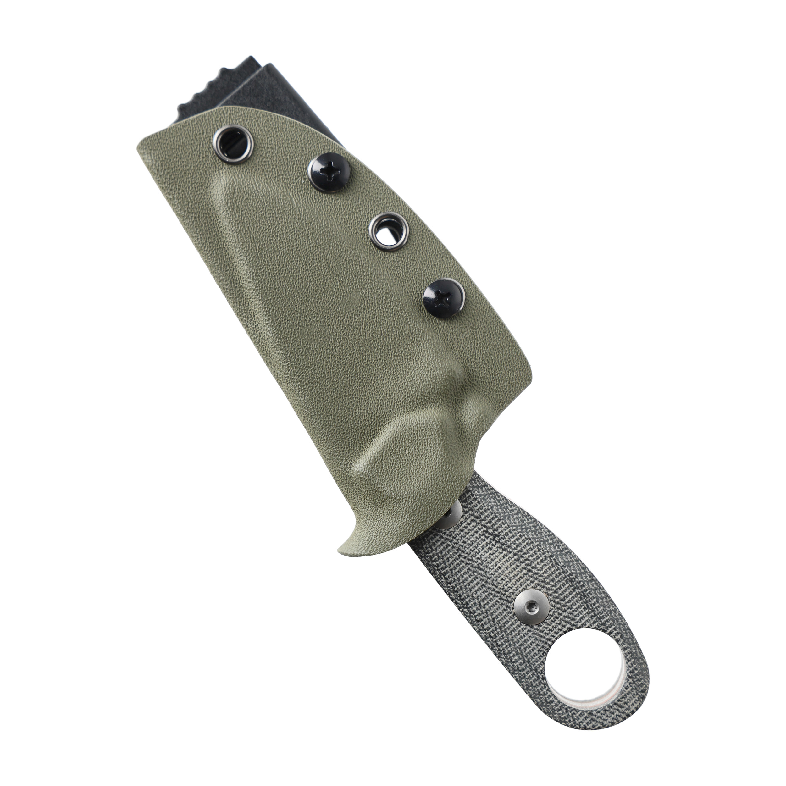 Rękojeść z micarty w eleganckim, czarnym wykończeniu nie tylko cieszy oko, ale przede wszystkim zapewnia stabilny, antypoślizgowy chwyt, niezależnie od warunków atmosferycznych. Delikatna tekstura tworzywa przypominająca drewno podkreśla rzemieślniczy charakter noża i zapewnia komfort podczas dłuższej pracy. W zestawie znajduje się solidna pochwa z kydexu, która pozwala na bezpieczne przenoszenie narzędzia oraz chroni ostrze przed uszkodzeniem. To funkcjonalność, której można zaufać — bez kompromisów.