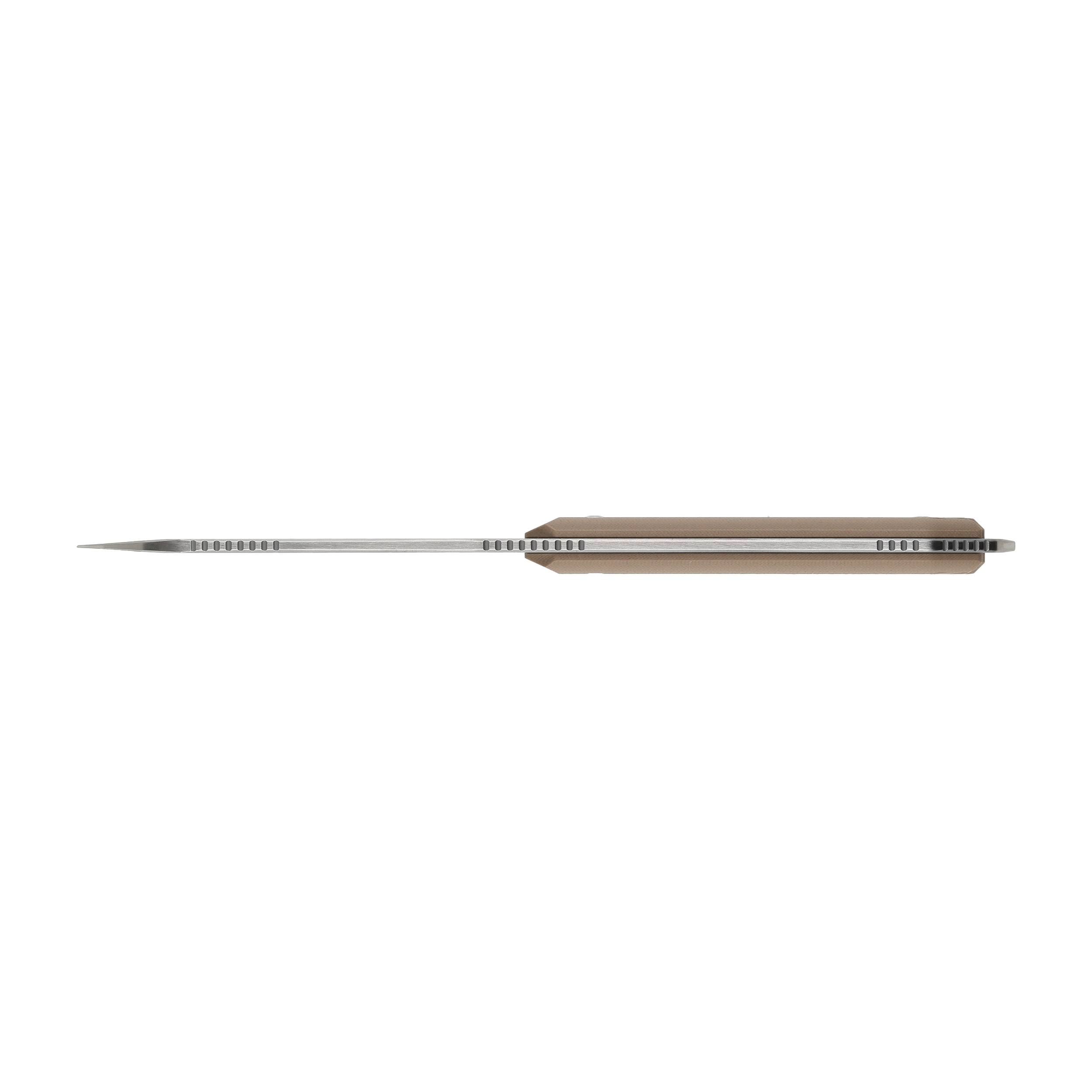 - Ergonomiczne okładziny rękojeści z G10 – pewny chwyt w każdych warunkach. Ergonomiczny uchwyt z teksturowanego, G10 zapewnia pewny, bezpieczny chwyt nawet w mokrych czy zabrudzonych dłoniach.