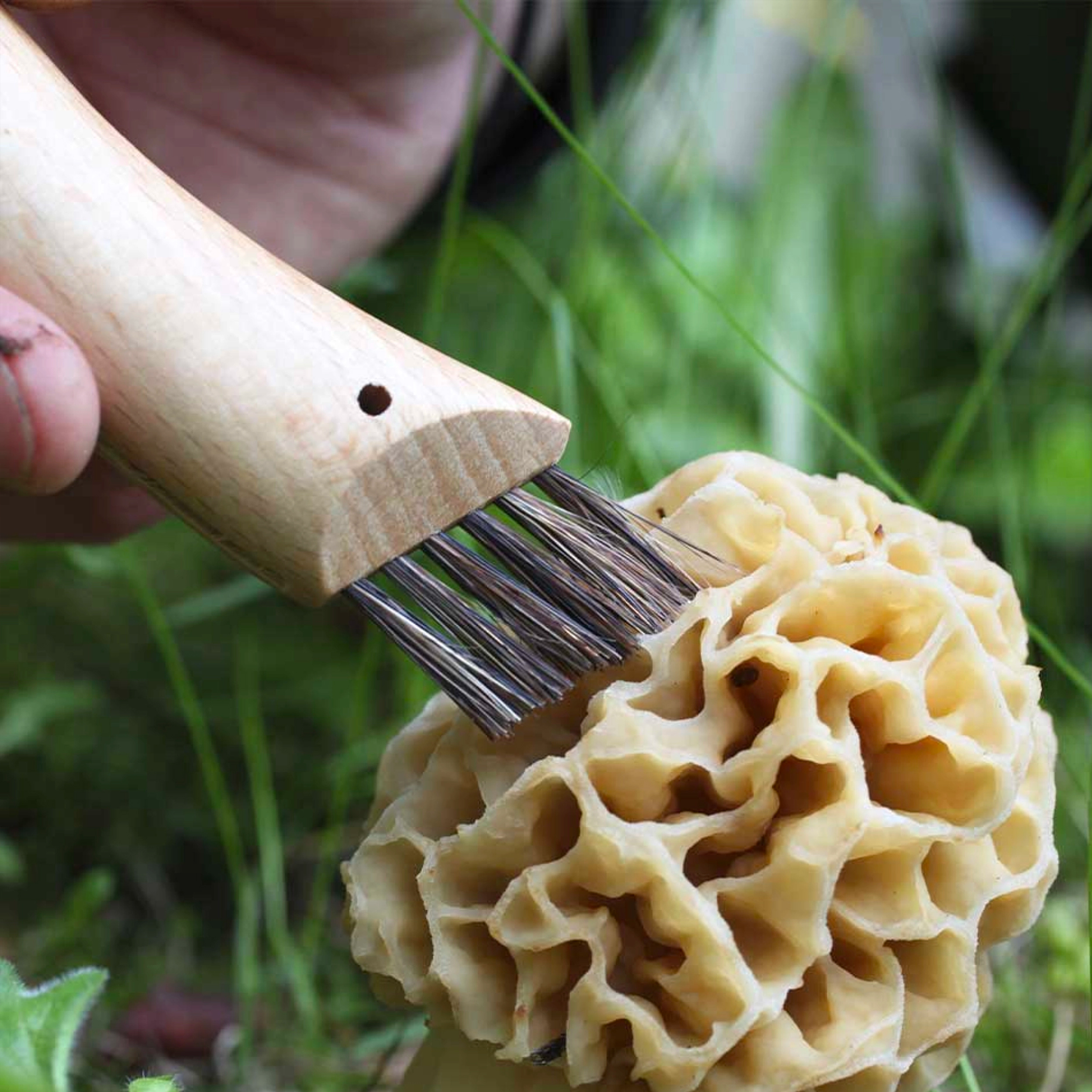 Do wykonania rękojeści zastosowano drewno francuskiego buku, z bezbarwną powłoką lakierniczą chroniącą przed zabrudzeniem i działaniem wilgoci. Rękojeść ma tradycyjny owalny profil, który rozszerza się na końcu, dzięki czemu nóż wygodnie i pewnie leży w dłoni. W tylnej części rękojeści znajduje się szczotka z włosia dzika przydatna do oczyszczania grzybów.