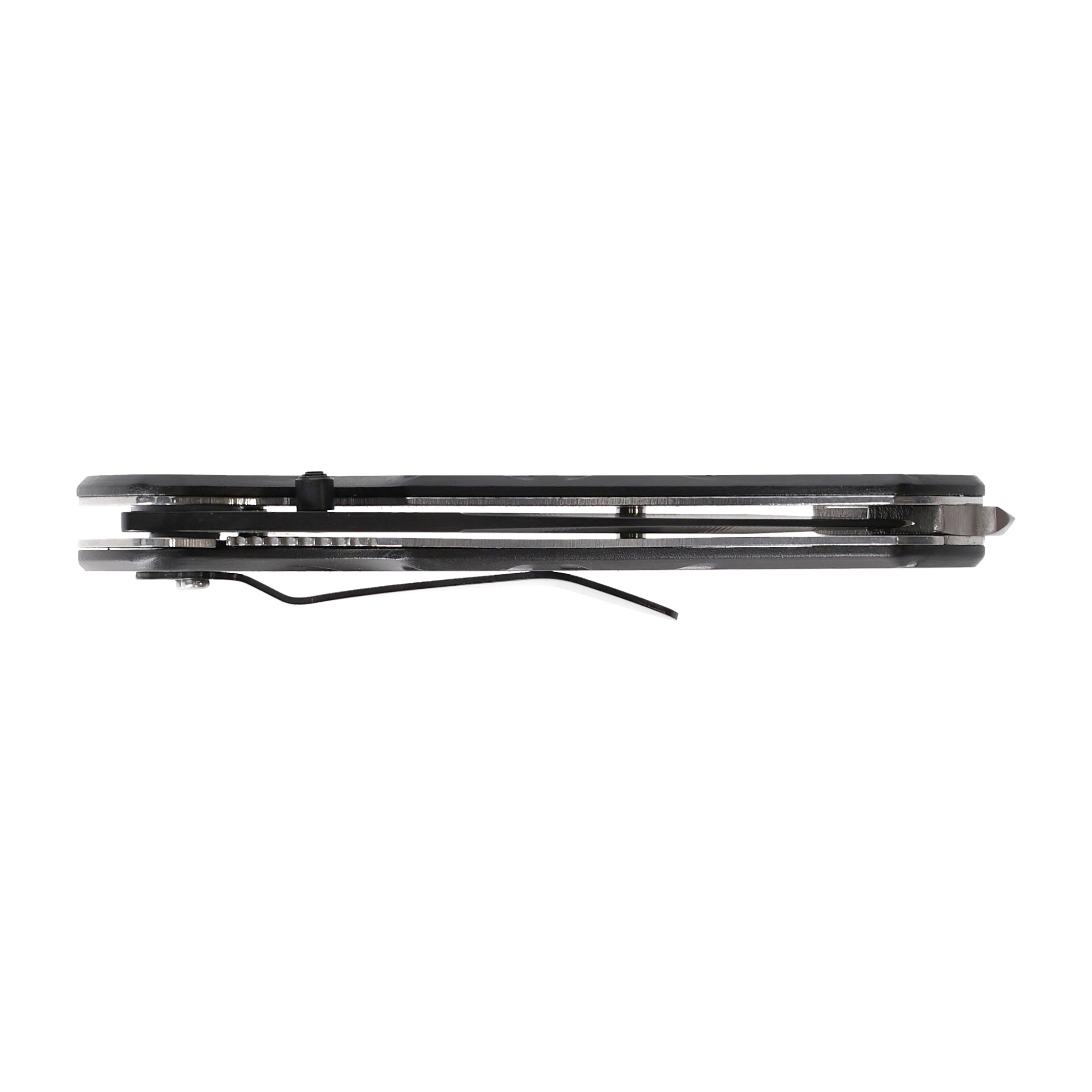 Nóż ma lekkie okładziny z anodowanego aluminium. Szeroki chwyt, głębokie podcięcie na palec wskazujący oraz drobne frezy sprawiają, że nóż pewnie i wygodnie leży w dłoni. Dyskretne przenoszenie noża w kieszeni umożliwia wysoko osadzony klips (bez możliwości przełożenia).