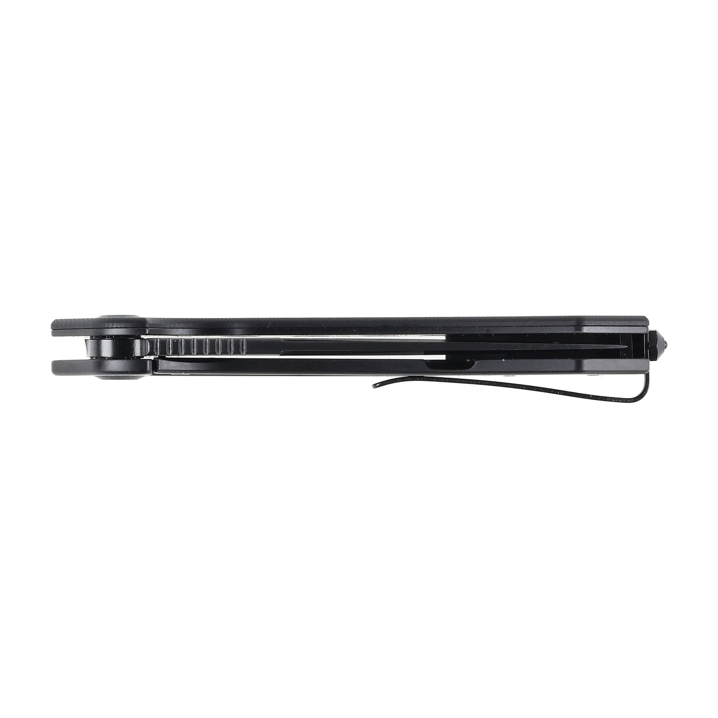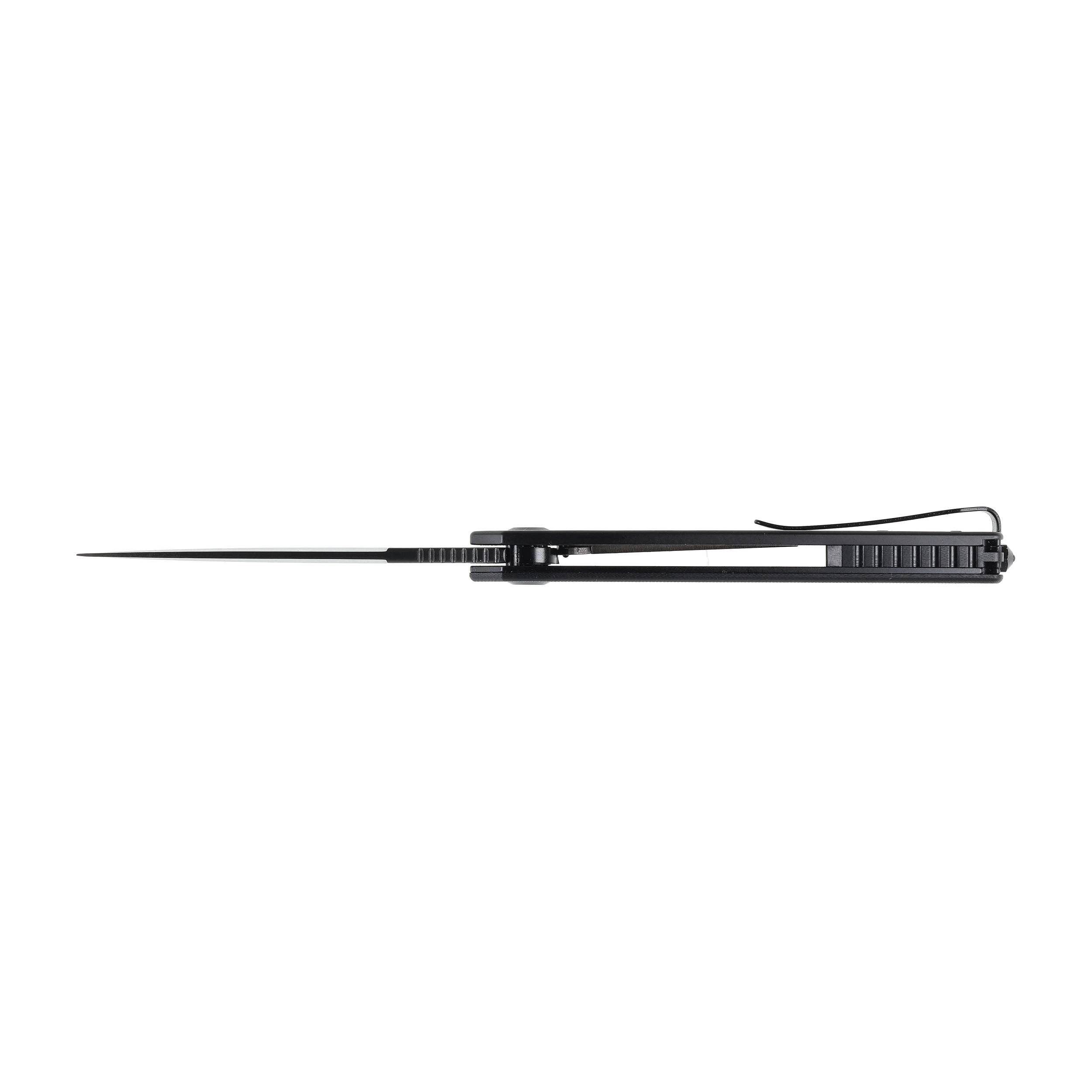 Klinga drop-point o długości 85 mm ma efektowne ostrze fałszywe. Ostrze w całości pokryto czarną powłoką ochronną DLC (Diamond Like Carbon). Ta trudnościeralna powłoka węglowa, zwiększa twardość zewnętrzną stali, dodatkowo chroni ostrze z D2 przed korozją, zużyciem i zarysowaniami. Dzięki zastosowaniu mocnego sztychu, wysokiego szlifu płaskiego oraz krawędzi tnącej o łagodnie zaokrąglonej linii, nóż z łatwością penetruje oraz płynnie tnie. Na tylnym odcinku grzbietu wykonano poprzeczne frezy, pozwalające na stabilne oparcie palca podczas pracy. Nóż po rozłożeniu ma długość 205 mm, grubość klingi w najszerszym miejscu wynosi 3,5 mm, co stanowi kompromis pomiędzy komfortem przenoszenia, funkcjonalnością oraz wytrzymałością na uszkodzenia.