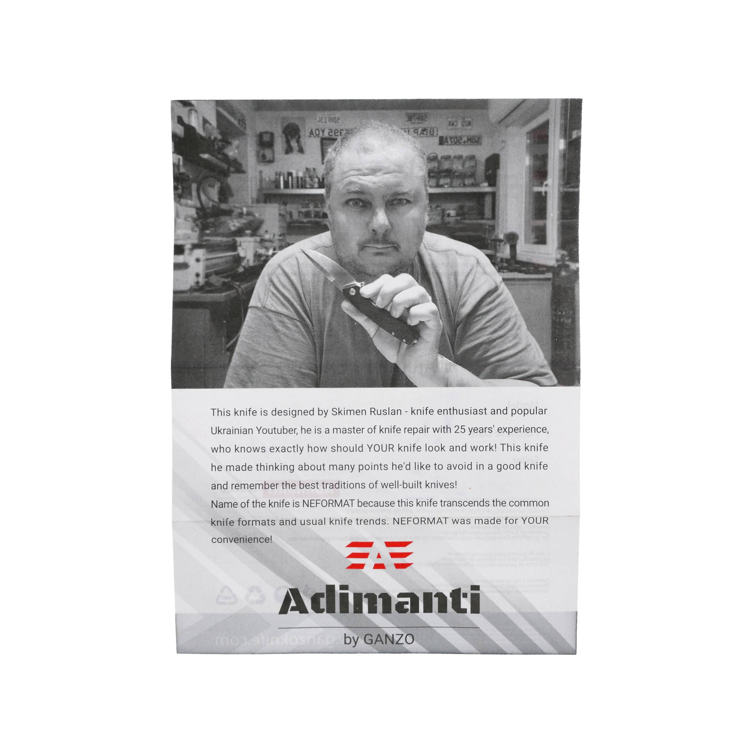 Adimanti to minimalistyczny nóż do codziennego noszenia, wyposażony w łożyskowaną głownię ze stali narzędziowej D2, monolityczną blokadę frame-lock, wysoko osadzony klips oraz zbijak do szyb. Elementem, który wyróżnia Skimen Adimanti nawet na tle droższych modeli, jest wspaniała mechanika, idealnie wycentrowana głownia oraz rzetelne wykończenie, pozbawione ostrych krąwędzi.