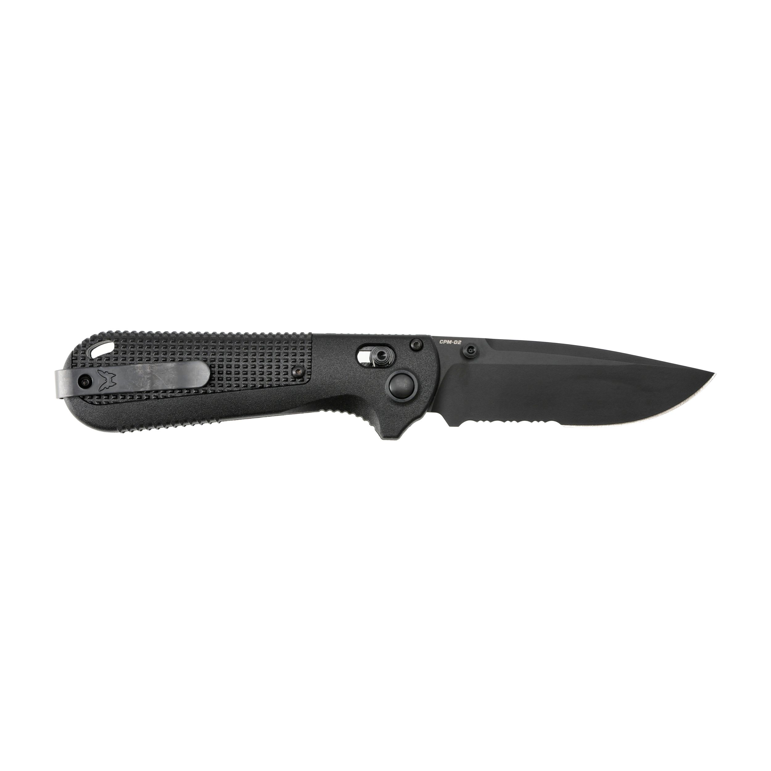 Tylna część ostrza jest ząbkowana, co ułatwia cięcie twardych i włóknistych materiałów np. plastiku, kości, lin, pasów oraz taśm technicznych. Ostrza typu combo (połączenie gładkiej i ząbkowanej krawędzi tnącej) są przeważnie wybierane przez żołnierzy, ratowników oraz osoby szukające narzędzi o szerszym spektrum zastosowań. Głownię można błyskawicznie rozłożyć jedną ręką, za pomocą dwustronnego kołka. Dzięki zastosowaniu podkładek z fosforobrązu klinga pracuje płynnie i dynamicznie. Za bezpieczeństwo pracy odpowiada flagowy mechanizm Benchmade, dwustronna blokada Axis-lock, ceniona za ogromną wytrzymałość mechaniczną, odporność na zabrudzenie oraz wygodę obsługi dla prawo i leworęcznych użytkowników.
