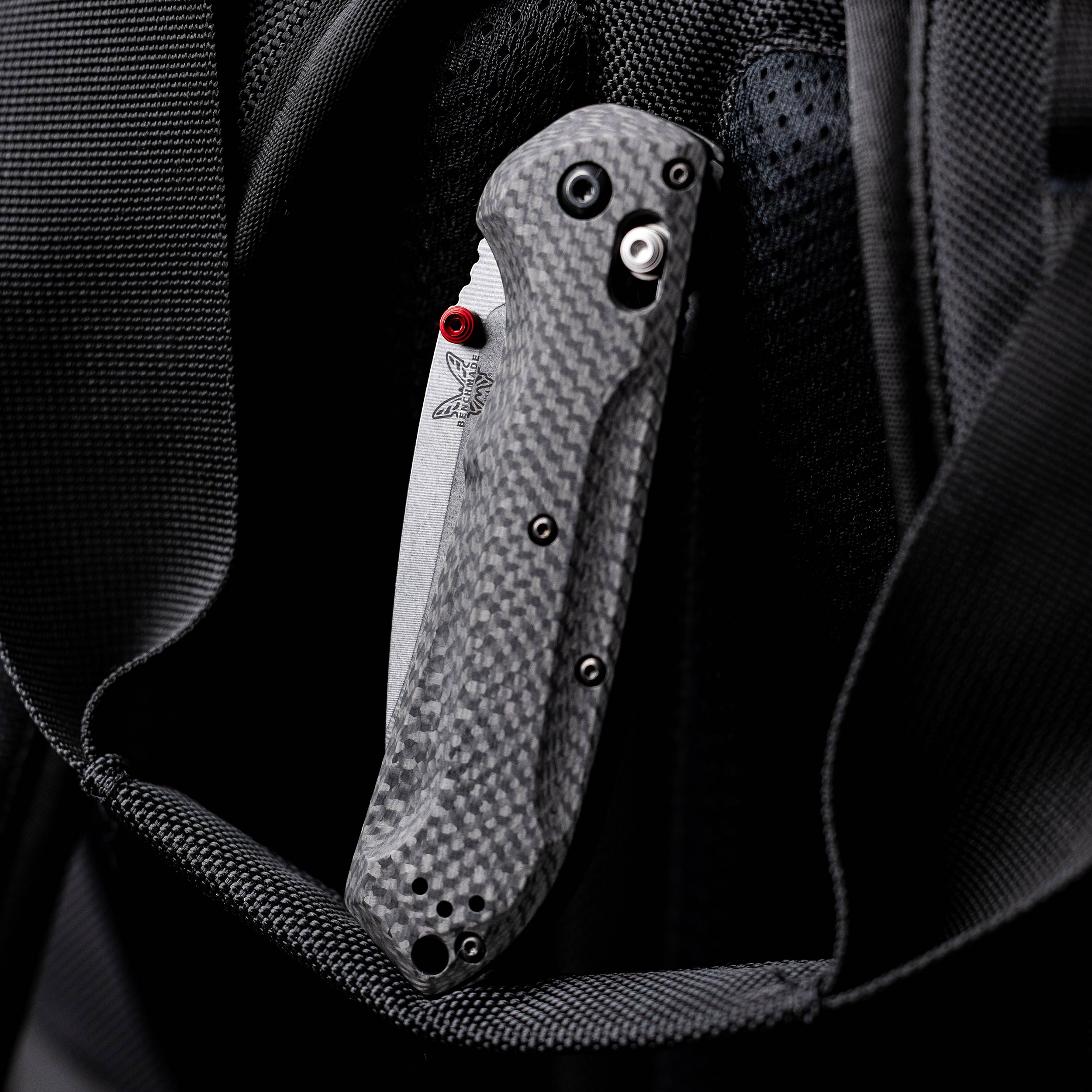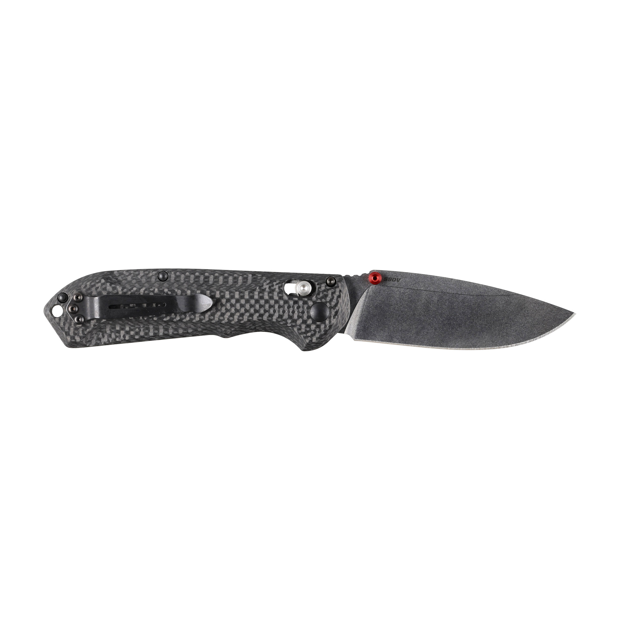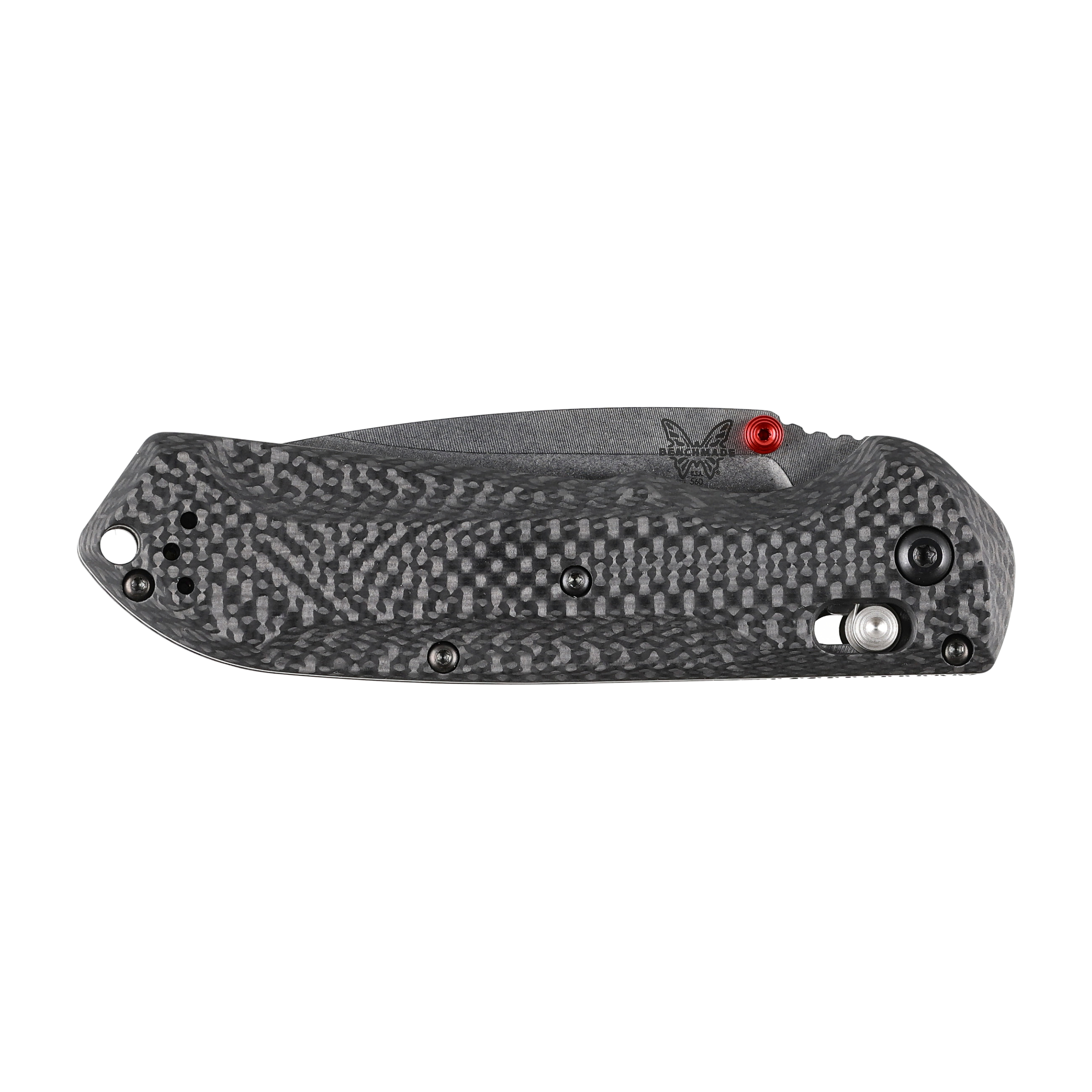Za bezpieczeństwo pracy odpowiada flagowy mechanizm Benchmade, dwustronna blokada Axis-lock, ceniona za ogromną wytrzymałość mechaniczną, odporność na zabrudzenie oraz wygodę obsługi dla prawo i leworęcznych użytkowników. Do rozkładania klingi jedną ręką służy obustronny kołek wykonany z anodowanego aluminium o kontrastowej czerwonej kolorystyce.