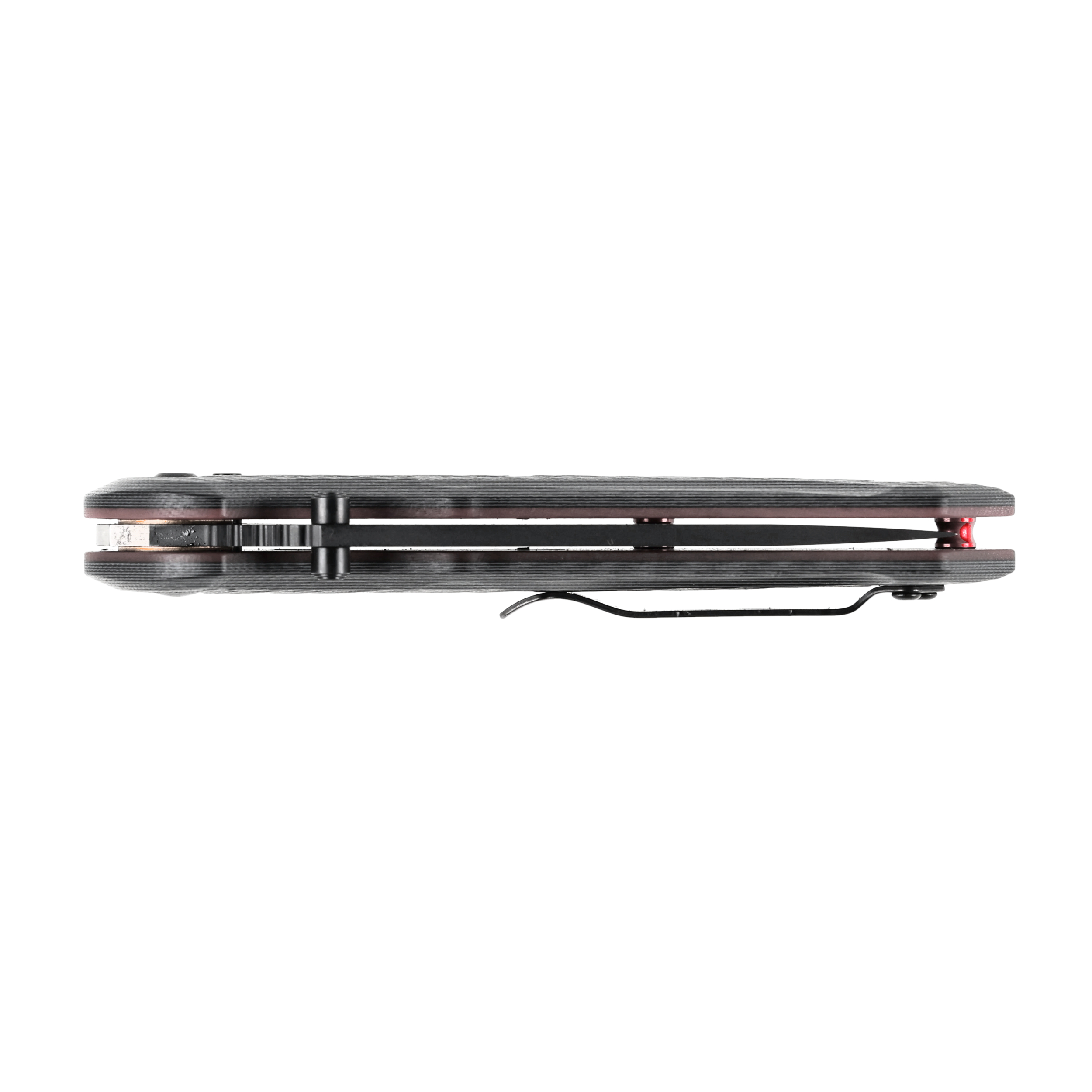 - Trwała i ergonomiczna rękojeść: Profilowane okładziny wykonane z czarno-szarego laminatu G10, frezowanego w celu zwiększenia przyczepności i pewności chwytu. Rękojeść wzbogacona czerwonymi linersami i polerowanymi tulejami dystansowymi nadaje nożowi elegancki i nowoczesny wygląd. Możliwość przełożenia stalowego klipsa na lewą lub prawą stronę rękojeści zapewnia wygodę i wszechstronność noszenia.