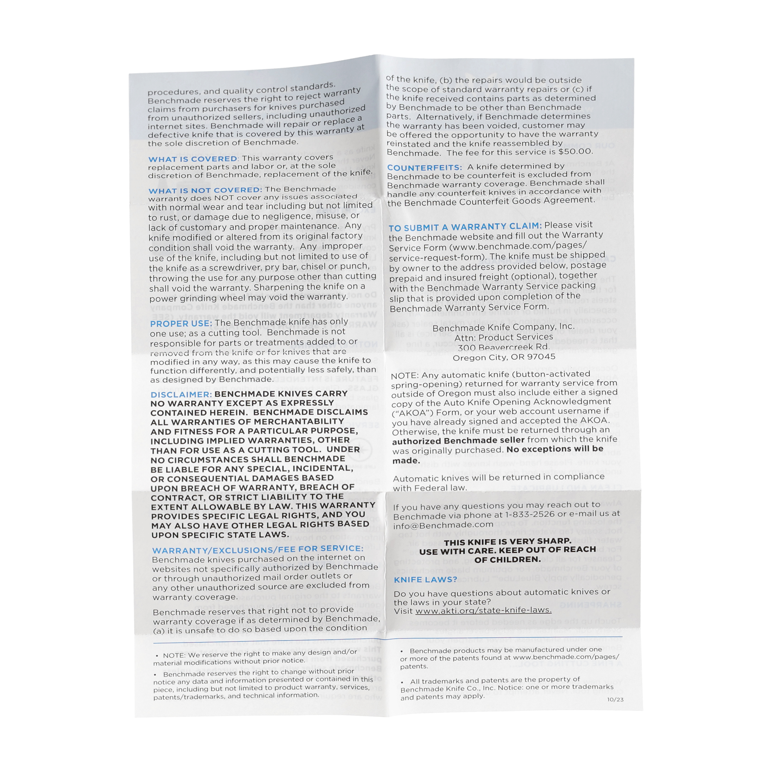 W nożu zastosowano dodatkową blokadę, który zapobiega przypadkowemu złożeniu oraz rozłożeniu ostrza podczas przenoszenia. Suwak drugiego mechanizmu zabezpieczającego znajduje się na grzbiecie rękojeści.