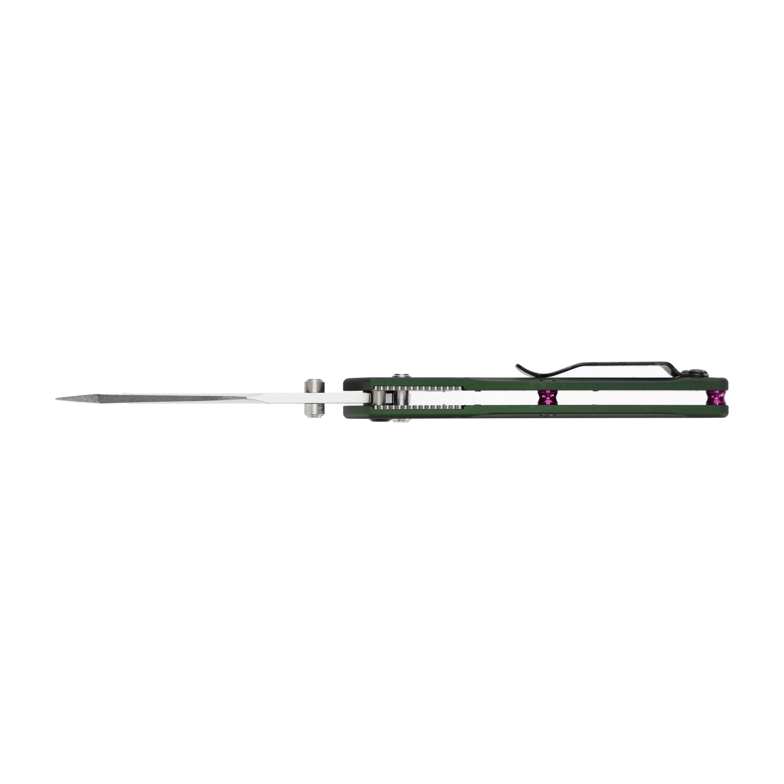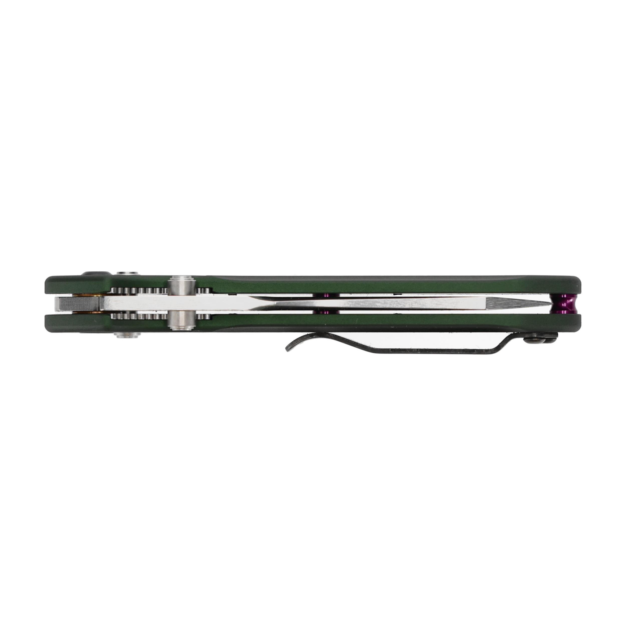 - Lekka i stylowa rękojeść: Okładziny z anodowanego aluminium lotniczego 6061-T6 zapewniają lekkość, wytrzymałość i elegancki wygląd. Profilowana konstrukcja rękojeści zwiększa komfort chwytu, zapobiegając zsunięciu dłoni na ostrze podczas pracy. Fioletowe tuleje dystansowe dodają wyjątkowego charakteru i estetyki.