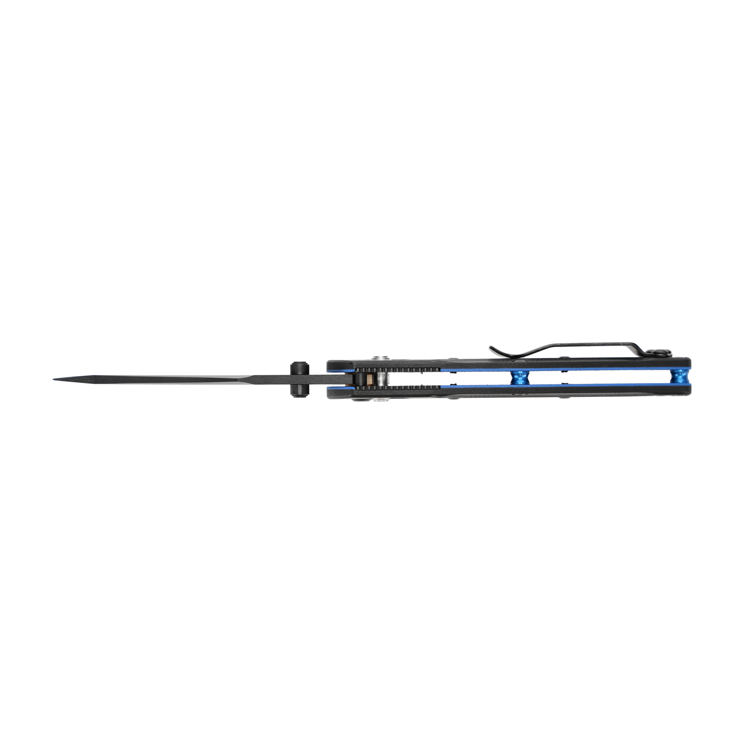 Rękojeść wzmacniają stalowe wkładki oraz tuleje dystansowe anodowane na niebiesko, efektownie kontrastujące z czarną kolorystykę noża. Okładziny uzupełnia sprężysty klips, umożliwiający wygodne przenoszenia noża w kieszeni lub na pasie.