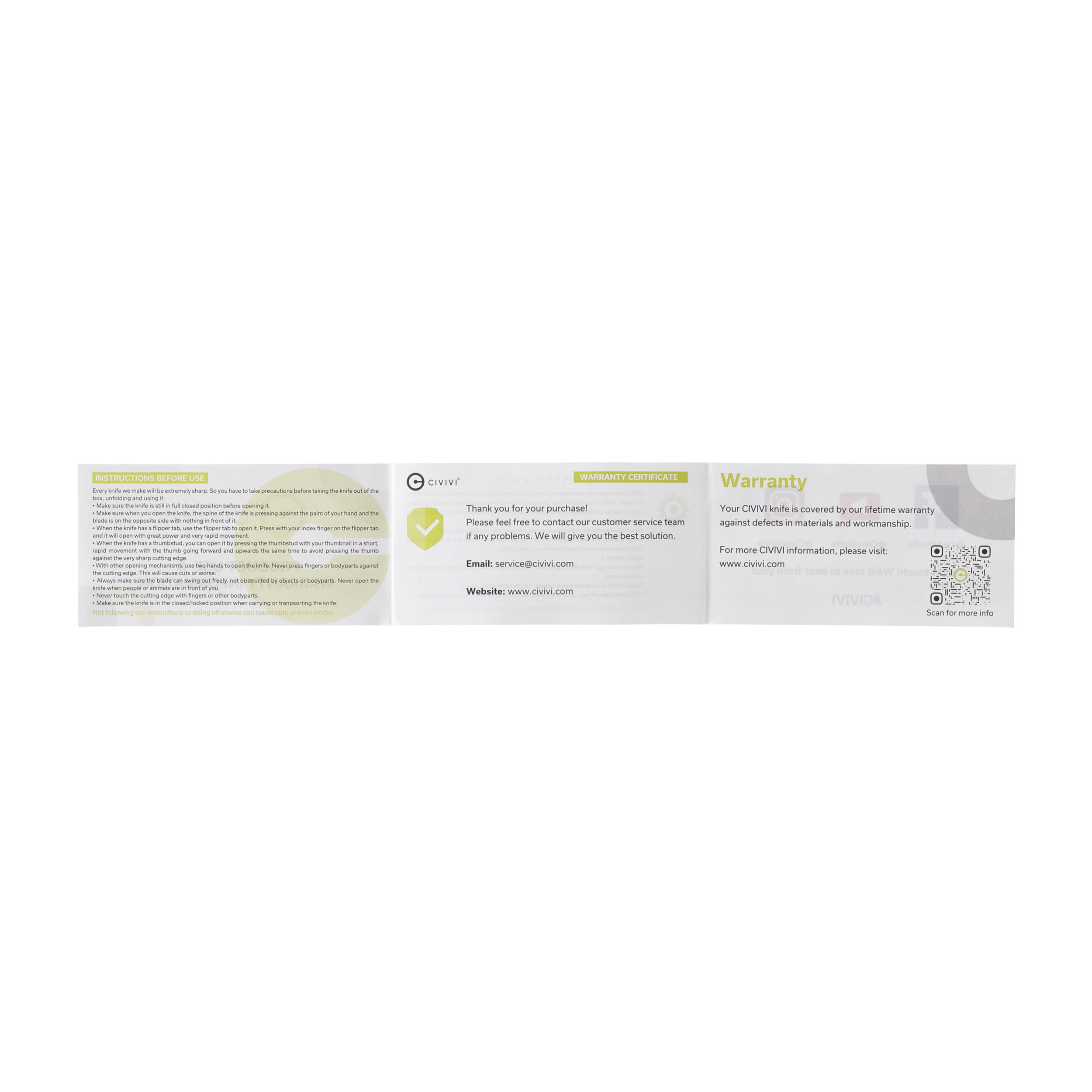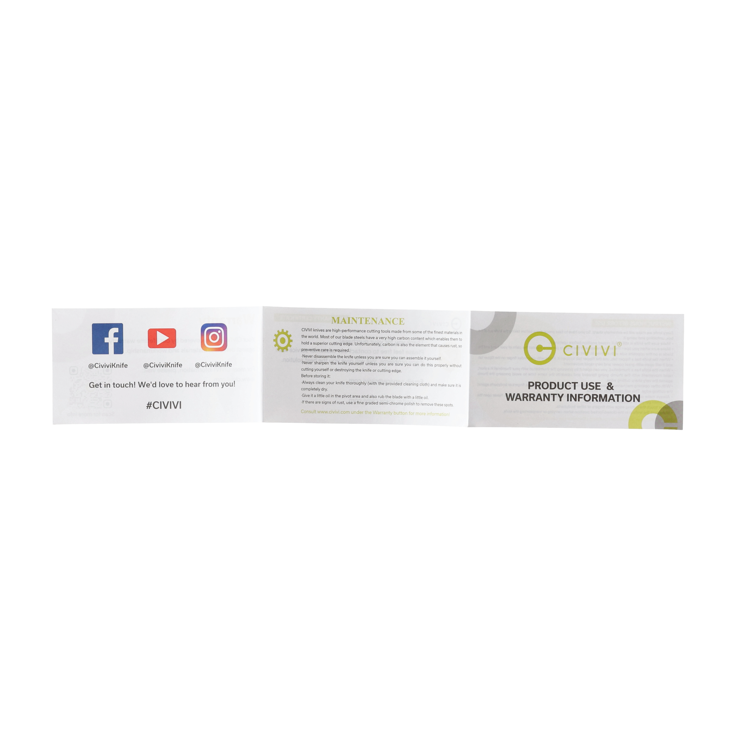 Rękojeść wykonana jest z dwóch wytrzymałych kawałków litego aluminium. Oś ozdobiona została logo marki Civivi. Dwupozycyjny metalowy klips umożliwia dyskretne przenoszenie noża w kieszeni w pozycji tip-up (czubkiem ostrza do góry). Na końcu rękojeści znajduje się otwór na linkę (lanyard hole).