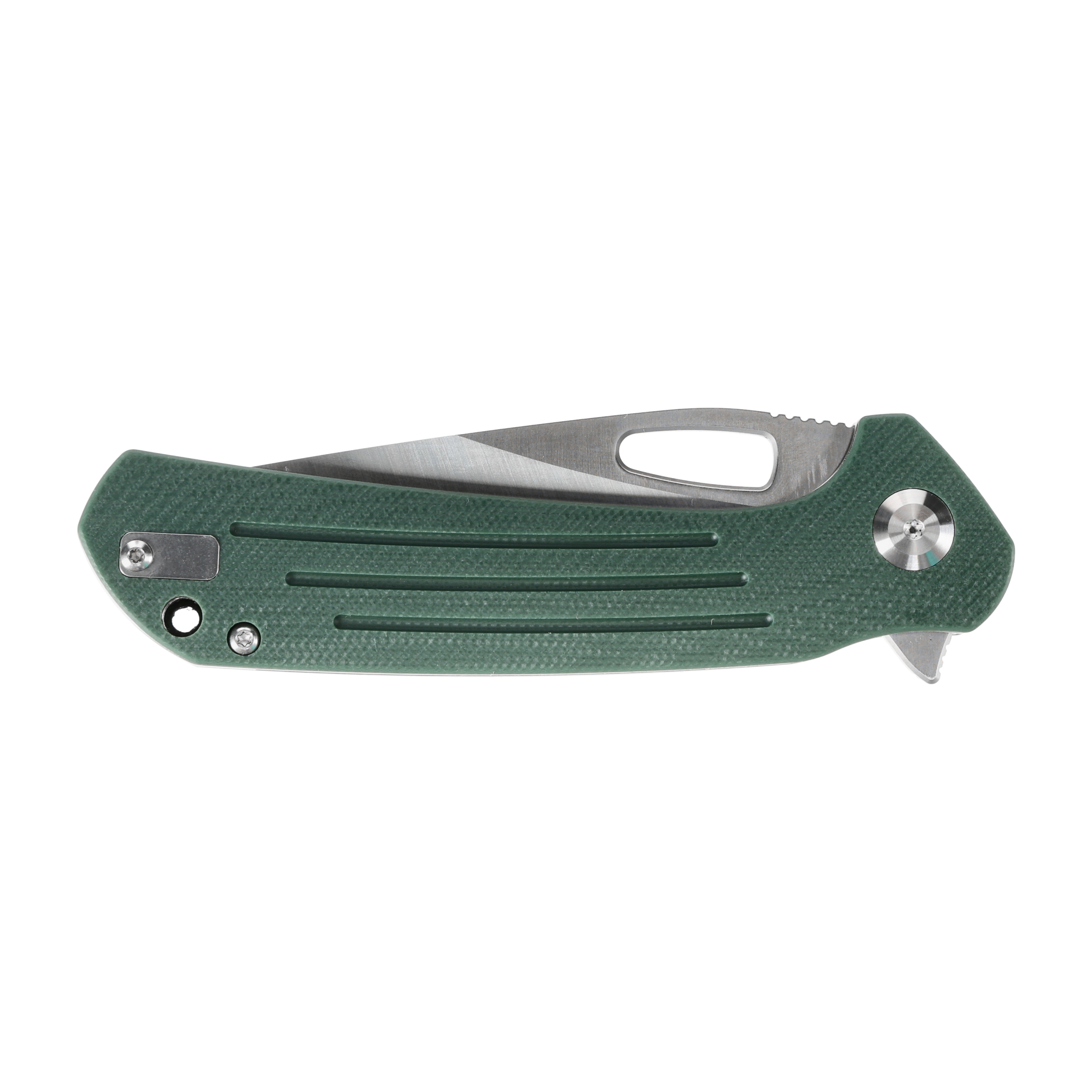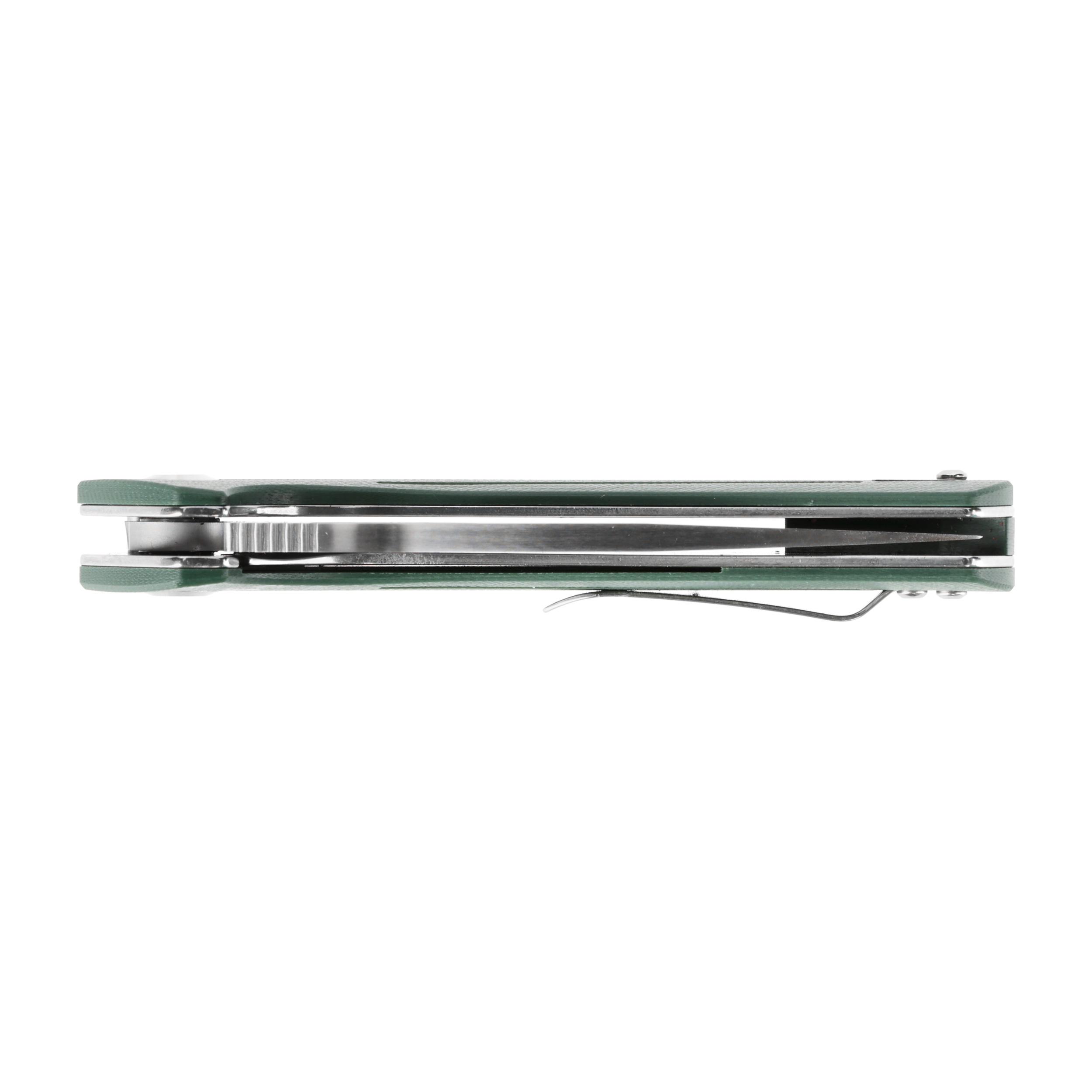 Rękojeść noża tworzą proste okładziny z laminatu G10, materiału wzmacnianego włóknem szklanym, odpornego na udar mechaniczny, wysoką temperaturę oraz działanie niektórych aktywnych substancji chemicznych. G10 to materiał łatwy w konserwacji o szorstkiej antypoślizgowej powierzchni zapewniającej stabilny chwyt noża. Profilowany i wysoko osadzony klips pozwala na dyskretne przenoszenie noża w kieszeni. Producent nie zapomniał także o otworze umożliwiającym wplecenie ozdobnego oplotu lub kawałka linki ułatwiającego dobywanie noża.