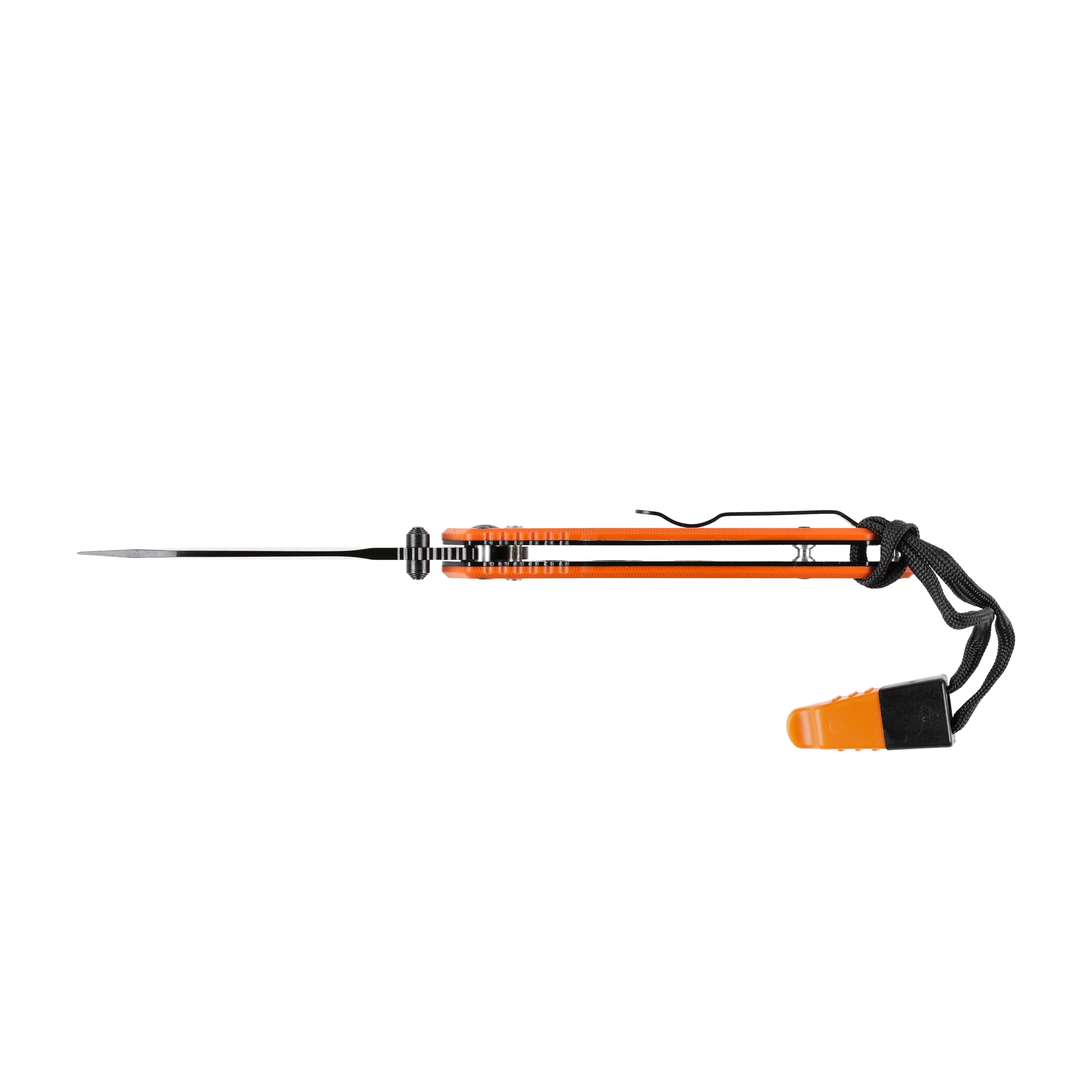 Wygodne przenoszenie noża w kieszeni, na pasku lub przy plecaku zapewnia sprężysty stalowy klips (tip up) z opcją przełożenia na lewą stronę. Outdoorowy charakter noża podkreśla smyczka z paracordu wzbogacona gwizdkiem sygnalizacyjnym o dużej głośności.