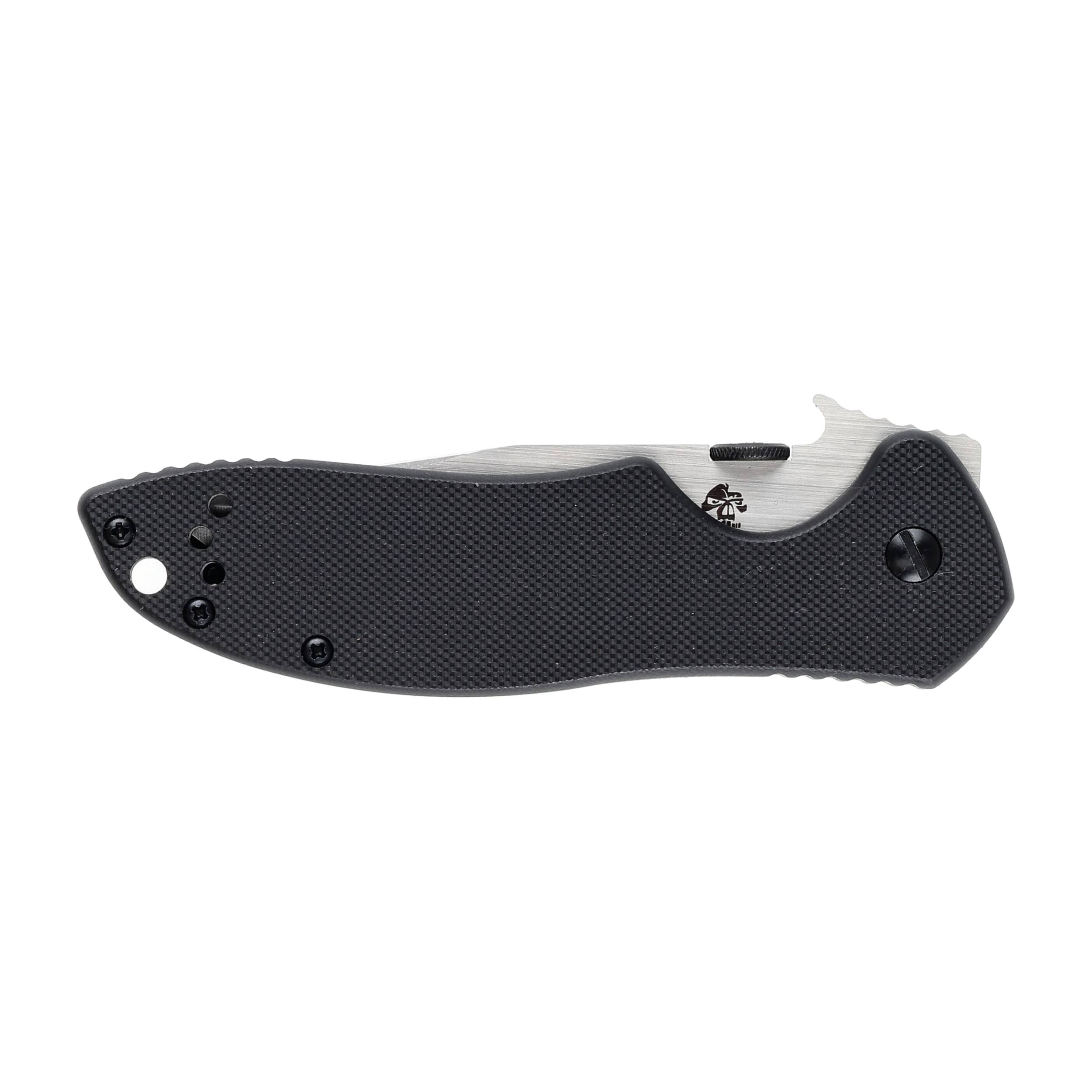 Rękojeść noża tworzą okładziny z piaskowanej stali 410 oraz czarnego laminatu G-10. Profilowany kształt chwytu, podcięcie na palce oraz drobne teksturowanie kompozytu powoduje, że nóż bardzo pewnie leży w dłoni, a jego użytkowanie jest bardzo wygodne.