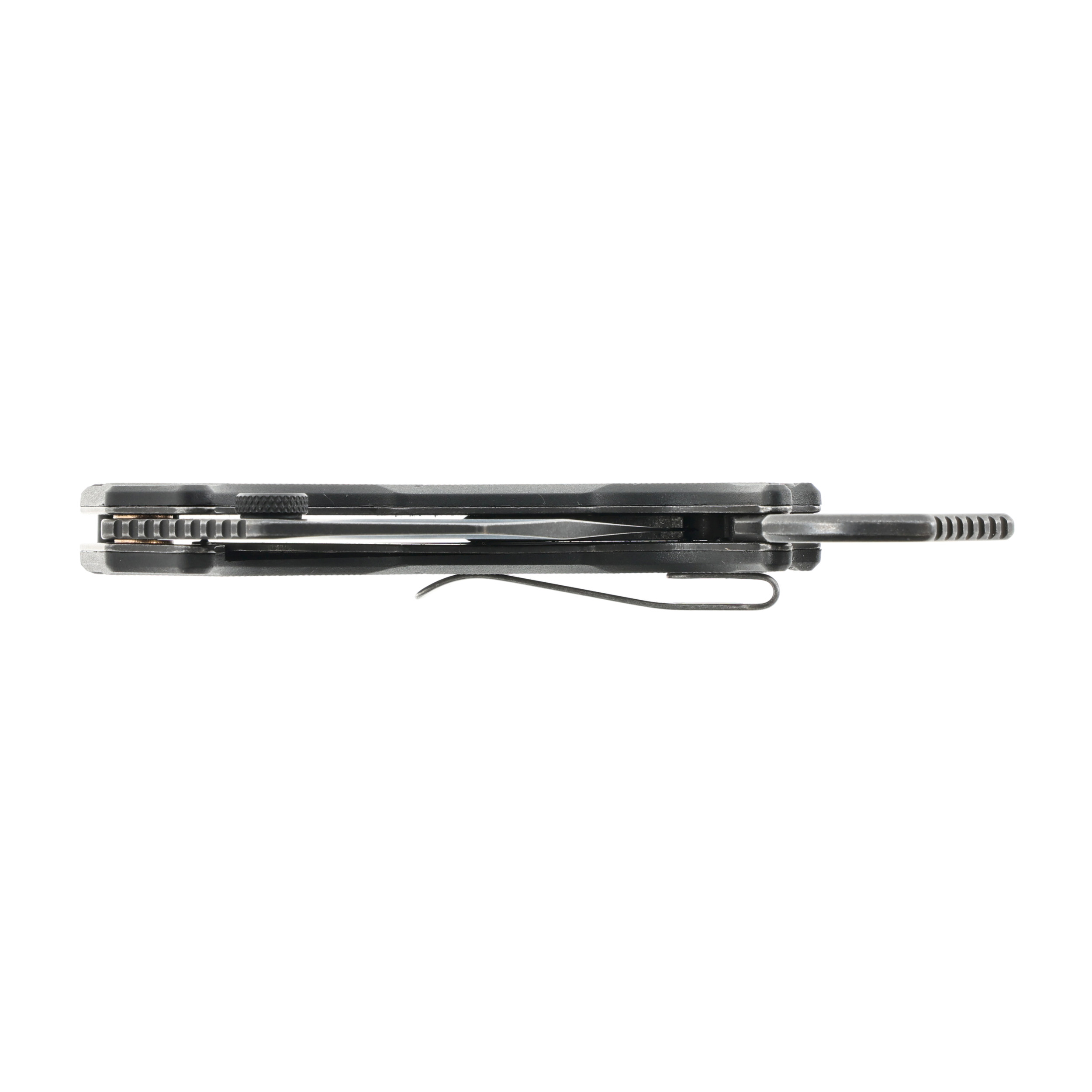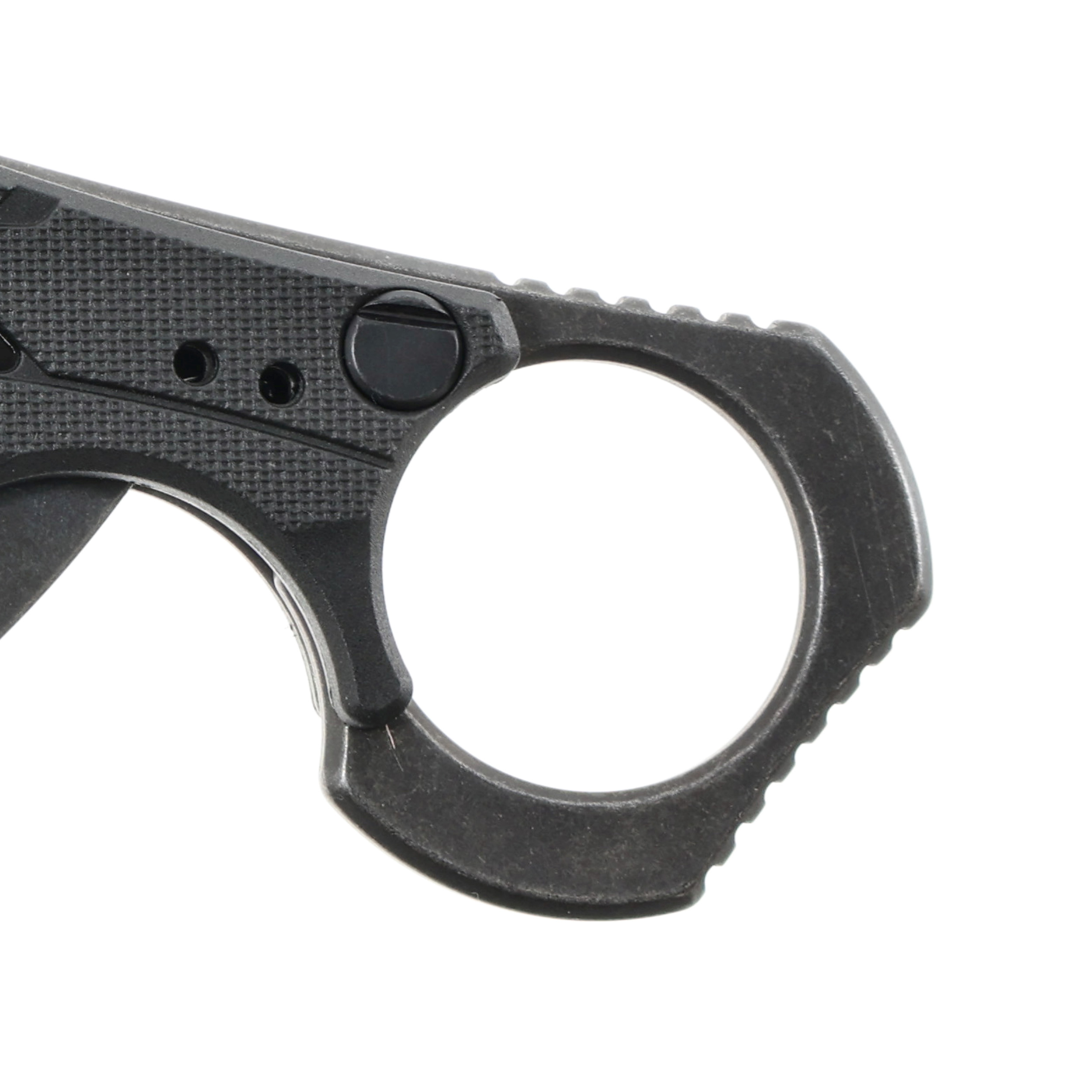 Rękojeść noża tworzą okładziny wykonane z nylonu wzmacnianego włóknem szklanym. Profilowany kształt chwytu, podcięcie na palce oraz drobne antypoślizgowe frezowanie powodują, że ten niewielki nóż pewnie leży w dłoni i jest wygodny w codziennym użytkowaniu. Rękojeść noża zakończona jest stalowym pierścieniem, umożliwiającym błyskawiczną zmianę chwytu, a także wykorzystywanie go w roli pobijaka. Dyskretne przenoszenie noża w kieszeni umożliwia sprężysty klips bez możliwości przełożenia.
