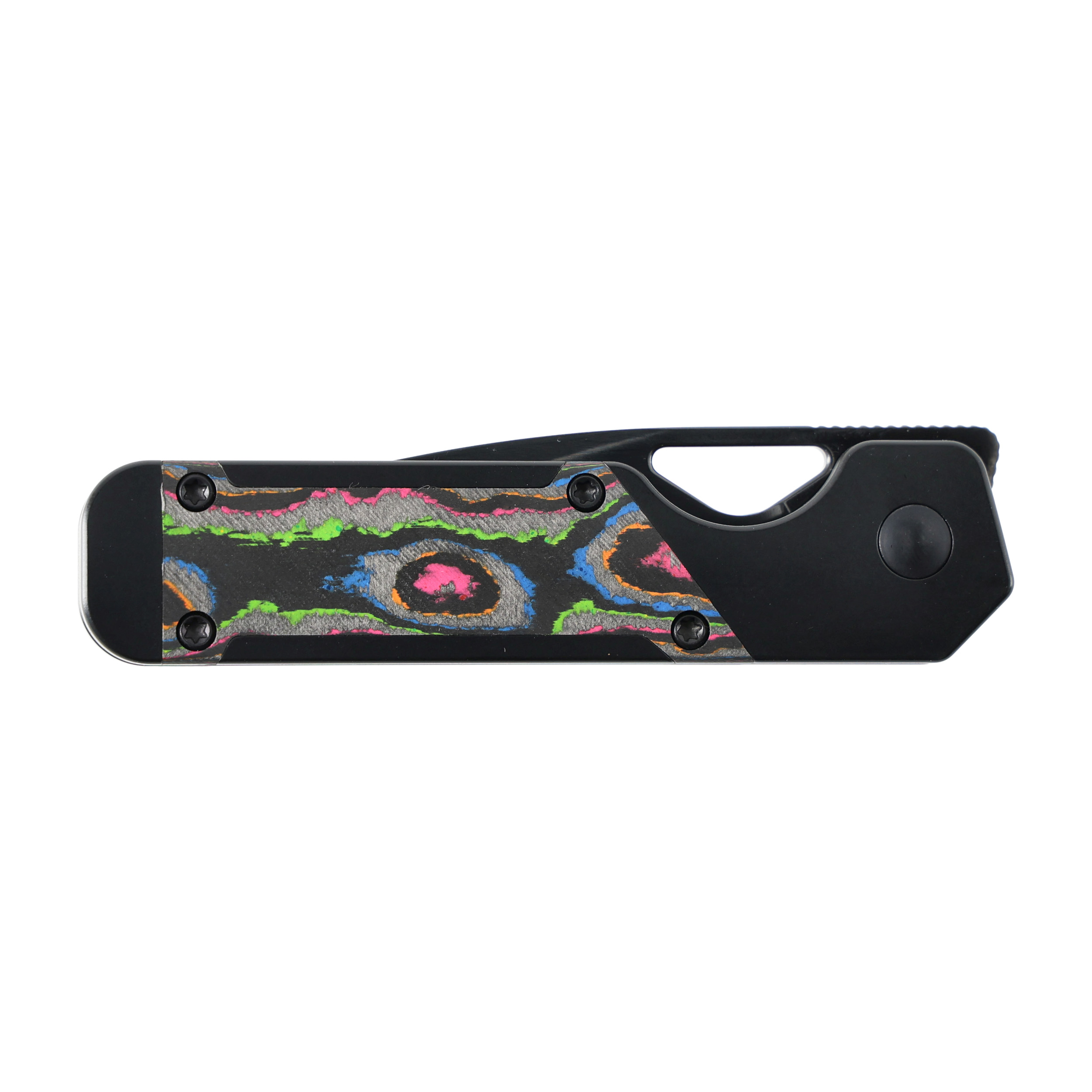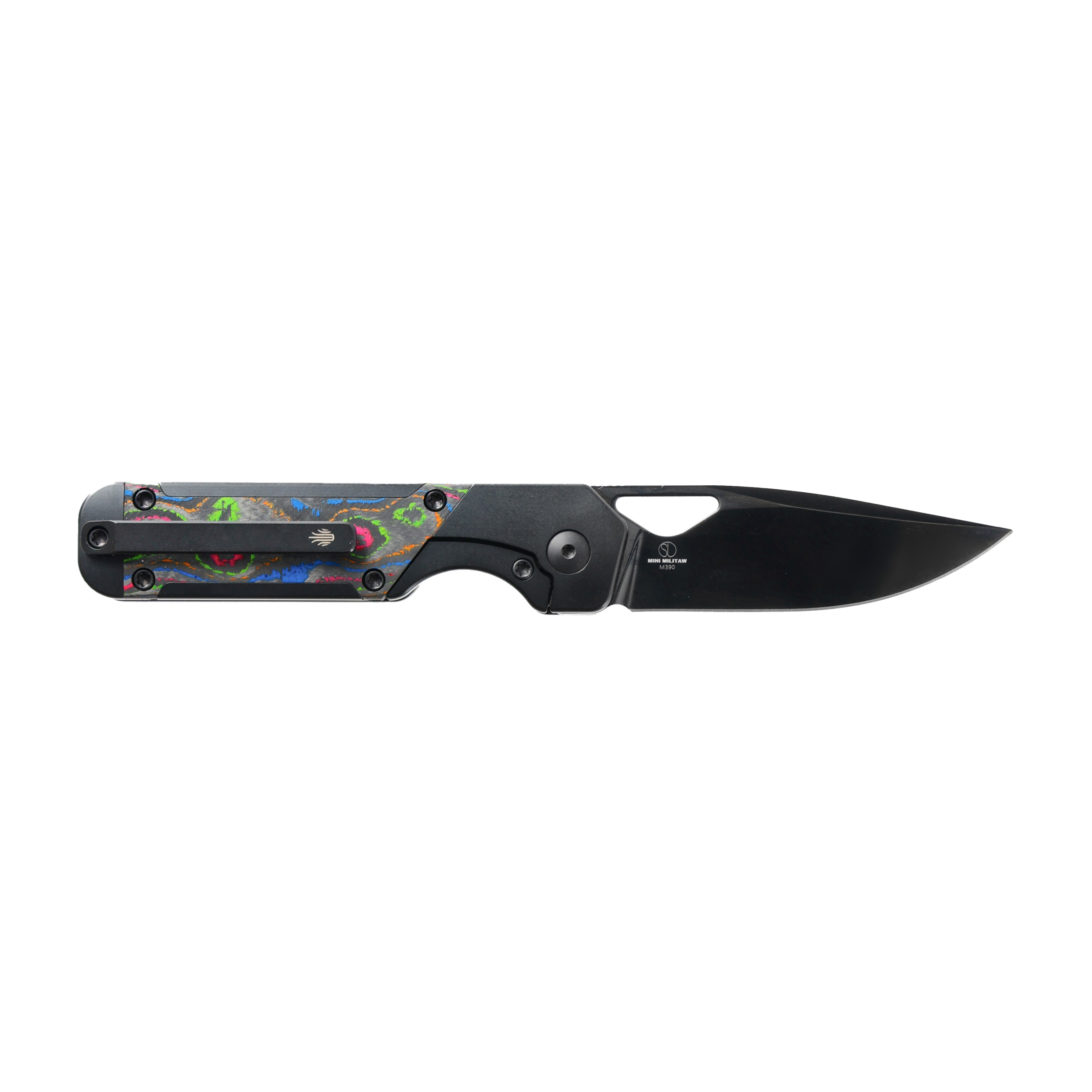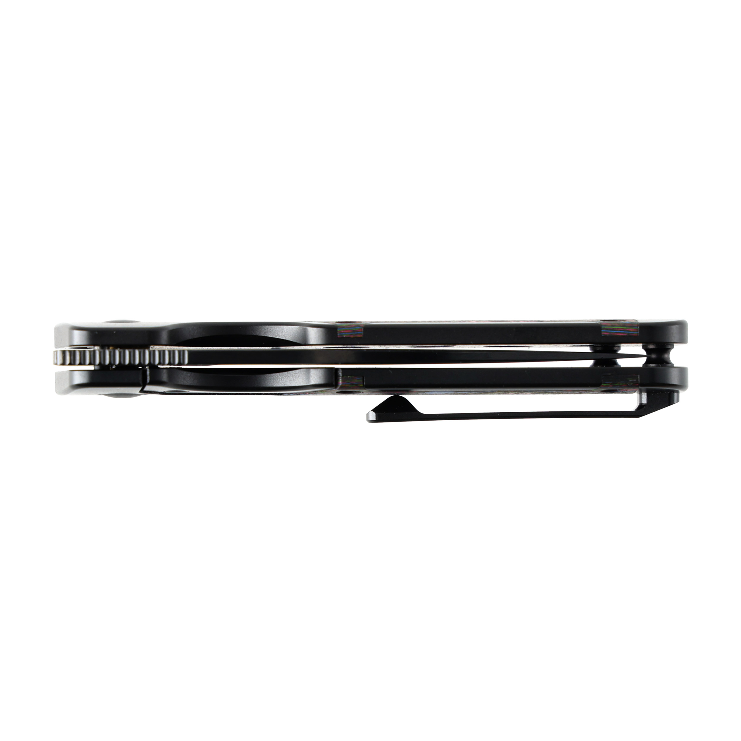 Rękojeść wykonana jest z lekkiego, ale wytrzymałego tytanu pokrytego wielobarwnym włóknem węglowym, co gwarantuje komfort i pewny chwyt podczas użytkowania. Jej ergonomiczny kształt sprawia, że nóż doskonale leży w dłoni, nawet podczas dłuższego użytkowania. Nóż jest również wyposażony w tytanowy klips do noszenia, umożliwiający bezpieczne i dyskretne przymocowanie do paska lub kieszeni.