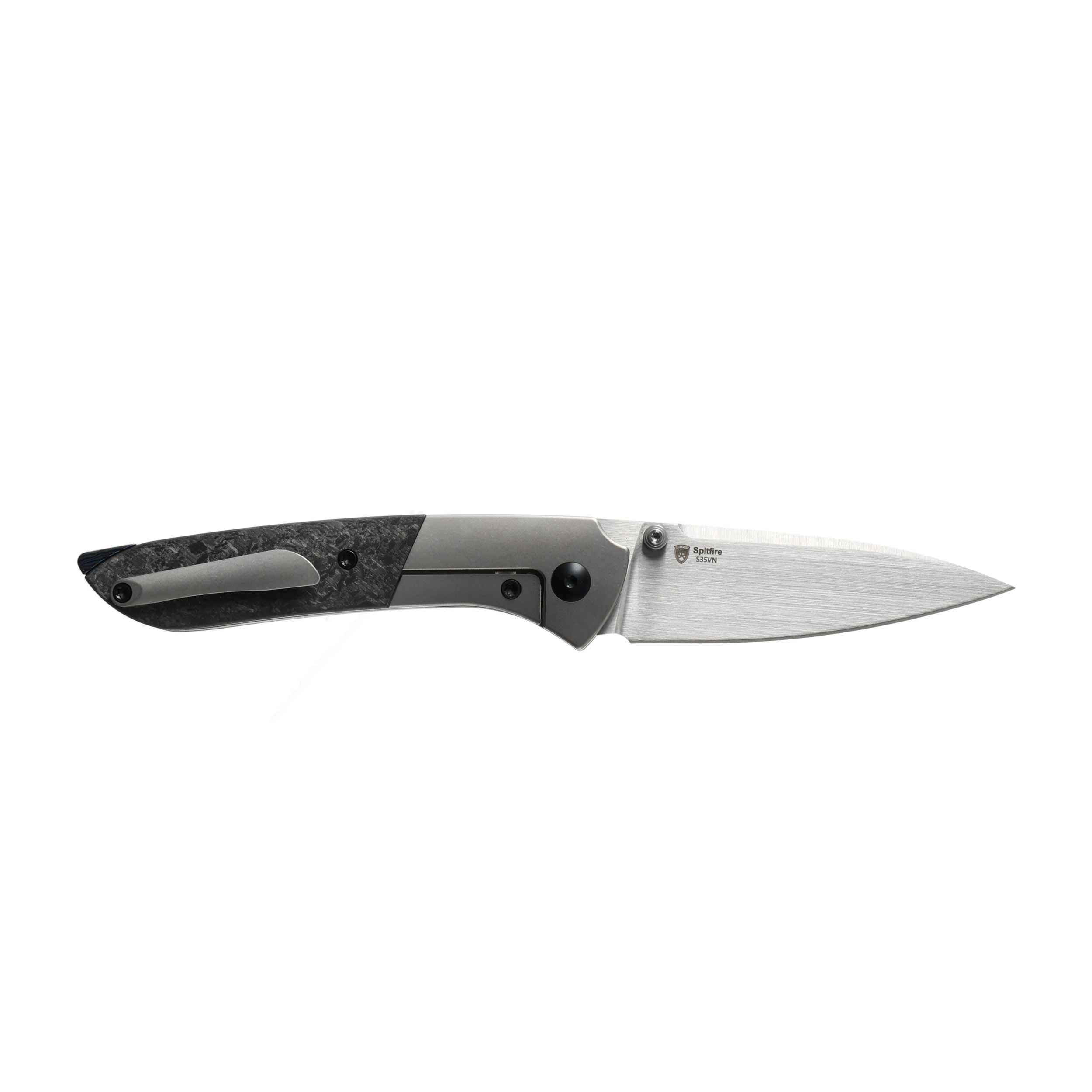 Tytanowy klips umożliwia dyskretne przenoszenie noża w kieszeni (tip-up, prawa strona), dzięki czemu Spitfire zawsze pozostaje w zasięgu ręki.