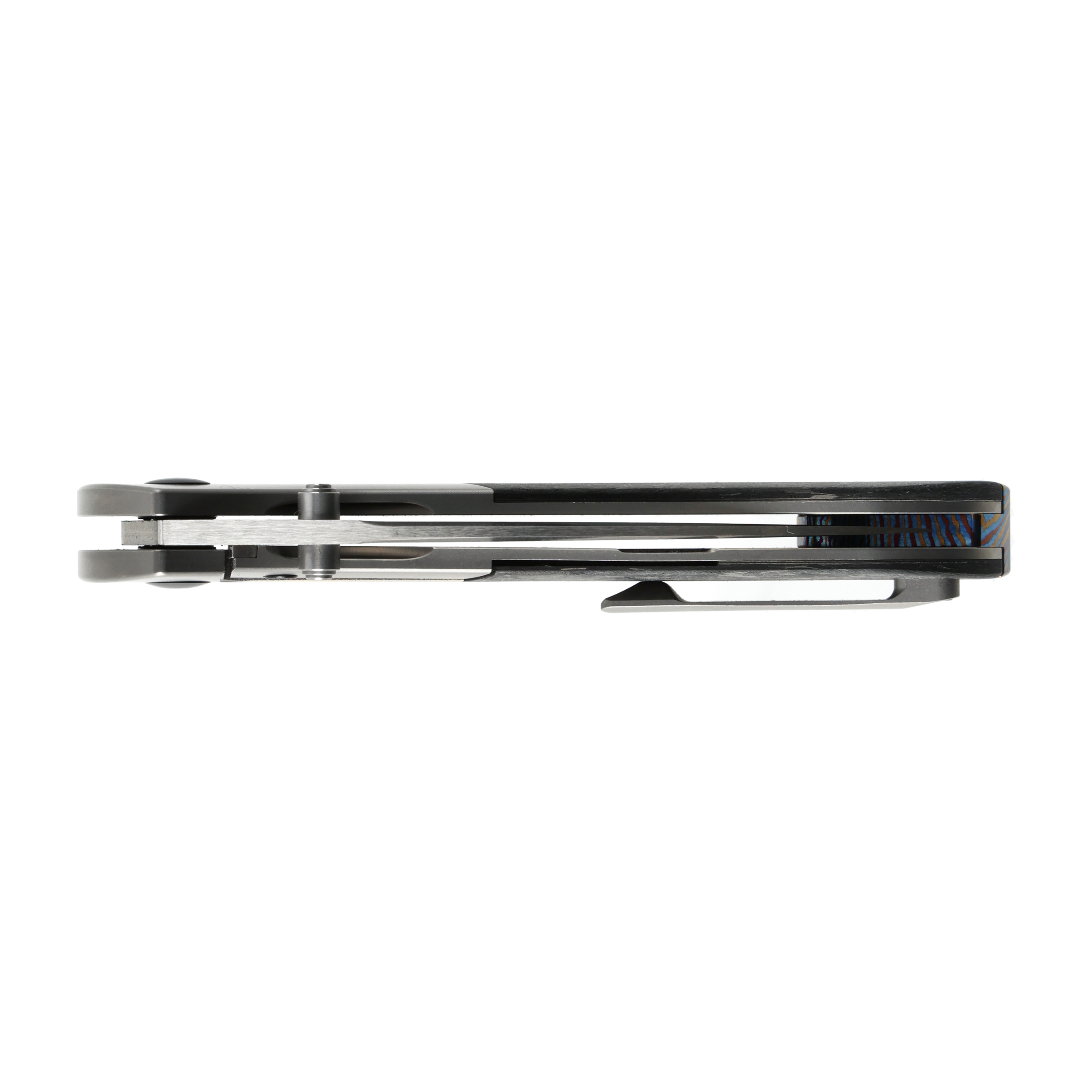 Rękojeść noża składanego Spitfire to synonim nowoczesnego designu i wygody. Wykonana z ultralekkiego, wytrzymałego tytanu, dodatkowo wzbogacona o wstawki z włókna węglowego, zapewnia pewny chwyt nawet podczas dłuższej pracy. Timascusowy backspacer przyciąga wzrok i dodaje kolekcjonerskiego charakteru, podkreślając prestiż całego projektu.