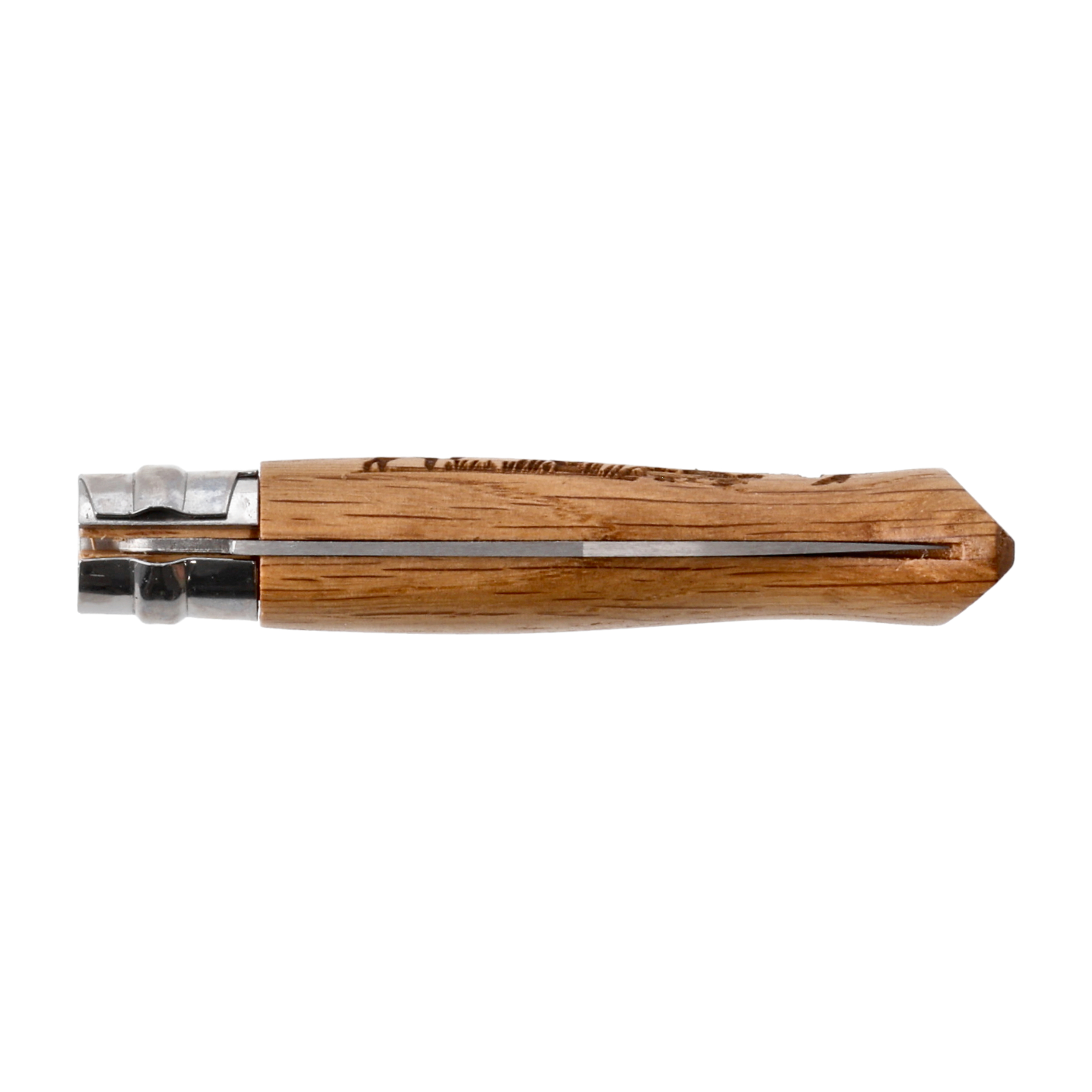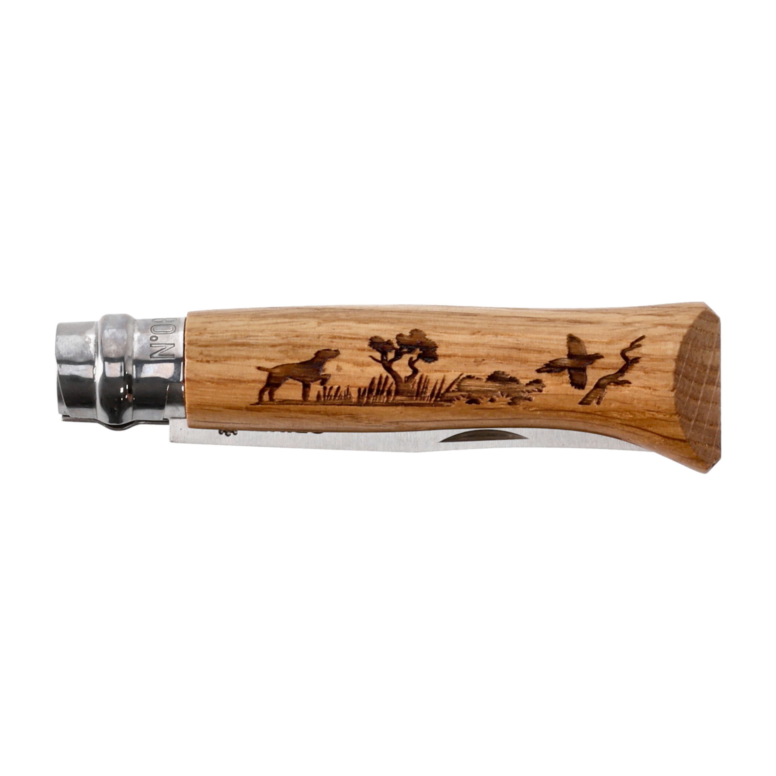 Opinel 8 inox dąb pies to składany nóż outdoorowy z blokowaną głownią ze stali Sandvik 12C27 oraz rękojeścią z drewna dębowego.