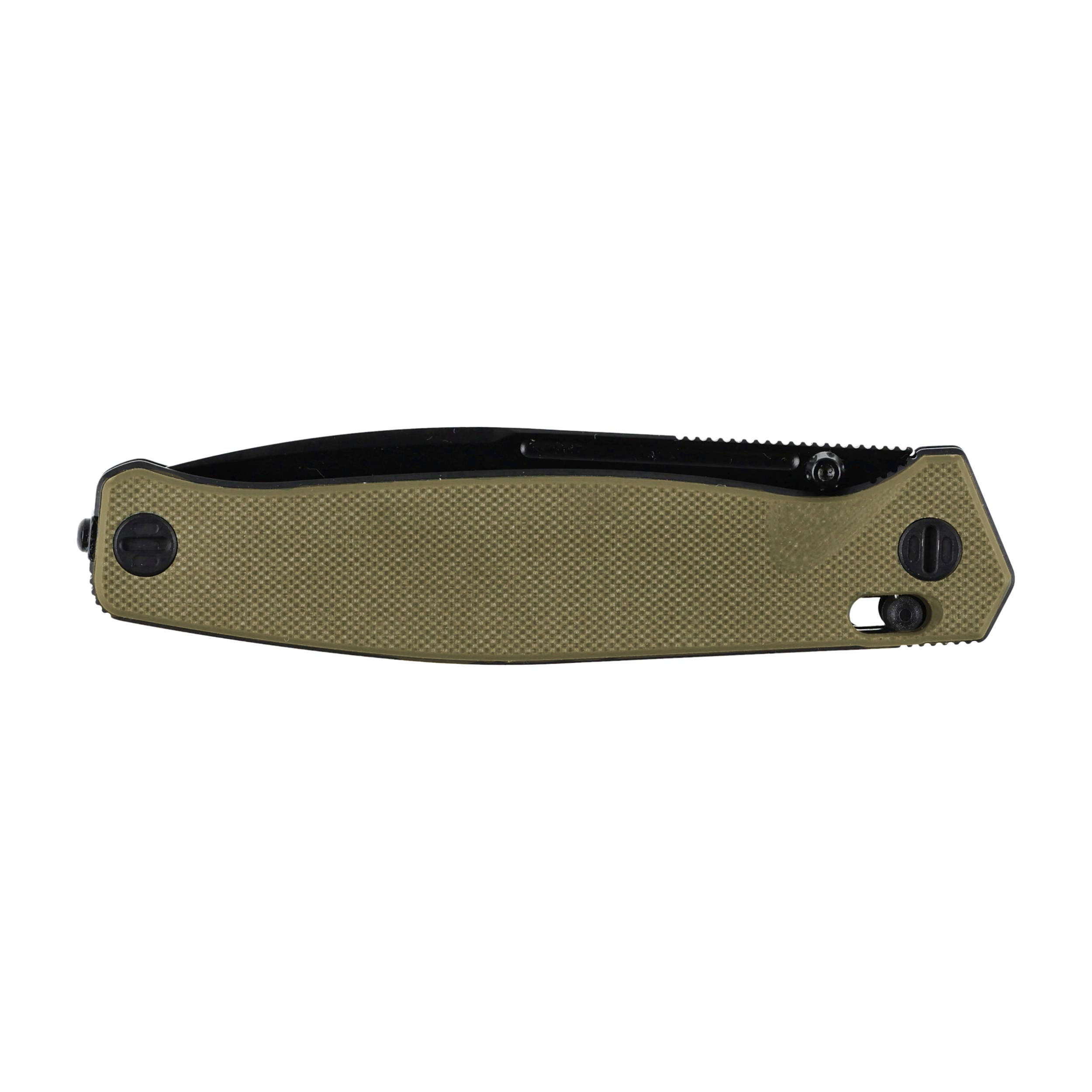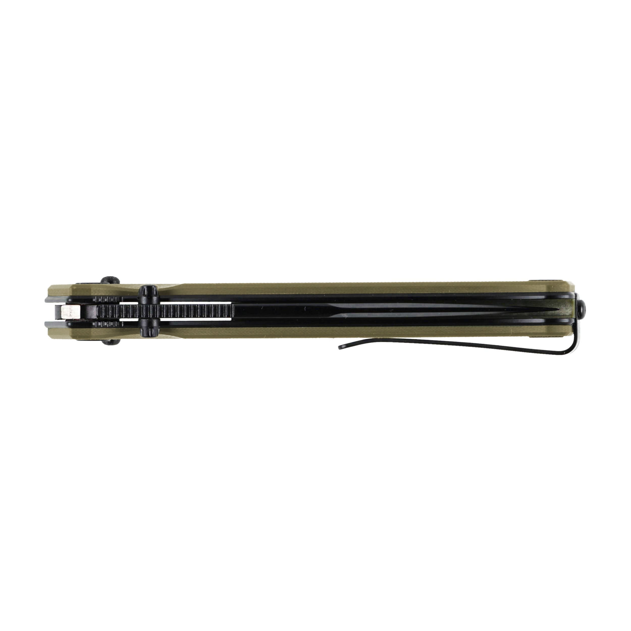Nóż posiada klingę typu Drop Point z czarną powłoką PVD. Grubość głowni zapewnia wysoką wytrzymałość, a płaski szlif gwarantuje doskonałą geometrię krawędzi tnącej oraz wydajność cięcia. Nóż otwiera się za pomocą obustronnie umieszczonego kołka pod kciuk (dual thumb stud). Pracę mechanizmu wspomagają podkładki z fosforobrązu. Górna część klingi posiada karbowane oparcie pod kciuk (upper jimping).