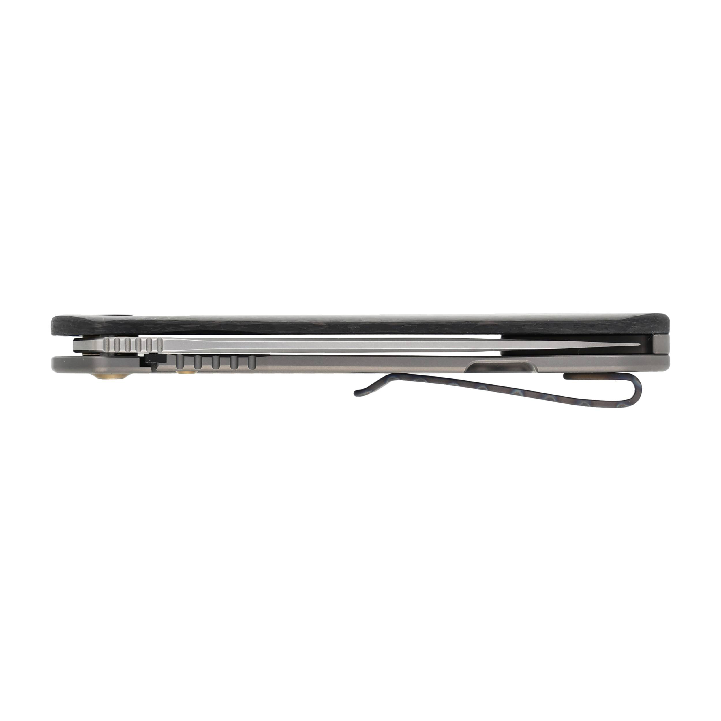 Rękojeść wykonano z połączenia włókna węglowego i tytanu. W efekcie jest lekka i odporna na uszkodzenia mechaniczne. Wygładzone krawędzie okładzin poprawiają pewność uchwytu i sprawiają, że nóż dobrze leży w dłoni. Producent zadbał również o wygodny transport noża, wyposażając go w jednostronny, tytanowy klips DC.