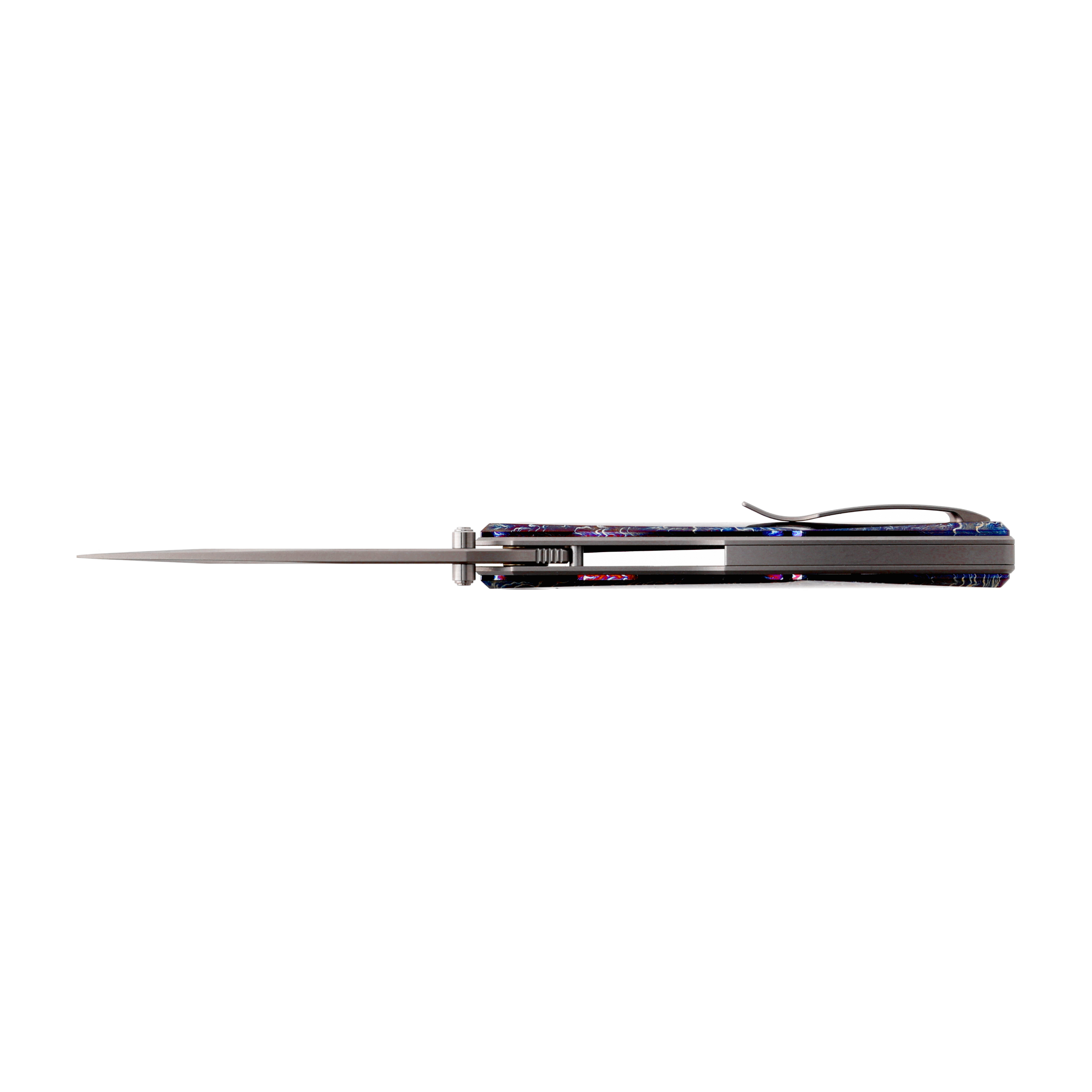 WE Knife Swordfin na tle innych noży wyróżnia się wzorzystą kolorową rękojeścią, która przykuwa wzrok innych miłośników ostrych narzędzi.