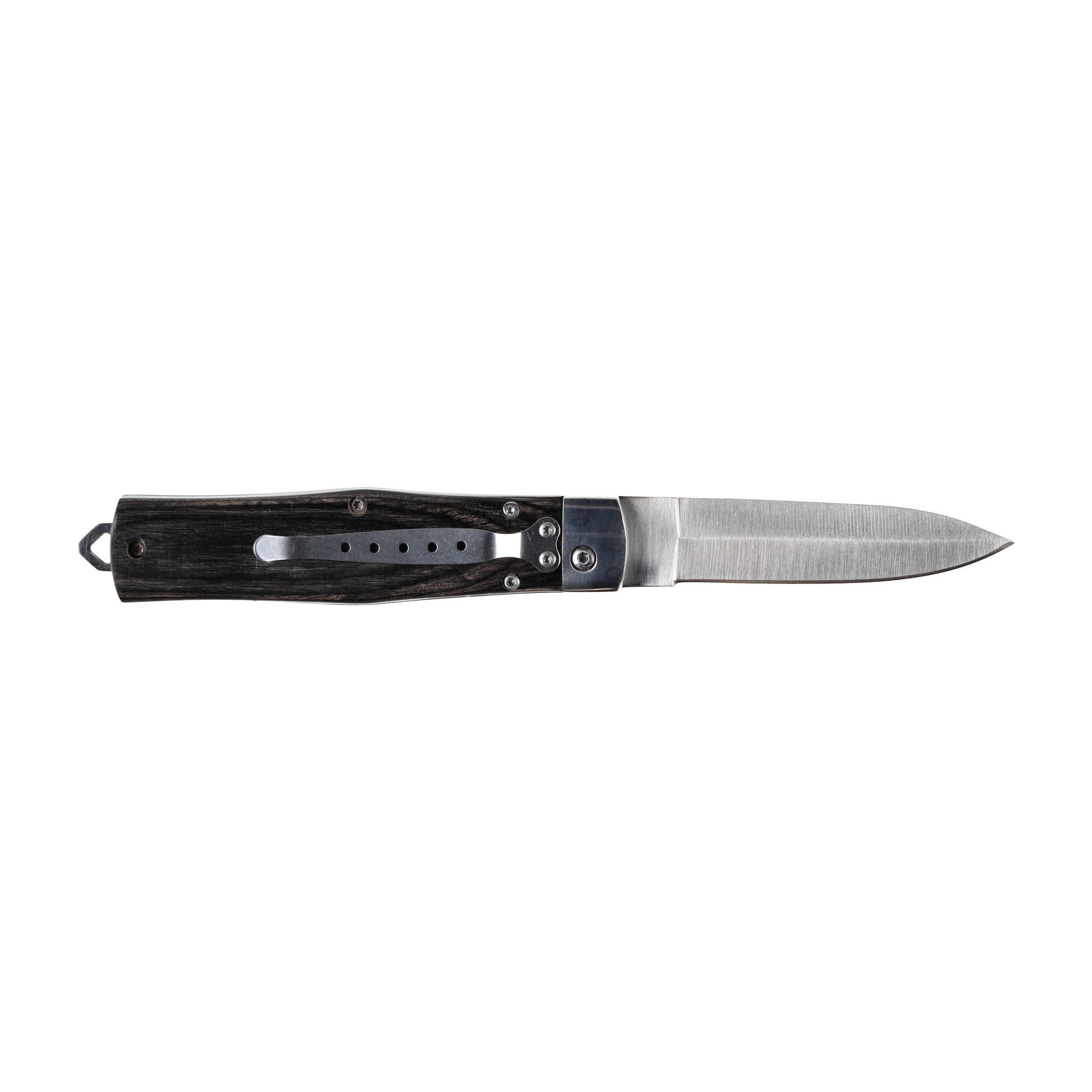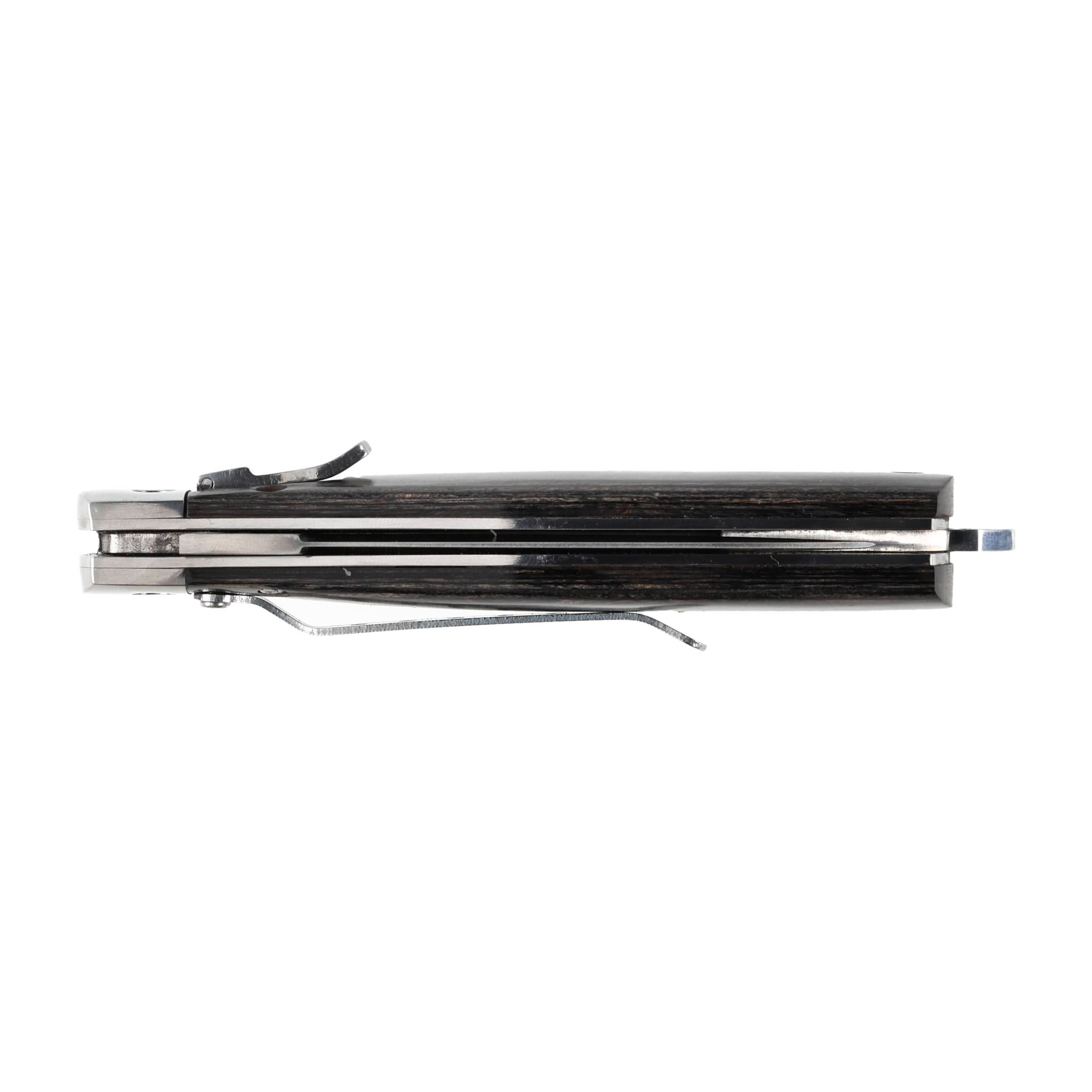 Ergonomiczna i smukła rękojeść w nożu sprężynowym została wyposażona w stylowe drewniane okładziny, które dodatkowo podkreślają outdoorowy charakter Kandara N160. Do prawej okładziny został przymocowany klips umożliwiający komfortowe przenoszenia noża w kieszeni spodni.