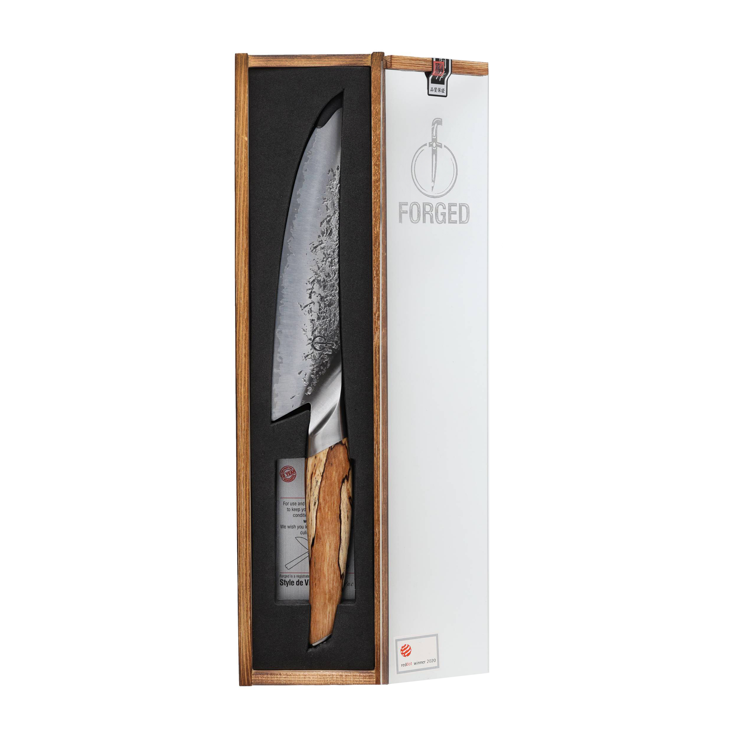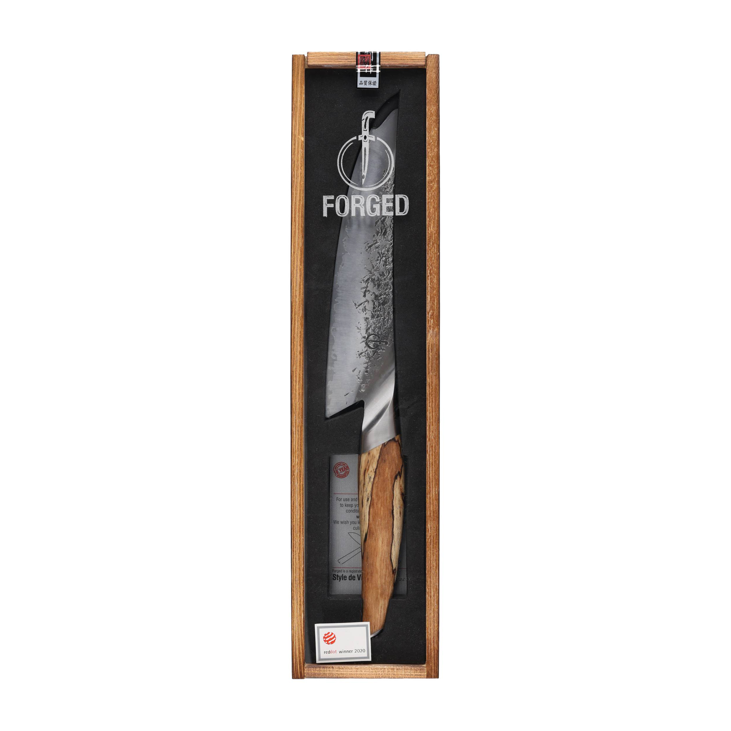 Forged Katai to wariacja producenta w temacie noża szefa kuchni – skonstruowany bliźniaczo do wykonanego w identycznej specyfikacji modelu Chef’s Knife, lecz wyposażony w bardziej anatomiczną rękojeść. Ta może zdecydowanie przypaść do gustu osobom, preferującym bardziej dopasowane do kształtu dłoni rozwiązania, tworzące jednorodną powierzchnię styku. Wydatny brzuch krawędzi tnącej sprawia, że nóż jest wyjątkowo przyjemny w użytkowaniu – z łatwością posiekamy nim zioła, przetaczając głownię po desce, ale również z łatwością wyfiletujemy sporych rozmiarów rybę. Wykorzystanie laminatu stali VG-10 zapewnia dobre trzymanie ostrości połączone z niezwykle łatwym ostrzeniem i świetną odpornością na korozję.