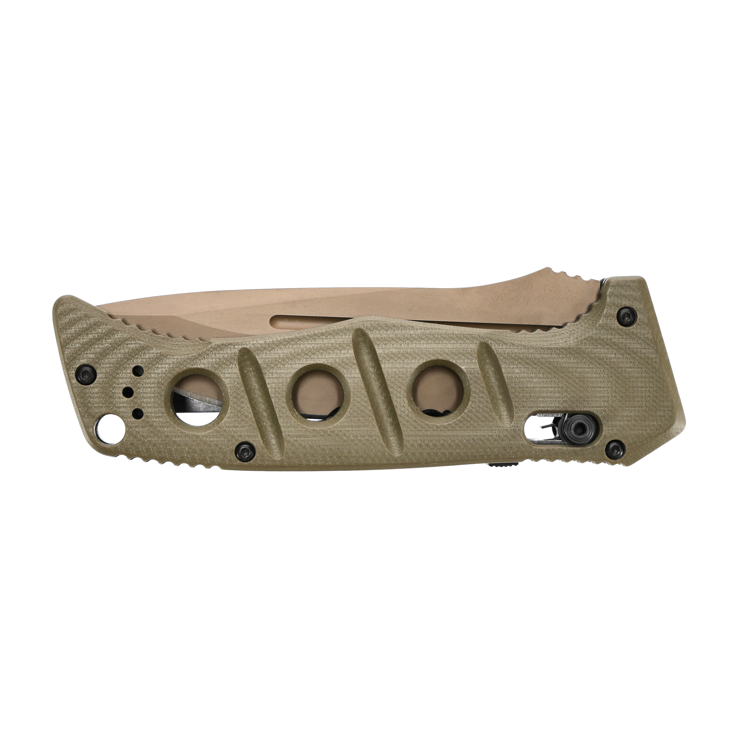 Benchmade 2750SFE-2 Auto Adamas ma okładziny z piaskowego laminatu G10 wykonane precyzyjną techniką 3D. Zastosowany laminat szklano-epoksydowy cechuje się niewielką masą, wysoką wytrzymałością mechaniczną, odpornością na wodę, zmianę temperatur, a także działanie wielu kwasów i rozpuszczalników. Konturowany kształt w połączeniu z poprzecznym frezowaniem i szorstką fakturą tworzywa zapewniają doskonałą przyczepność noża oraz komfort użytkowy. Półotwarta konstrukcja rękojeści ułatwia utrzymywanie noża w czystości.