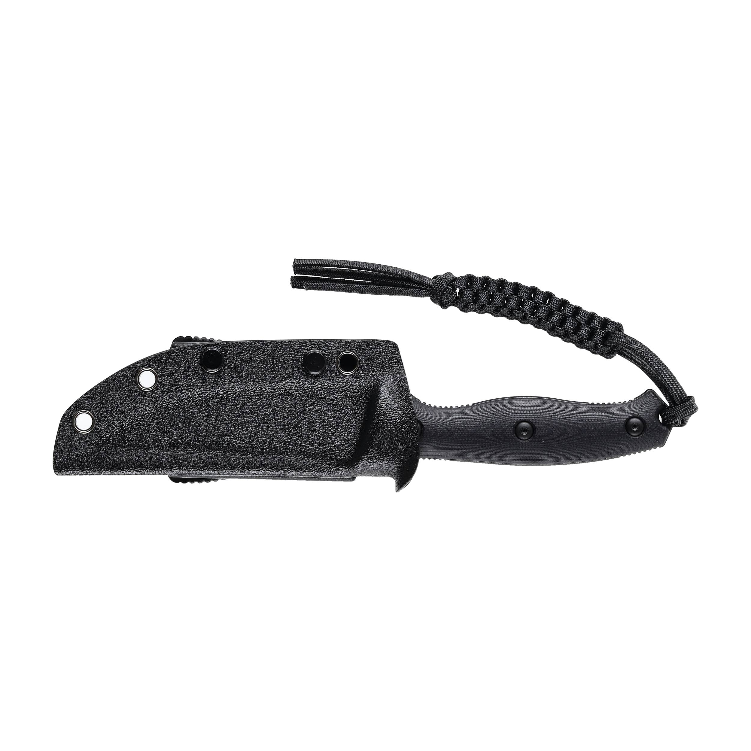 Rękojeść o ergonomicznym profilu otrzymała okładziny z laminatu G10. Ten niezwykle wytrzymały i odporny chemicznie materiał sprawdza się doskonale w każdych warunkach, oferując pewny chwyt oraz trwałość. W połączeniu z naniesionym na grzbiet noża jimpingiem gwarantuje on niezwykle stabilną pracę, nawet w mokrej lub brudnej dłoni. Polimerowa pochewka z regulowanym klipsem na pas jest niezwykle łatwa w utrzymaniu w czystości oraz co najważnejsze – skutecznie zabezpiecza nóż przed zgubieniem.