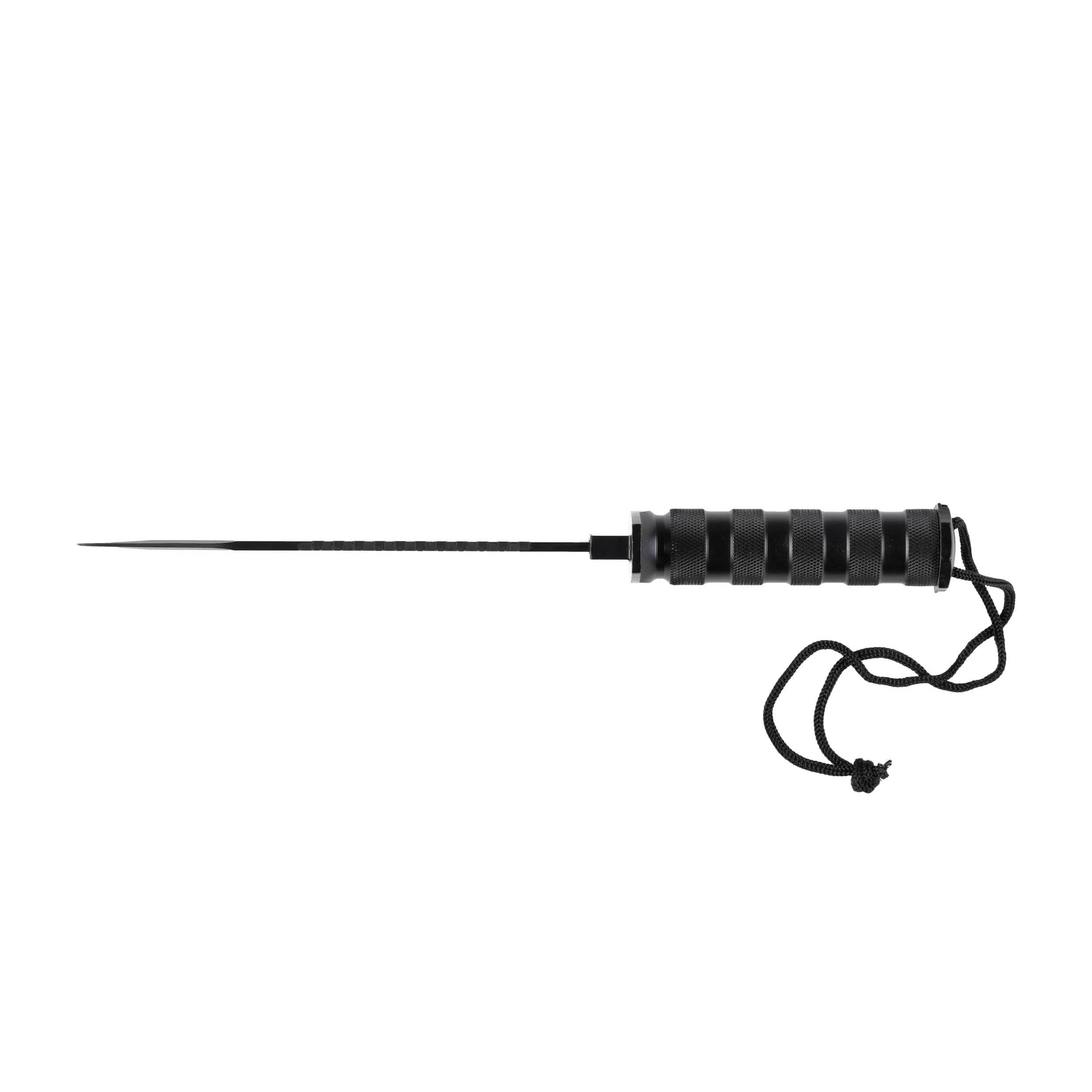 Użytkownik otrzymuje wraz z nożem pochwę owiniętą solidnym nylonowym sznurkiem pełniącym rolę rękojeści procy posiada możliwość odwinięcia sznurka.