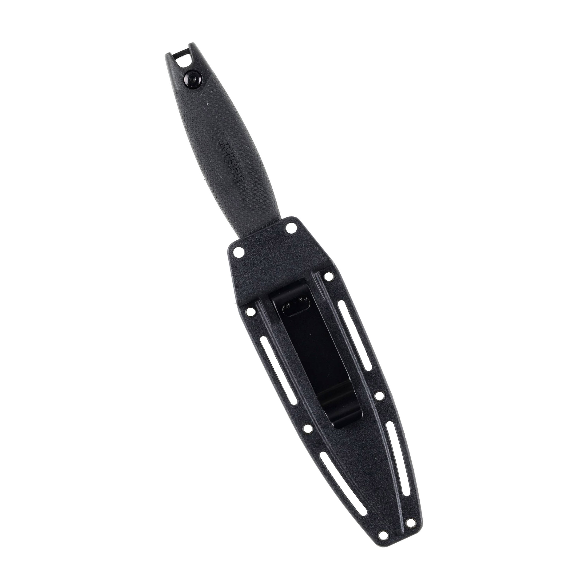 W komplecie znajduje się solidna pochewka z polimeru, wykonywana metodą wtryskową. Przed wysunięciem lub zgubieniem narzędzia chroni konstrukcja pochewki na tzw. wcisk. W zależności od potrzeb nóż może być przenoszony na szyi, w bucie lub oporządzeniu.