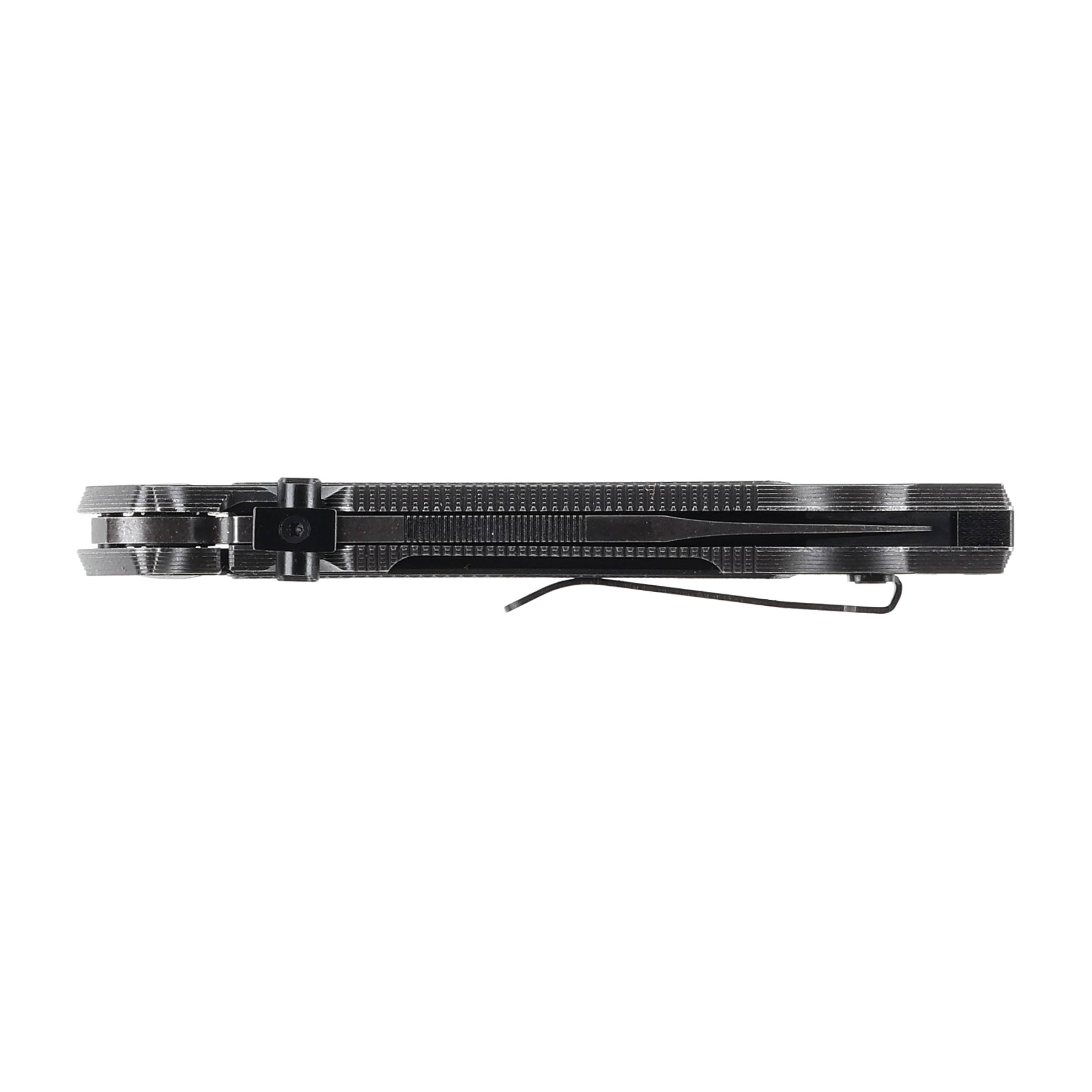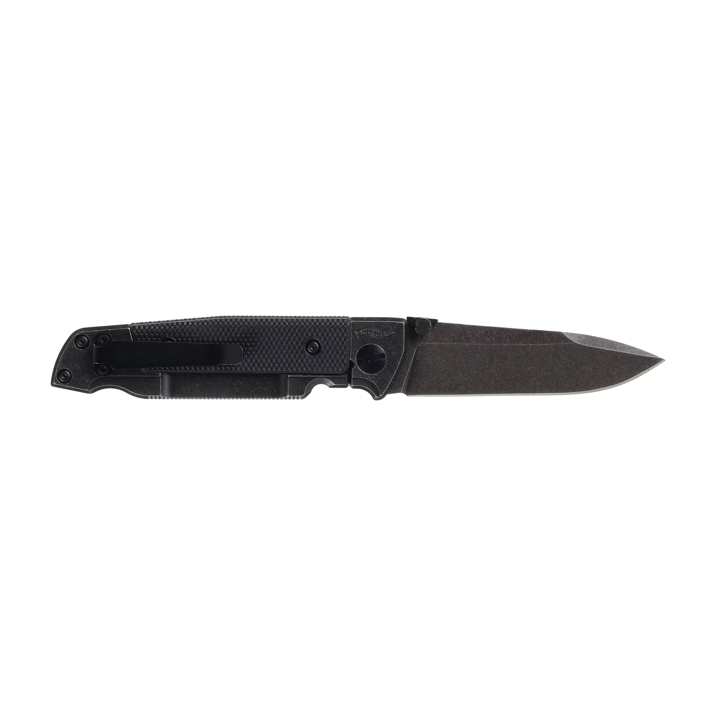 Nóż ma stalowe okładziny wykończone metodą black stonewash i wzbogacone wstawkami z tworzywa FRN. Antypoślizgowe teksturowanie nakładek jest identyczne z tym jakie producent nanosi na chwyt pistoletu Walther Q5. Drobna kratka zapewnia doskonałą przyczepność i zapobiega wyślizgiwaniu się noża ze spoconej lub mokrej dłoni. Na rękojeści zamocowano płaski klips z możliwością przełożenia na drugą stronę pozwalający na dyskretne noszenia noża w kieszeni, pasie lub ekwipunku.