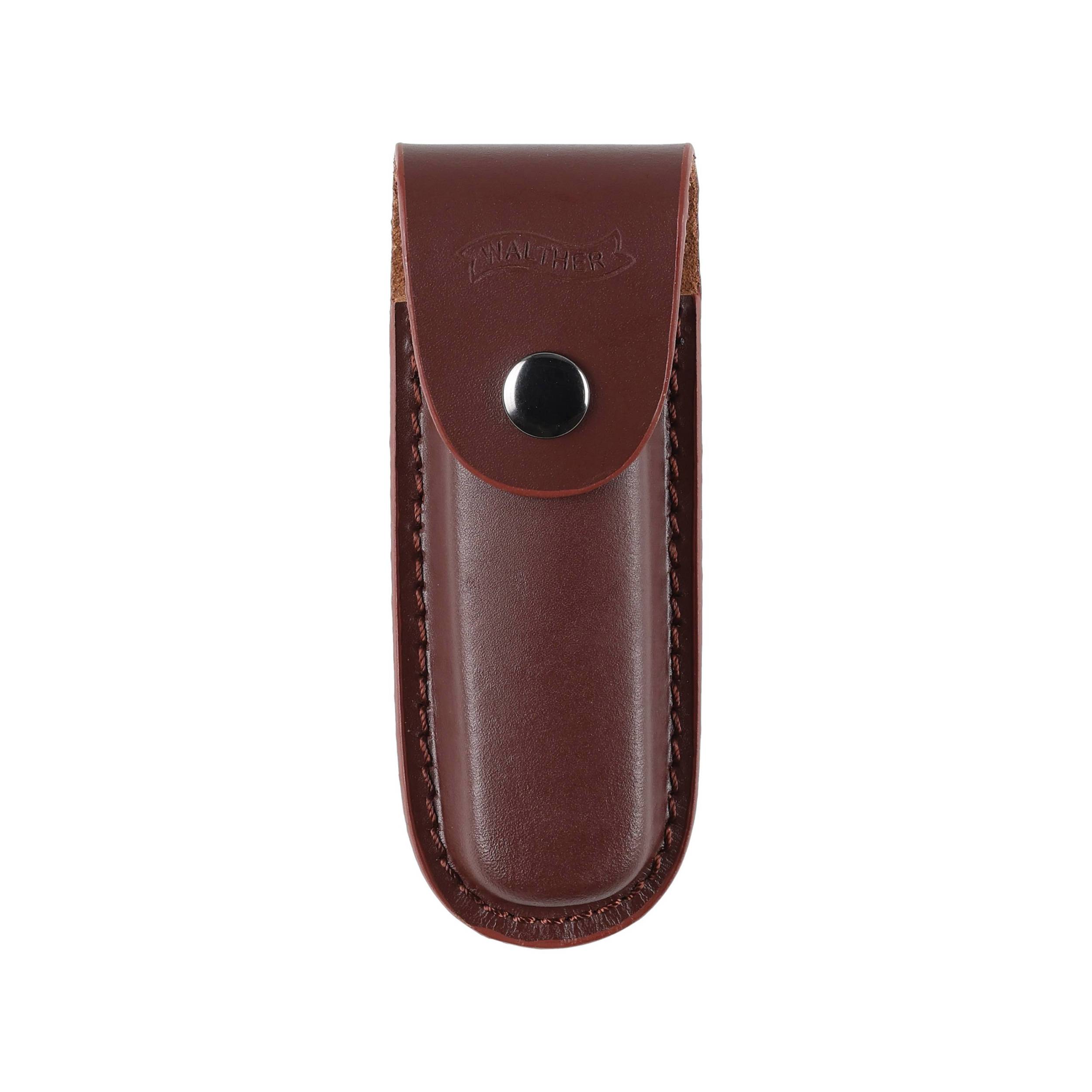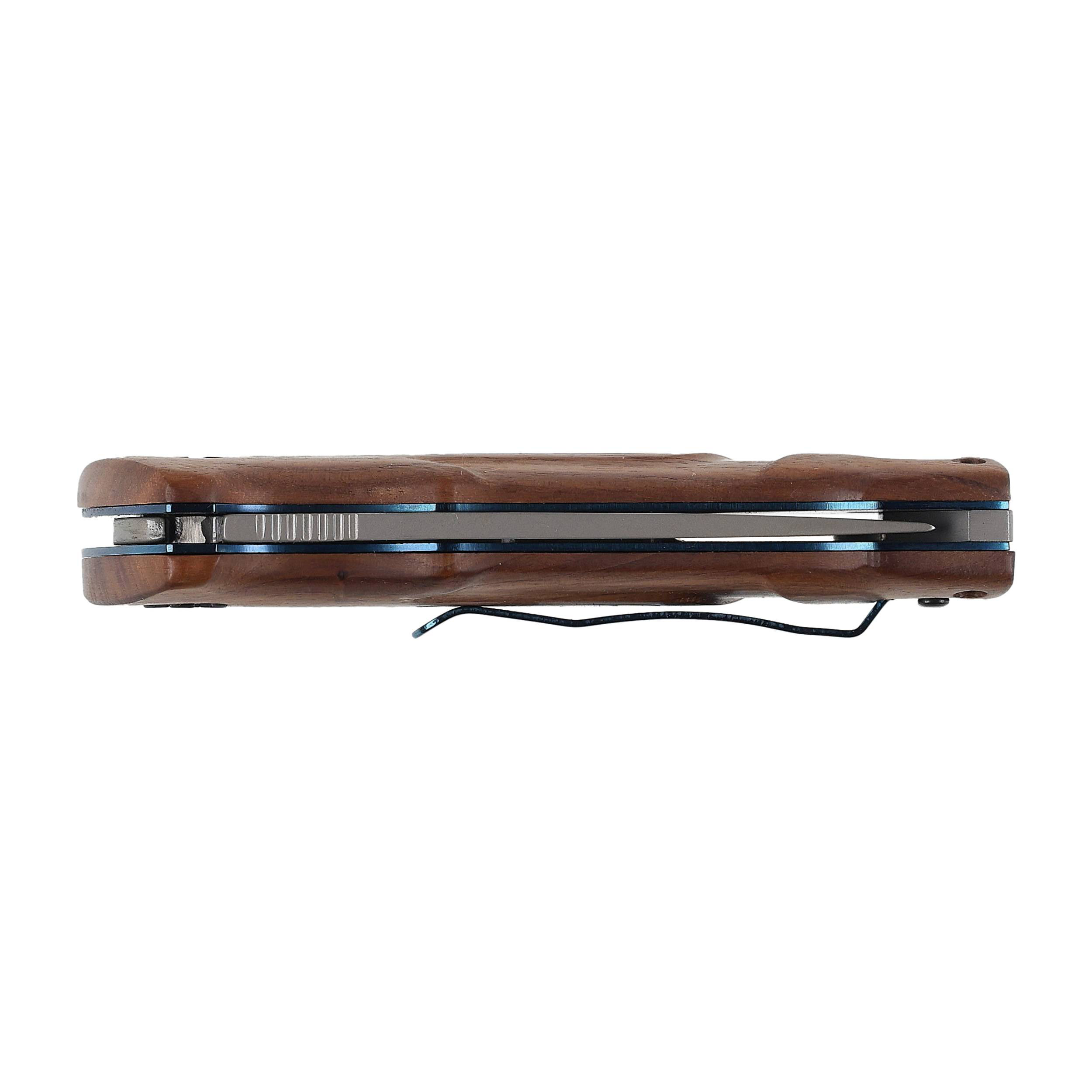 Nóż ma eleganckie okładziny z drewna orzecha włoskiego o matowym wykończeniu. Rękojeść ma profilowany kształt, z wyraźnym wycięciem na palec, co skutecznie poprawia chwyt noża i komfort jego użytkowania. Klasyczne wzornictwo subtelnie przełamują anodowane na niebiesko linersy oraz klips, który można mocować po obu stronach rękojeści. Do noszenia noża służy skórzane etui z szeroką szlufką na pas oraz zapięciem na napę.