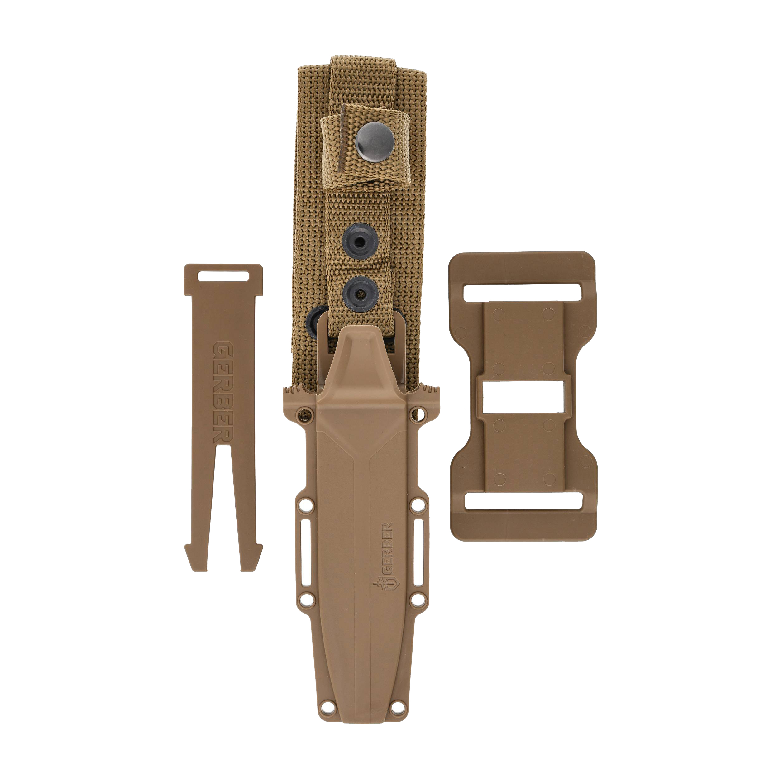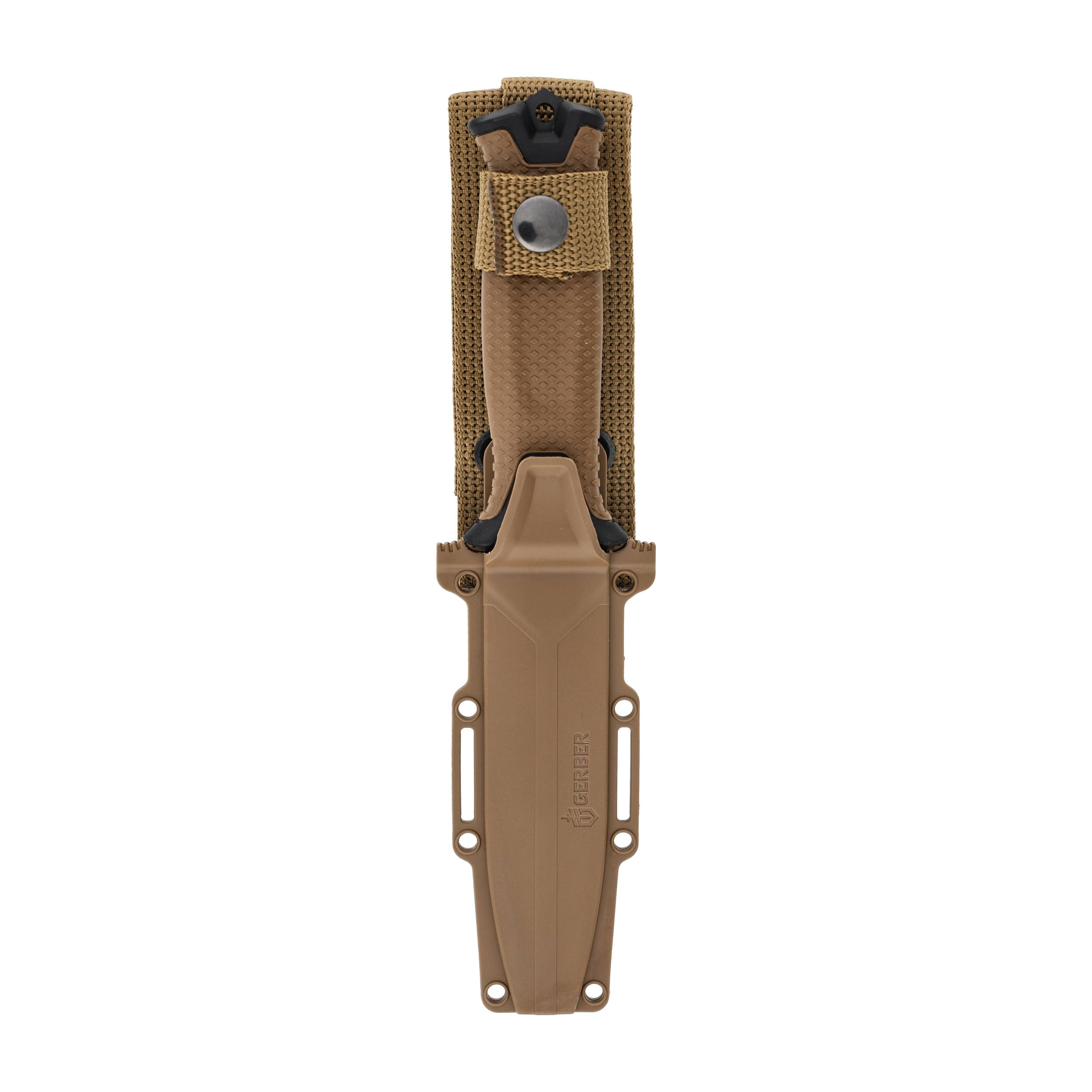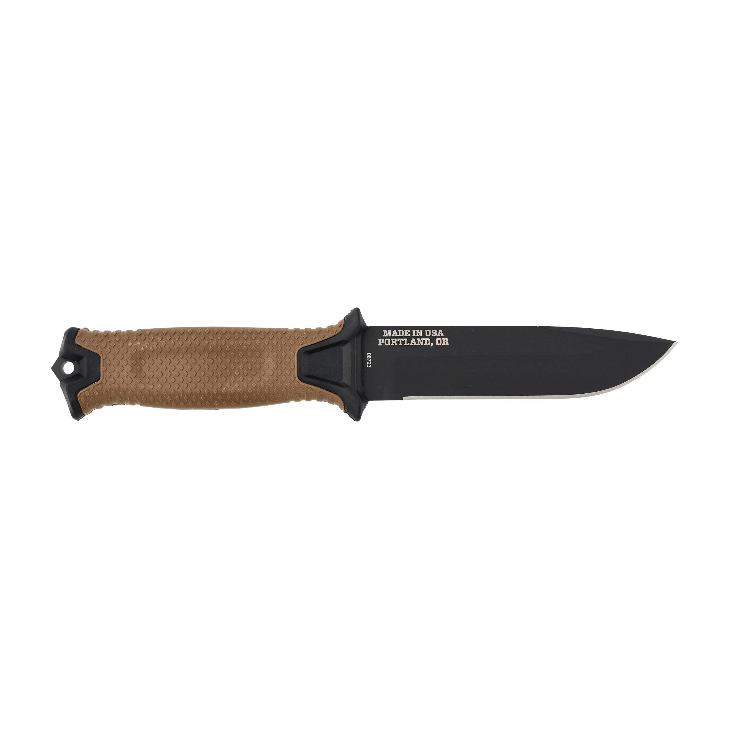 Gerber Strongarm FE coyote to nóż taktyczno-survivalowy z pełnym trzpieniem, w którym zastosowano głownię drop point ze stali nierdzewnej 420HC, obustronny jelec oraz nylonową rękojeść wzmacnianą włóknem szklanym.