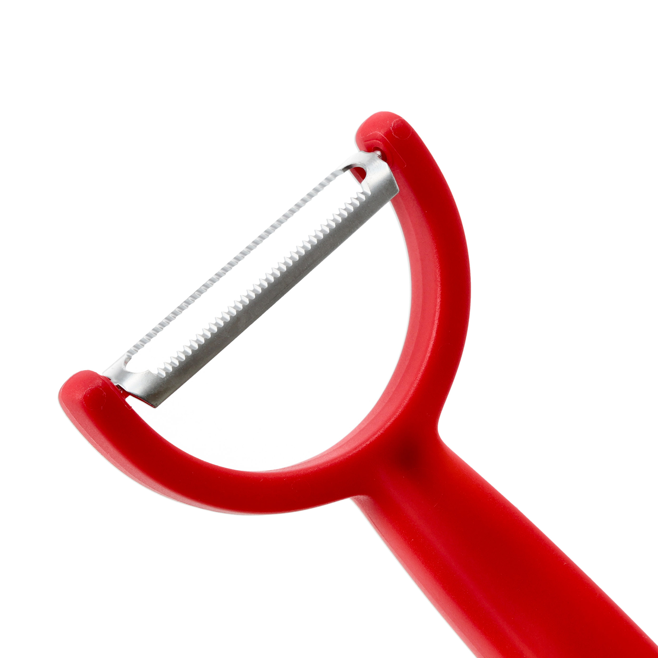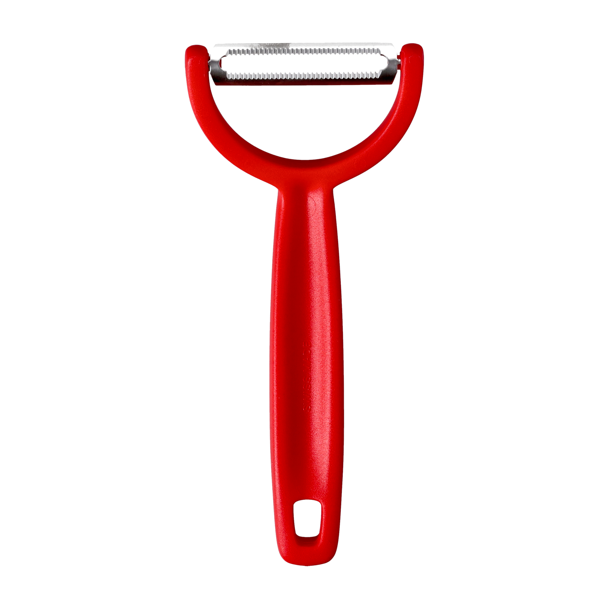Uniwersalna obieraczka Victorinox YPSO to praktyczne narzędzie kuchenne służące do wygodnego i szybkiego obierania warzyw oraz owoców z miękkich i twardych skórek. Zaprojektowana została z ostrzem w ułożeniu poziomym, zyskując tym samym inną płaszczyznę ścinającą. Antypoślizgowa rękojeść o ergonomicznym profilu wykonana jest z solidnego tworzywa i ma dodatkowo otwór do zawieszenia. Ruchome ostrze wykonano ze stali nierdzewnej. Obieraczkę można myć pod bieżącą wodą oraz w zmywarce. Model jest w kolorze czerwonym.