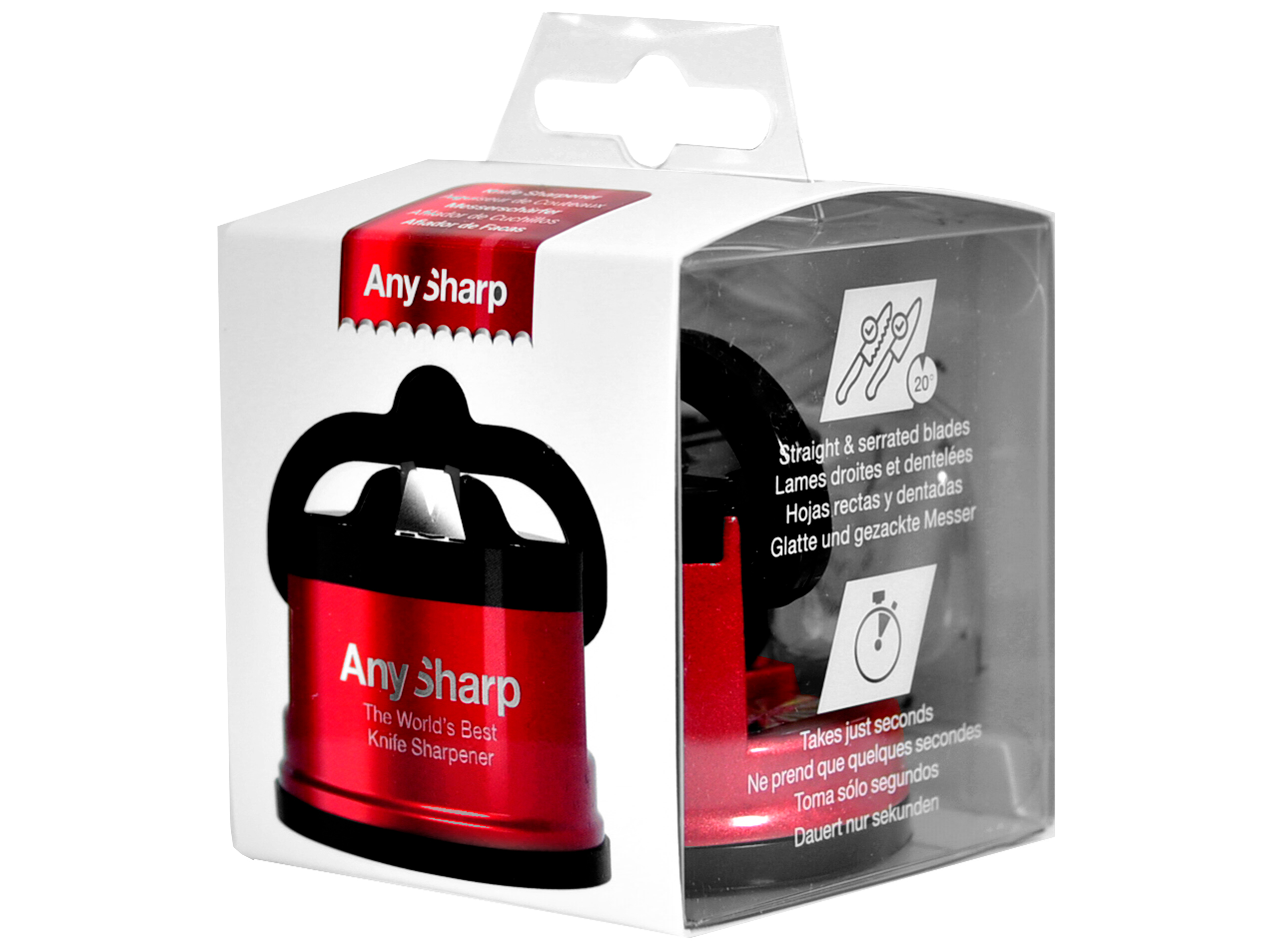 Czerwona ostrzałka AnySharp Pro to wyjątkowo proste w obsłudze, a jednocześnie stosunkowo funkcjonalne narzędzie. Ta uniwersalna ostrzałka pozwoli nam szybko i sprawnie naostrzyć zarówno noże gładkie, jak i ząbkowane (oprócz specjalnych noży z drobnymi ząbkami do steków). Czerwona ostrzałka AnySharp Pro poradzi sobie z nożami wykonanymi ze stali nierdzewnej, ze stali węglowej oraz z tytanu.