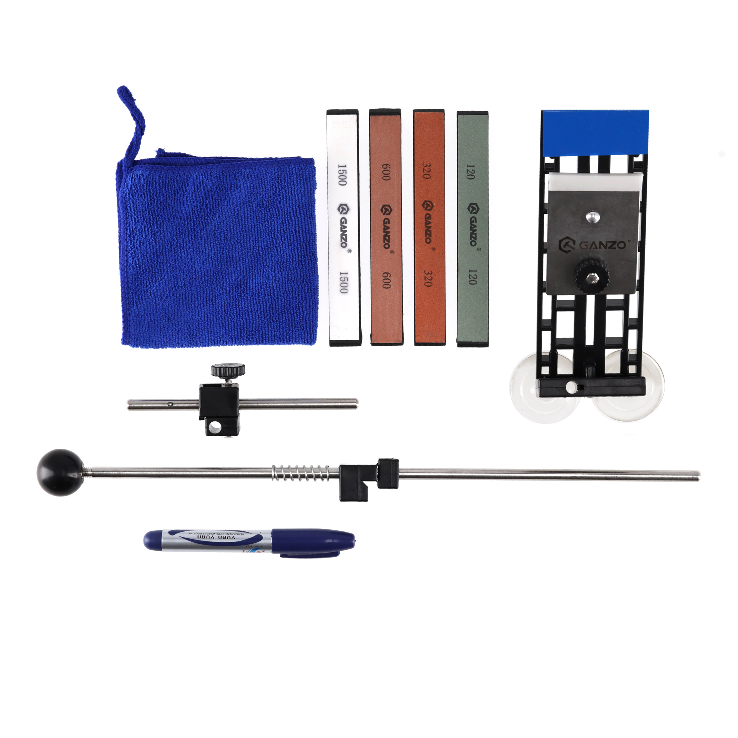 Zestaw Ganzo Touch Pro  zawiera cztery kamienie ceramiczne o gradacji 120, 320, 600, 1500. System ostrzący wraz z prowadnicami oraz dodatki takie jak marker oraz ściereczka czyszcząca. Całość zapakowana  jest w funkcjonalny pokrowiec.