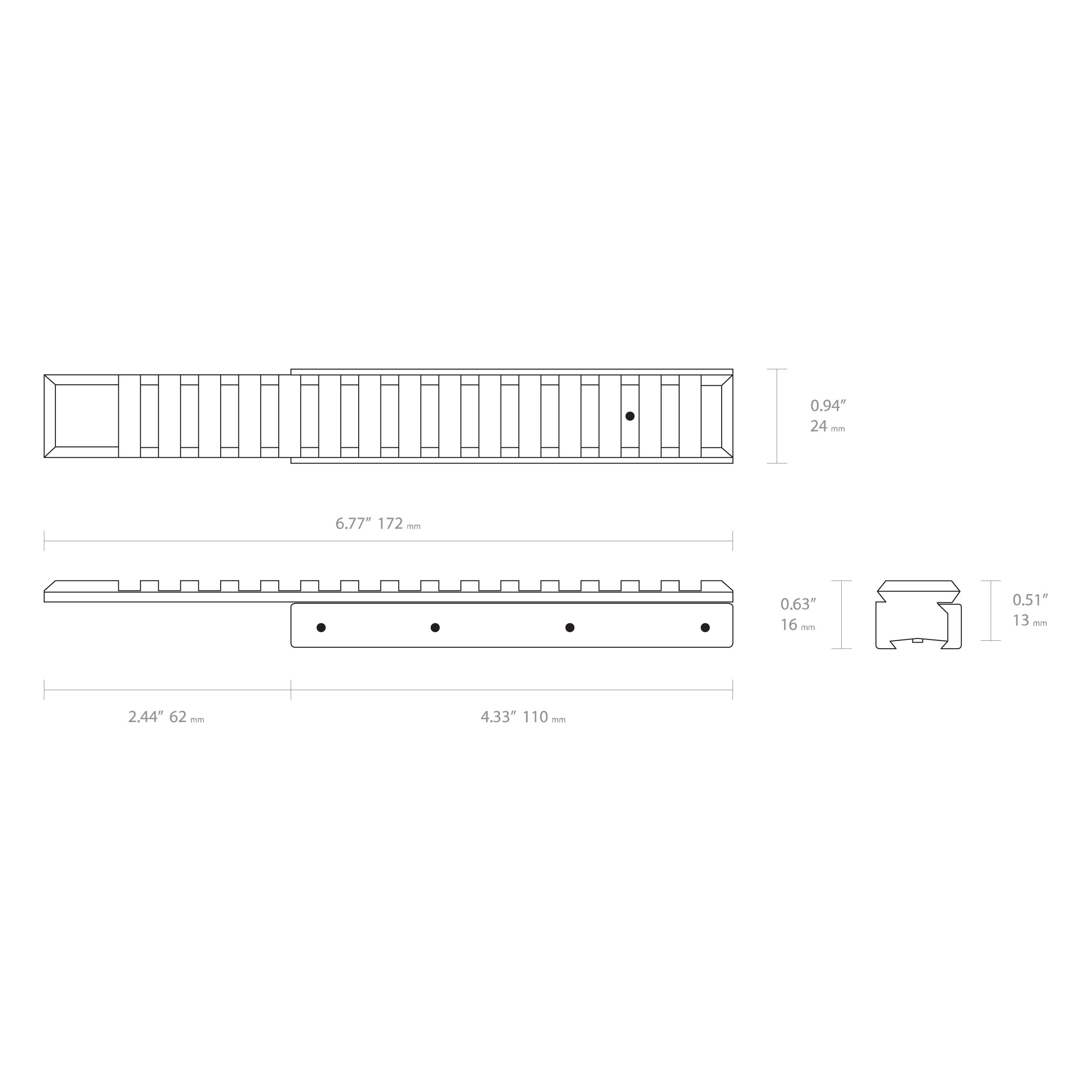 Adapter Picatinny o długości całkowitej wynoszącej 172 mm i wysokości 16 mm pozwala na stosowanie optyki o różnej wielkości obiektywu. Montaż pasuje na większość szyn 9-11 stosowanych np. na broni pneumatycznej.