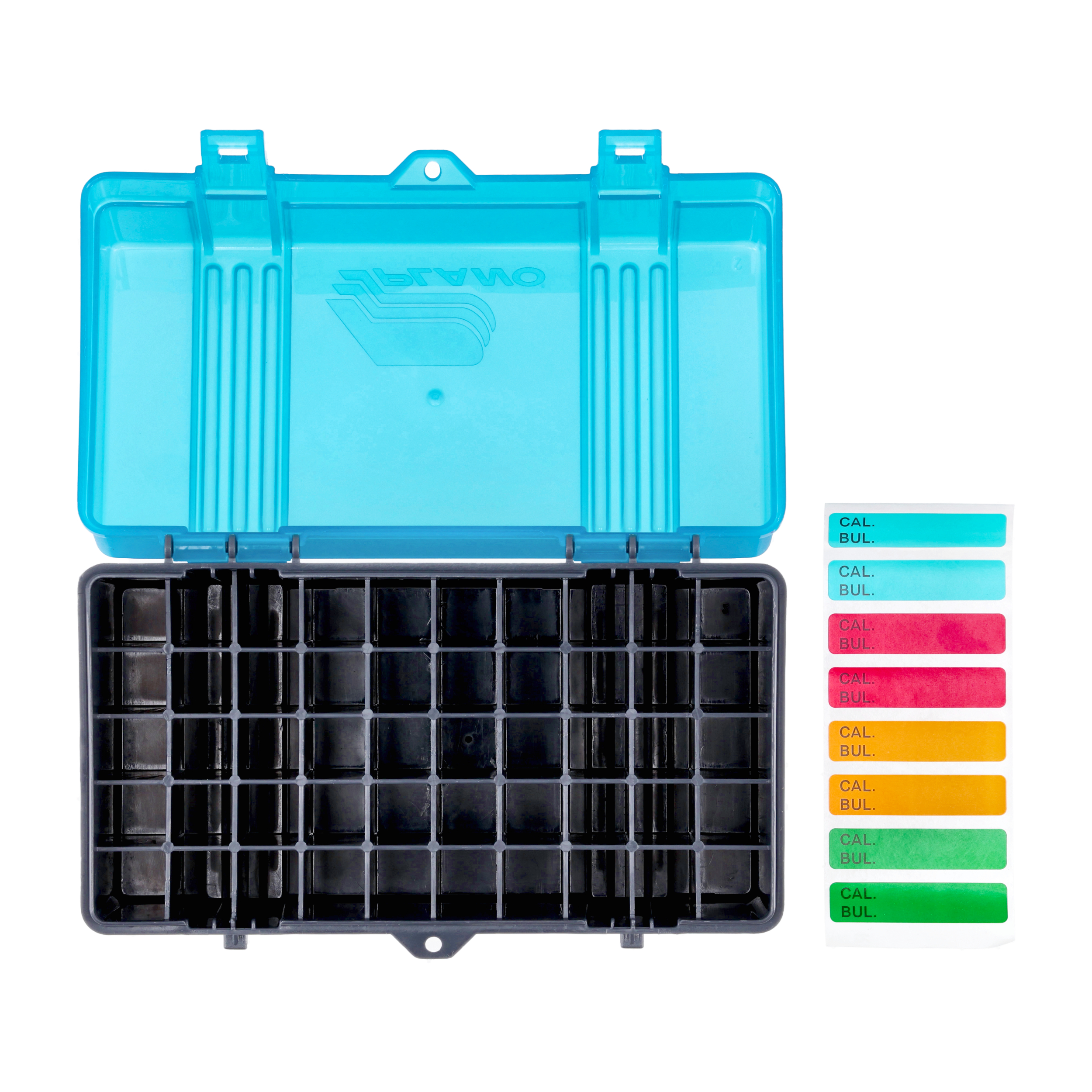 Pudełko na amunicję zostało wyposażone w przegródki, które ułatwiają posegregowanie naboi. W zestawie użytkownik otrzymuje naklejki do oznaczenia odpowiedniego typu amunicji.