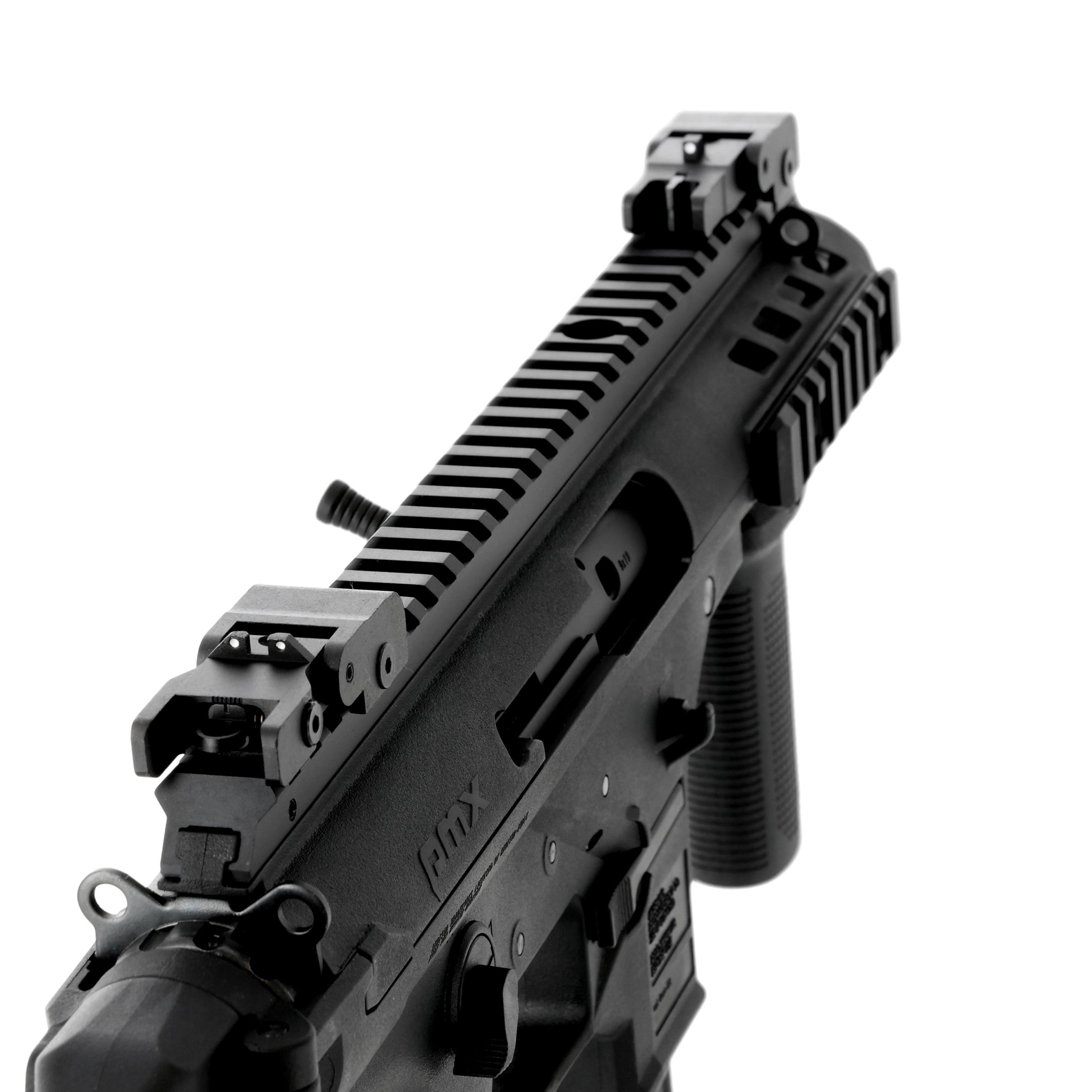 W replice Beretta PMX fabrycznie zostały zamontowane składane mechaniczne przyrządy celownicze. Dzięki górnej szynie RIS możemy zamocować dodatkowo celowniki kolimatorowe lub holograficzne, które ułatwią precyzyjne strzelanie.
