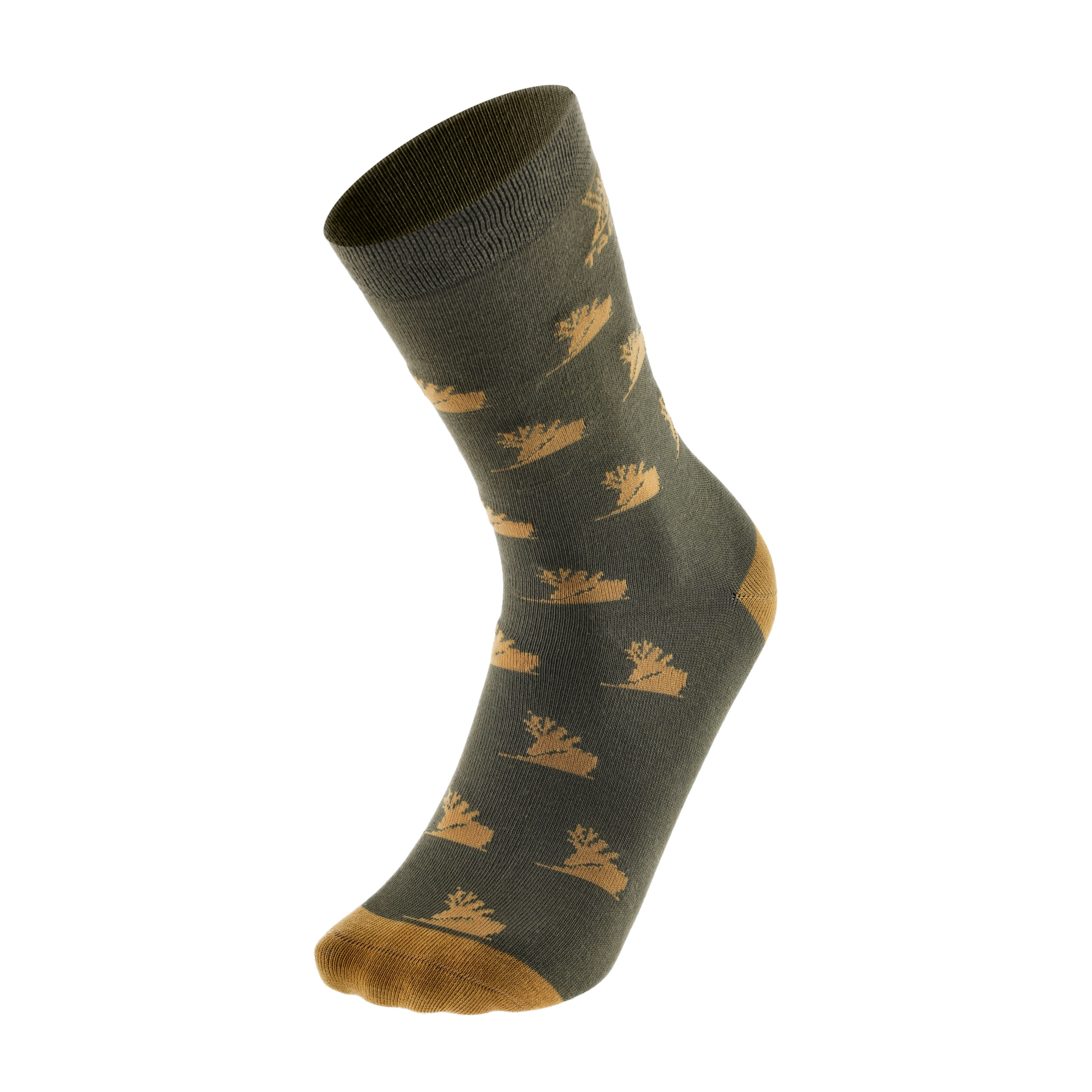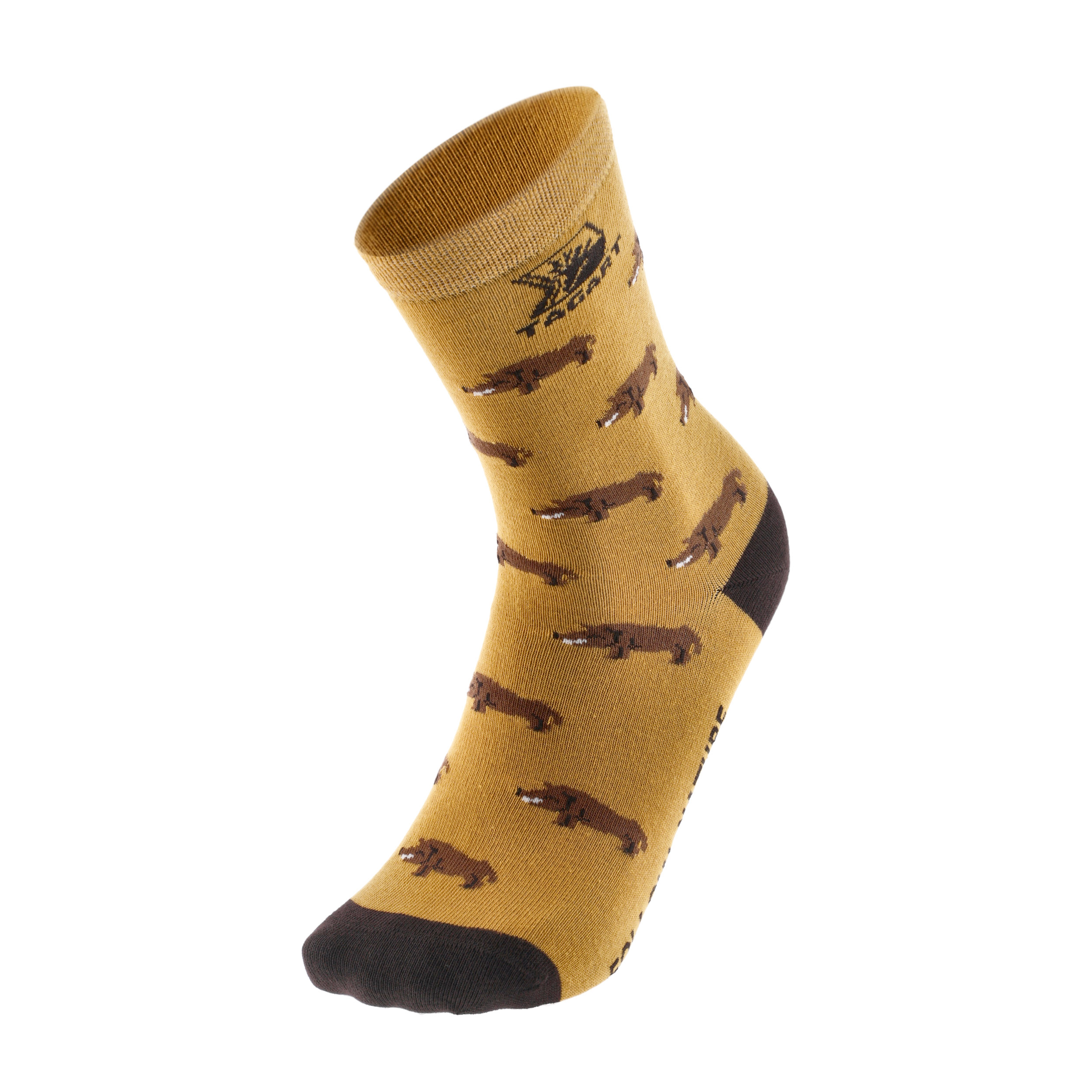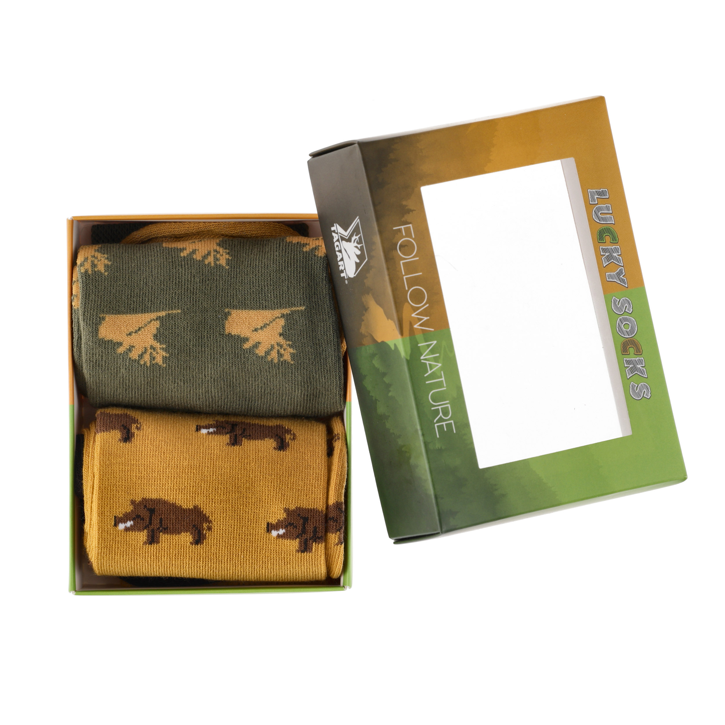 Targart SUMMER BOAR to tematyczne skarpetki męskie do codziennego użytku o barwnym i jaskrawym wzornictwie nawiązującym do myśliwskiego hobby. Przyjemna dla skóry tkanina na bazie bawełny została wzbogacona o domieszki poliamidu i lycry dla lepszego odprowadzania wilgoci. Wzmocnione strefy na palcach i piętach sprawiają, że skarpety nie ulegają szybkiemu przetarciu. Zestaw składa się z dwóch par w barwach dominujących żółtej i brązowej.