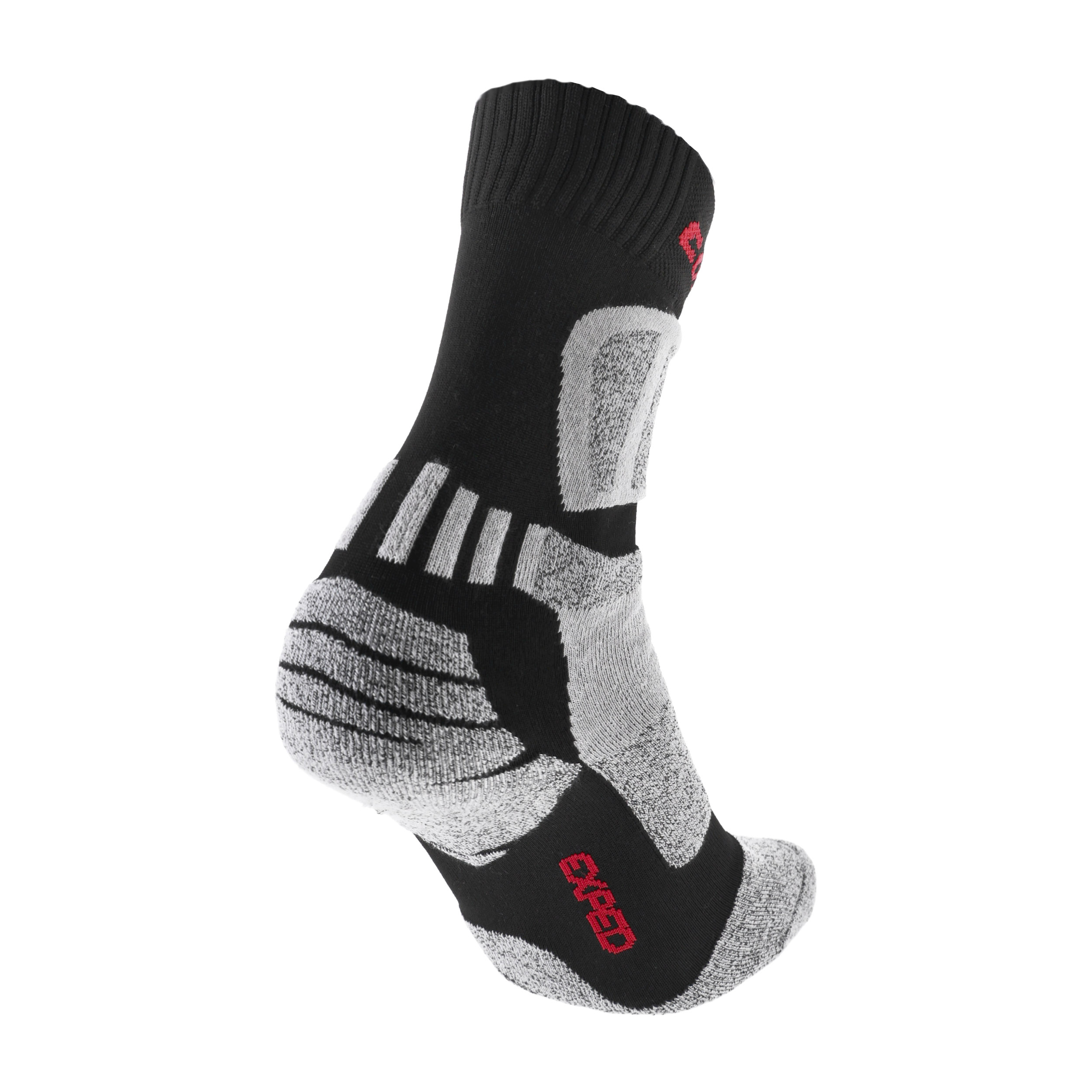 Skarpety wykonane są z poliestru DryTex Comfort, charakteryzującego się trwałością i wytrzymałością na uszkodzenia mechaniczne. Tkanina posiada również właściwości hydrofobowe, przez co bardzo dobrze odprowadza wilgoć od skóry. W mieszance materiału znajduje się także mikrowłókno polipropylenowe Siltex AG+, wzbogacone jonami srebra. Dzięki temu niwelowane są bakterie i drobnoustroje odpowiedzialne za powstawanie nieprzyjemnego zapachu.