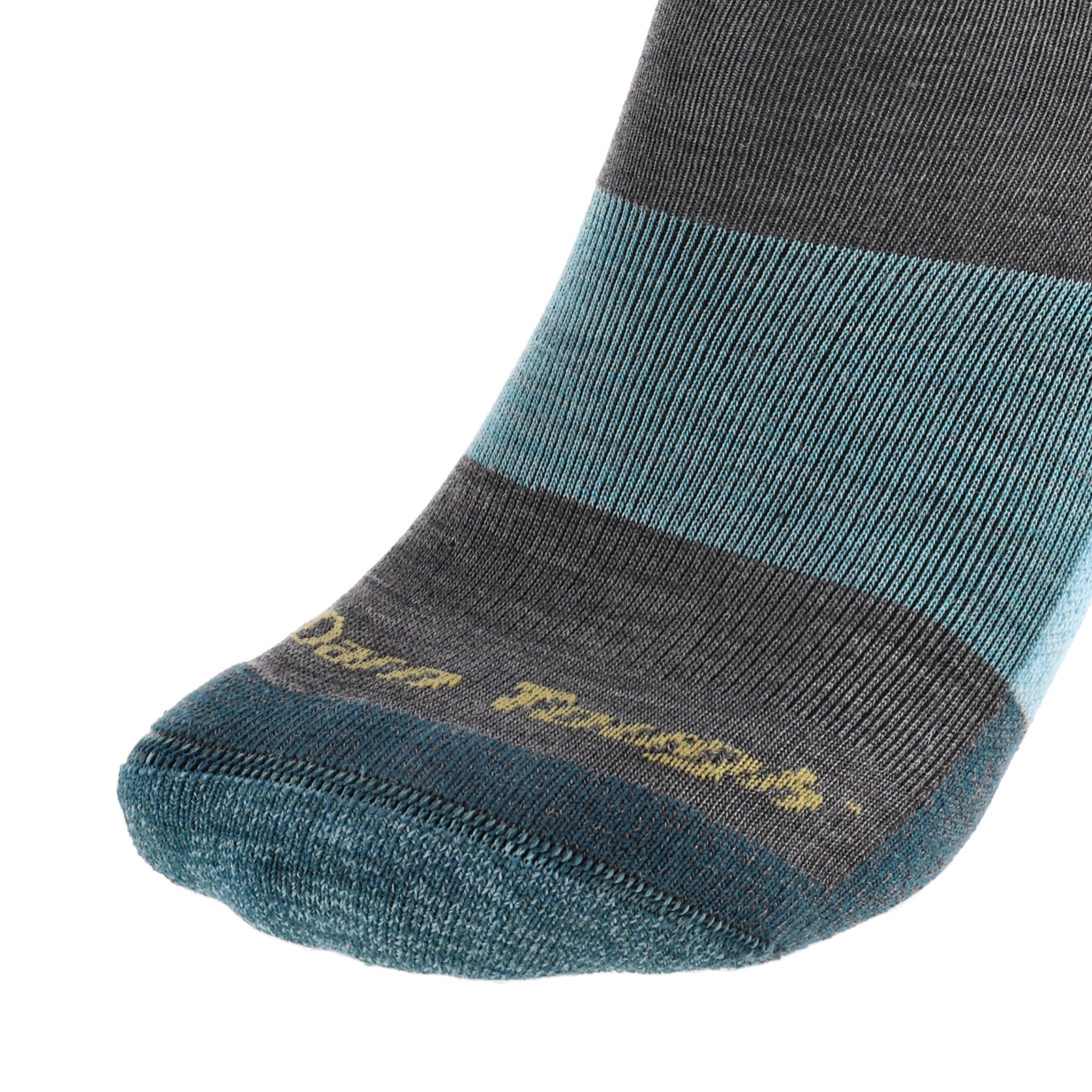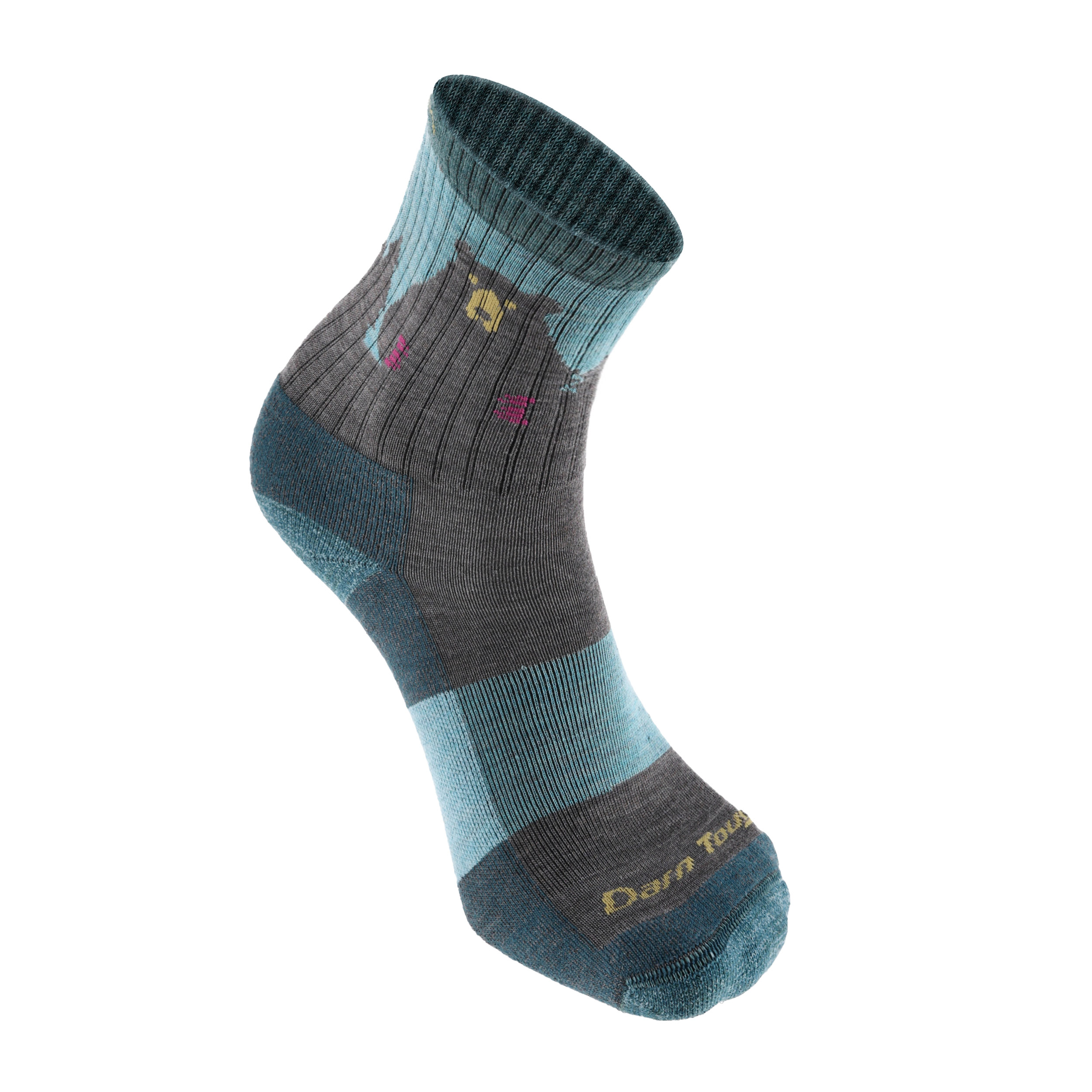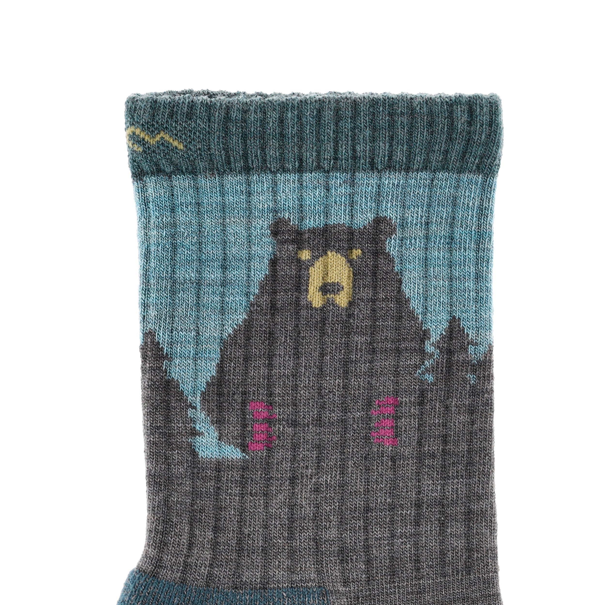 Skarpety trekkingowe damskie Darn Tough Bear Town z motywem graficznym sympatycznego niedźwiedzia w odcieniach niebieskiego koloru o średniej wysokości idealnie dopasują się do niskich i średnich butów turystycznych.