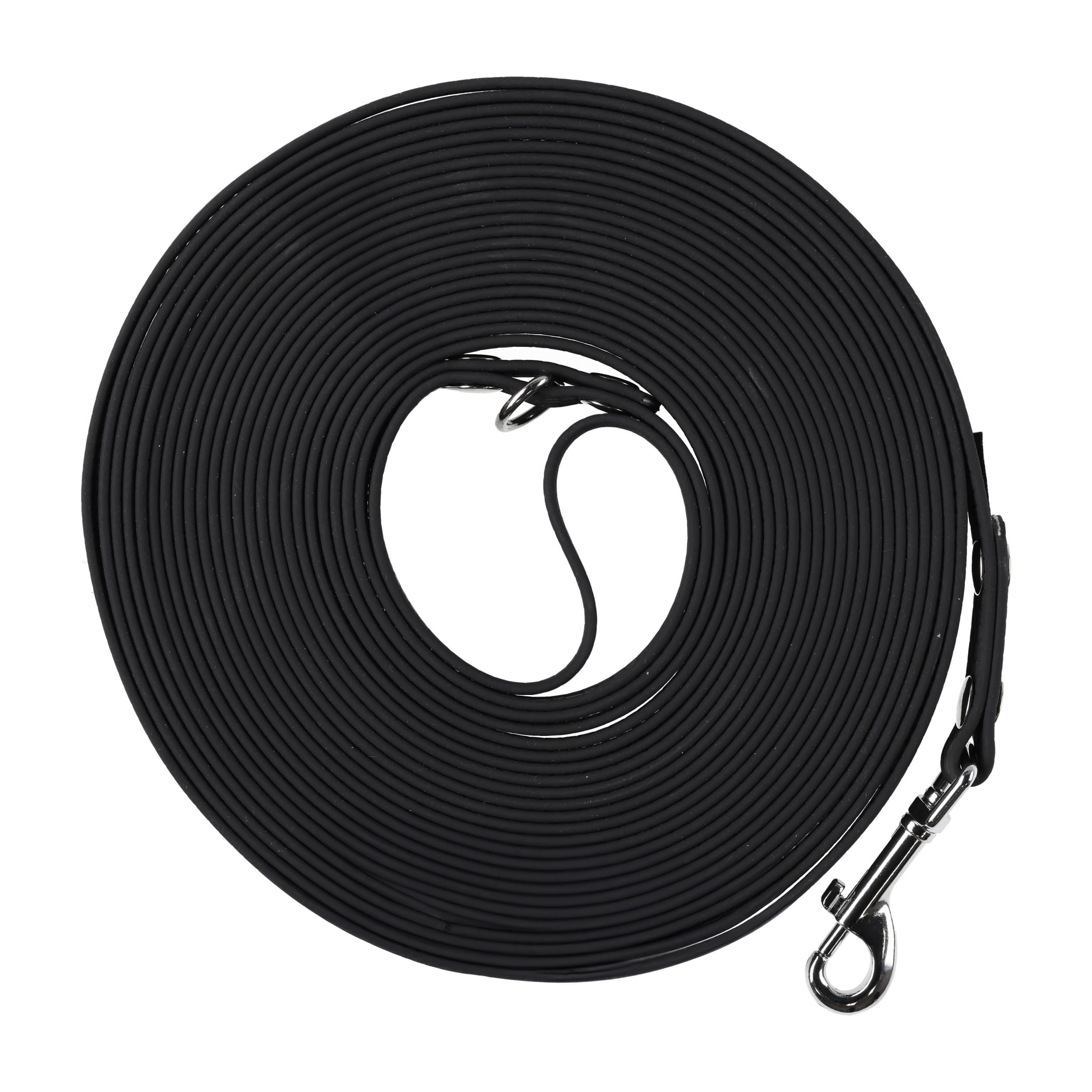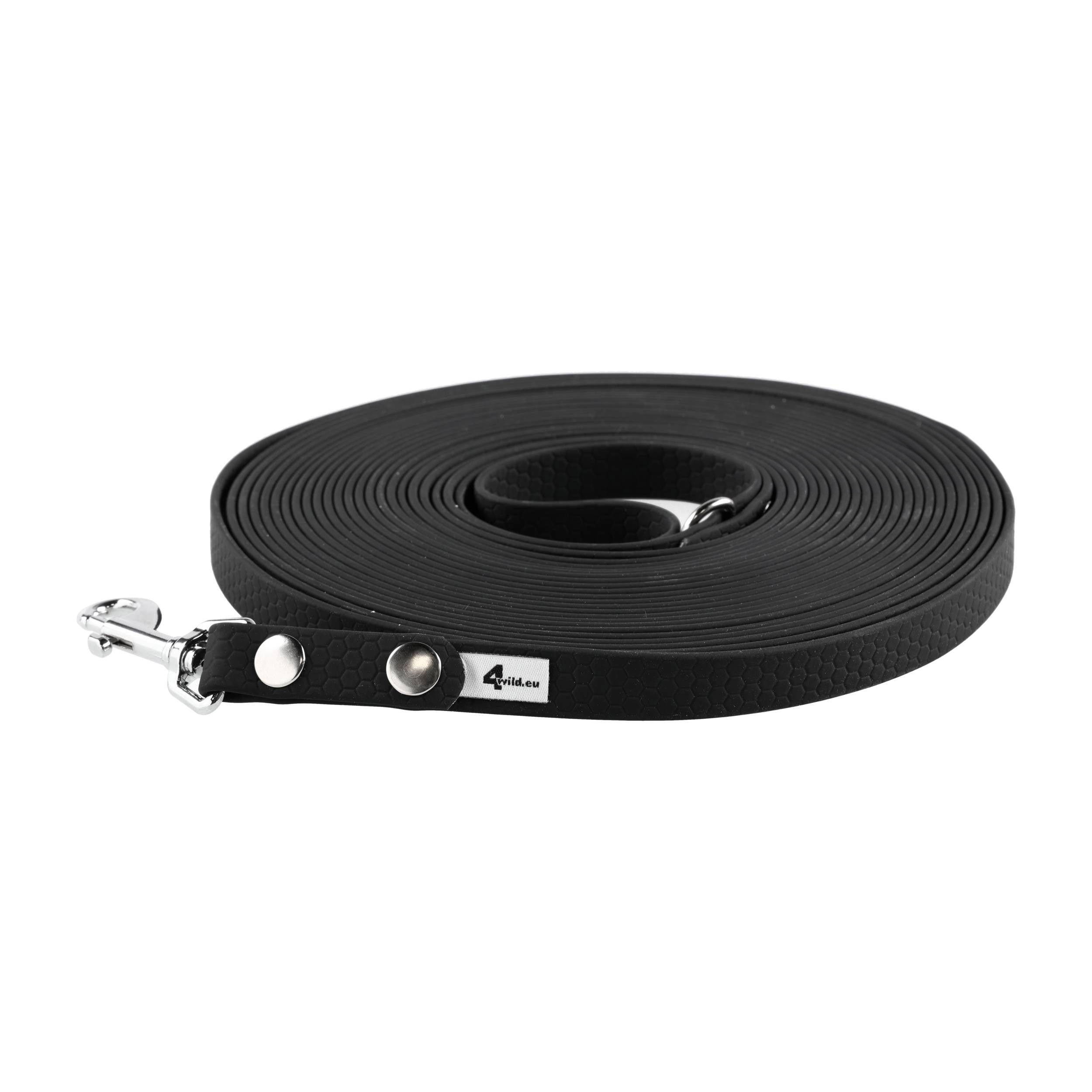 Smycz dla psa BioThane wodoodporna od firmy specjalizującej się w produkcji akcesoriów dla zwierząt 4wild. Smycz została wykonana z taśmy BioThane w czarnym kolorze o szerokości 16 mm i długości 10 m.