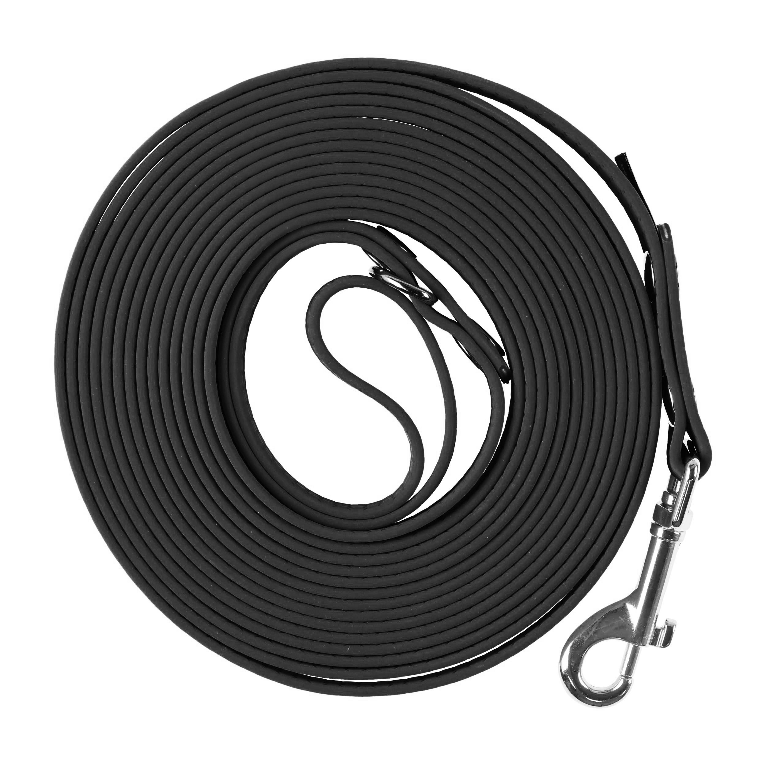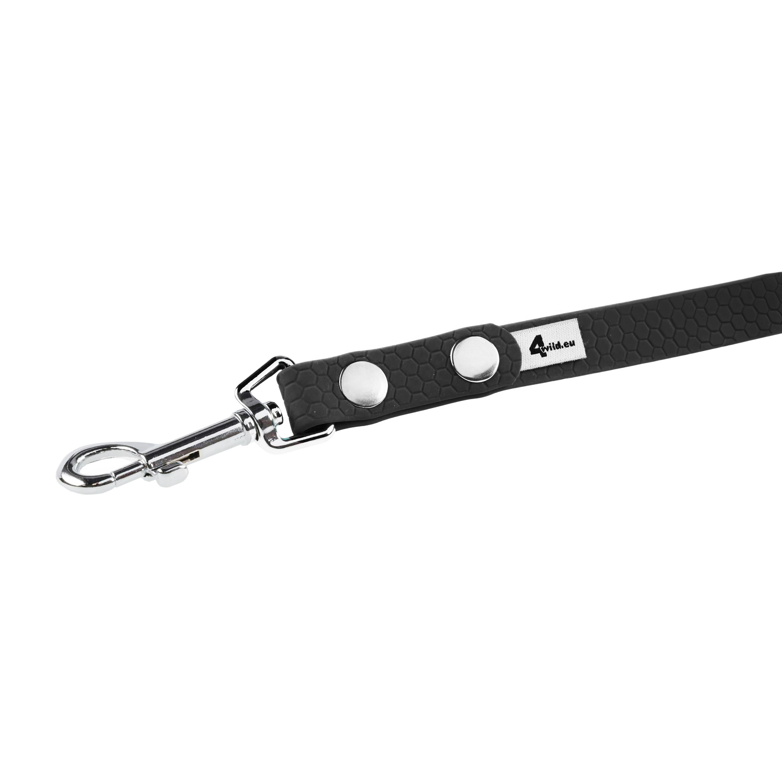 Smycz dla psa BioThane wodoodporna od firmy specjalizującej się w produkcji akcesoriów dla zwierząt 4wild. Smycz została wykonana z taśmy BioThane w czarnym kolorze o szerokości 16 mm i długości 5 m.